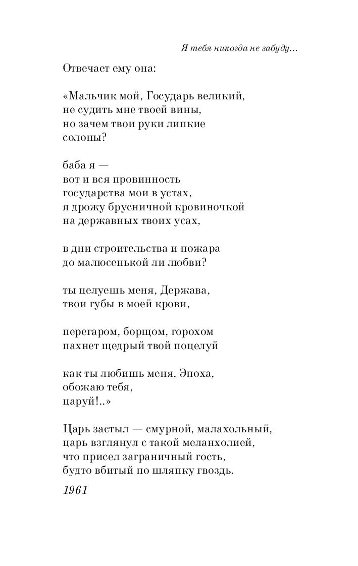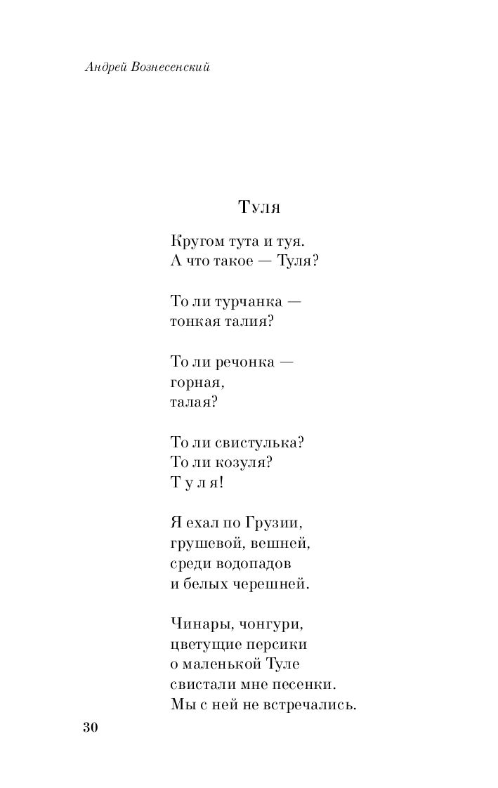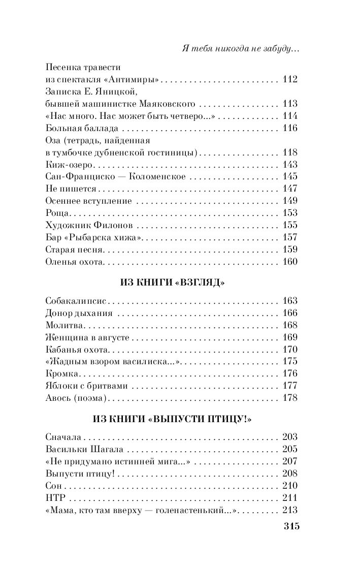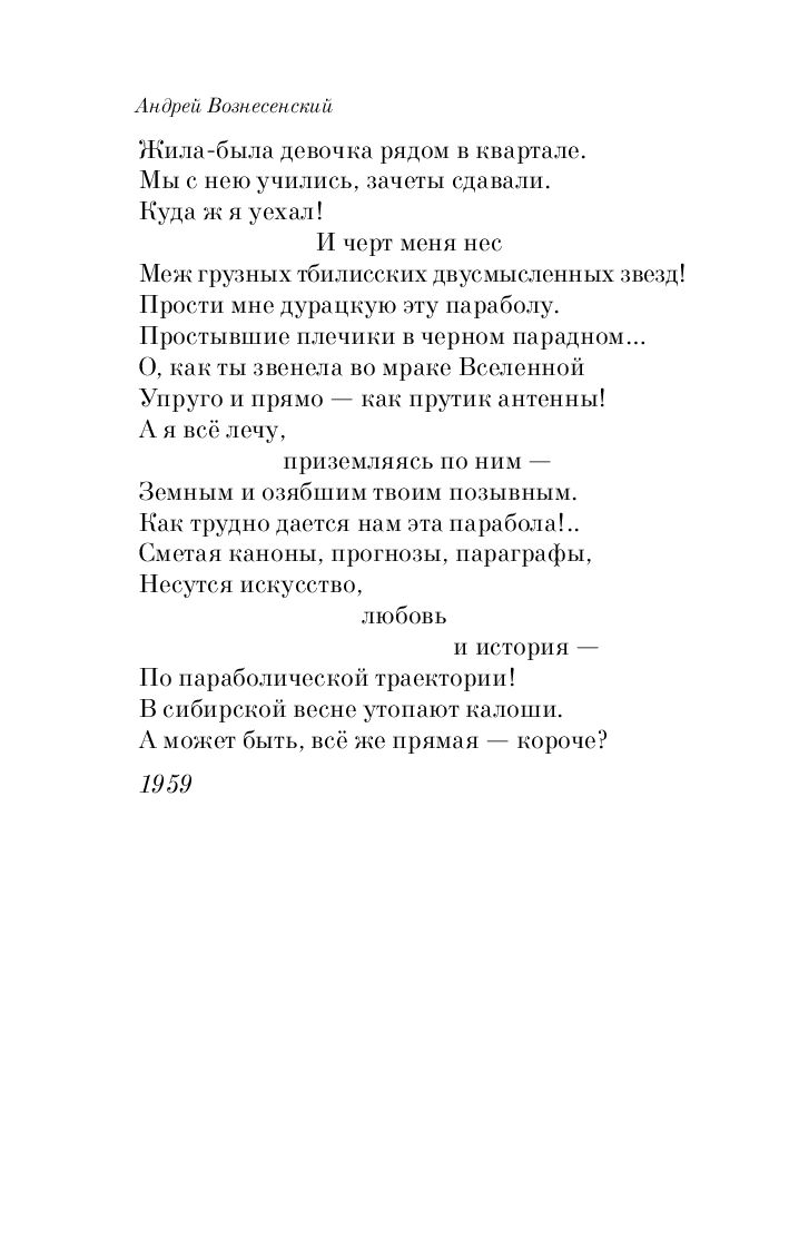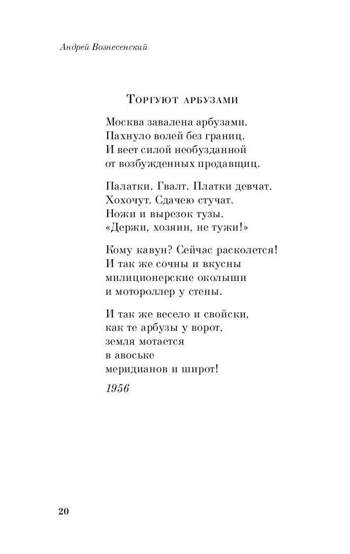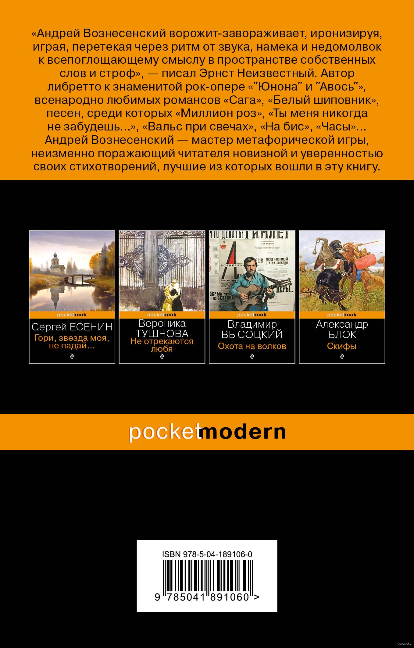 Поэтические озарения Вознесенского вспыхивают в пространстве обыденной жизни, но этим они еще более ценны. Эксперименты в области звуковых метафор, видеом, кругометров не умаляют силы нежного и трагического лиризма поэзии знаменитого "шестидесятника". Автор либретто к знаменитой рок-опере ""Юнона" и "Авось"", всенародно любимых романсов "Сага", "Белый шиповник", песен, среди которых "Миллион роз", "Ты меня никогда не забудешь...", "Вальс при свечах", "На бис", "Часы"...