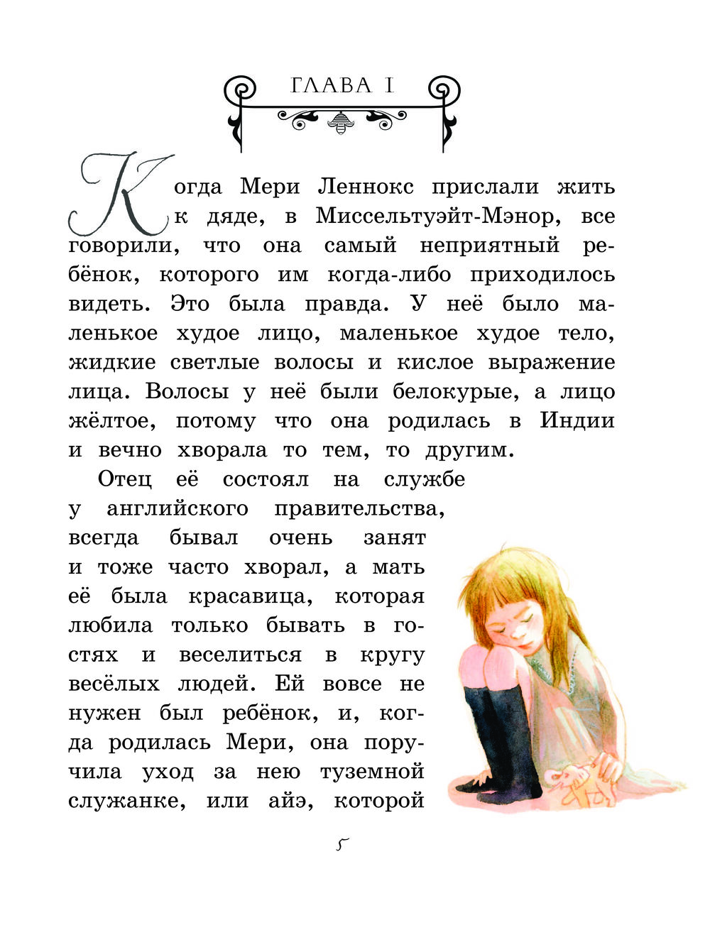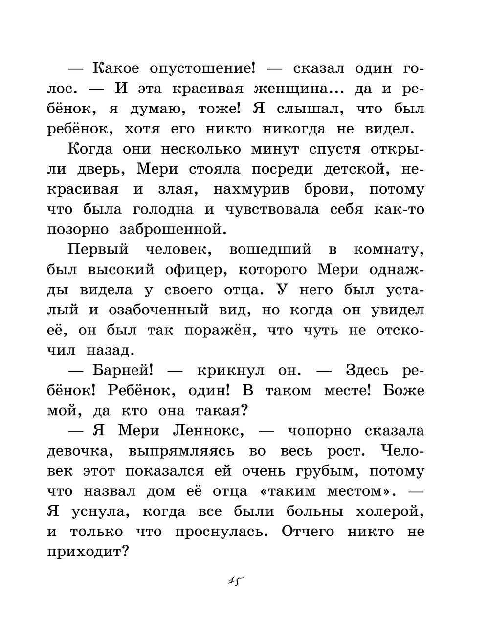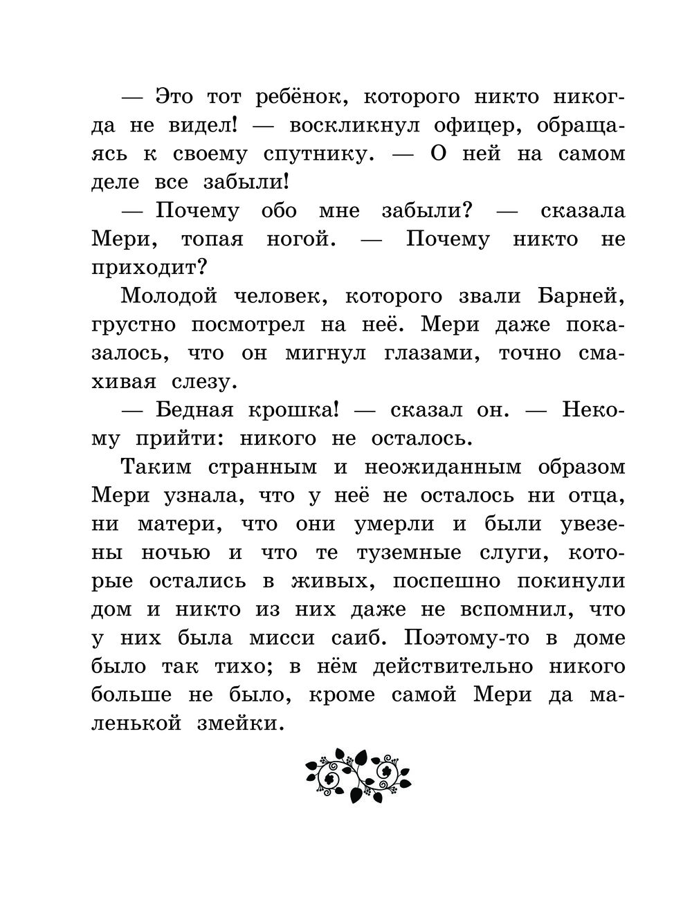 Главная героиня книги – сирота Мэри Ленокс, самая неприятная девочка, которую видел свет. Она оказалась в поместье своего дяди, где единственным развлечением для ребенка становятся прогулки в саду. Там девочка находит старую заросшую калитку. Что за ней скрывается? И почему никому в доме не разрешено ее обсуждать? Маленькой Мэри предстоит это выяснить, а заодно обрести верных друзей и измениться в лучшую сторону.