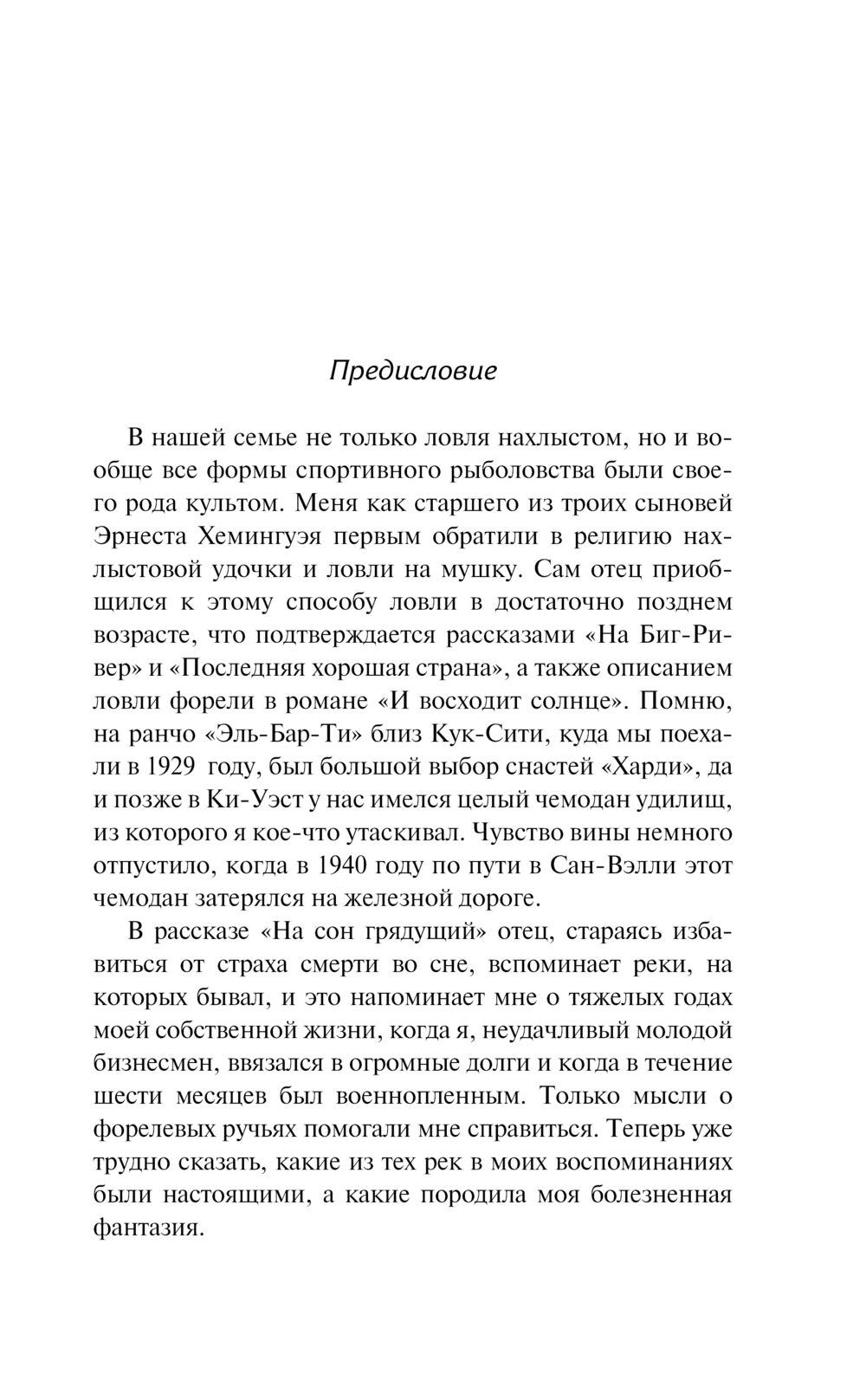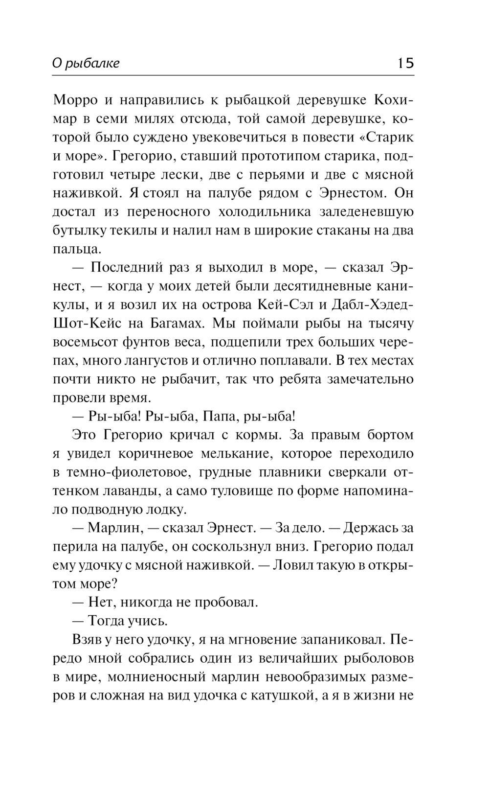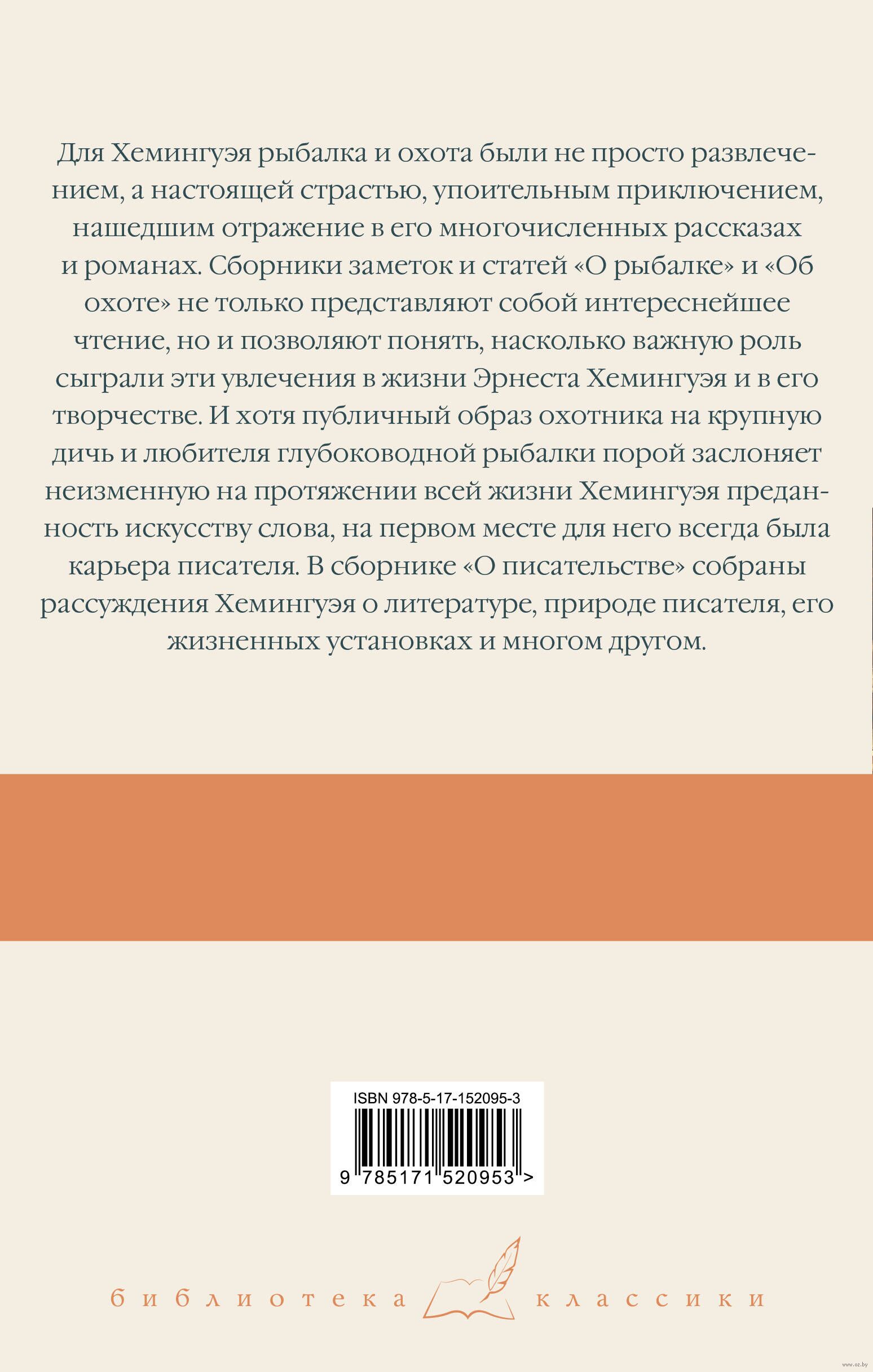 Для Хемингуэя рыбалка и охота были не просто развлечением, а настоящей страстью, упоительным приключением, нашедшим отражение в его многочисленных рассказах и романах. Сборники заметок и статей "О рыбалке" и "Об охоте" не только представляют собой интереснейшее чтение, но и позволяют понять, насколько важную роль сыграли эти увлечения в жизни Эрнеста Хемингуэя и в его творчестве. И хотя публичный образ охотника на крупную дичь и любителя глубоководной рыбалки порой заслоняет неизменную на протяжении всей жизни Хемингуэя преданность искусству слова, на первом месте для него всегда была карьера писателя. В сборнике "О писательстве" собраны рассуждения Хемингуэя о литературе, природе писателя, его жизненных установках и многом другом.