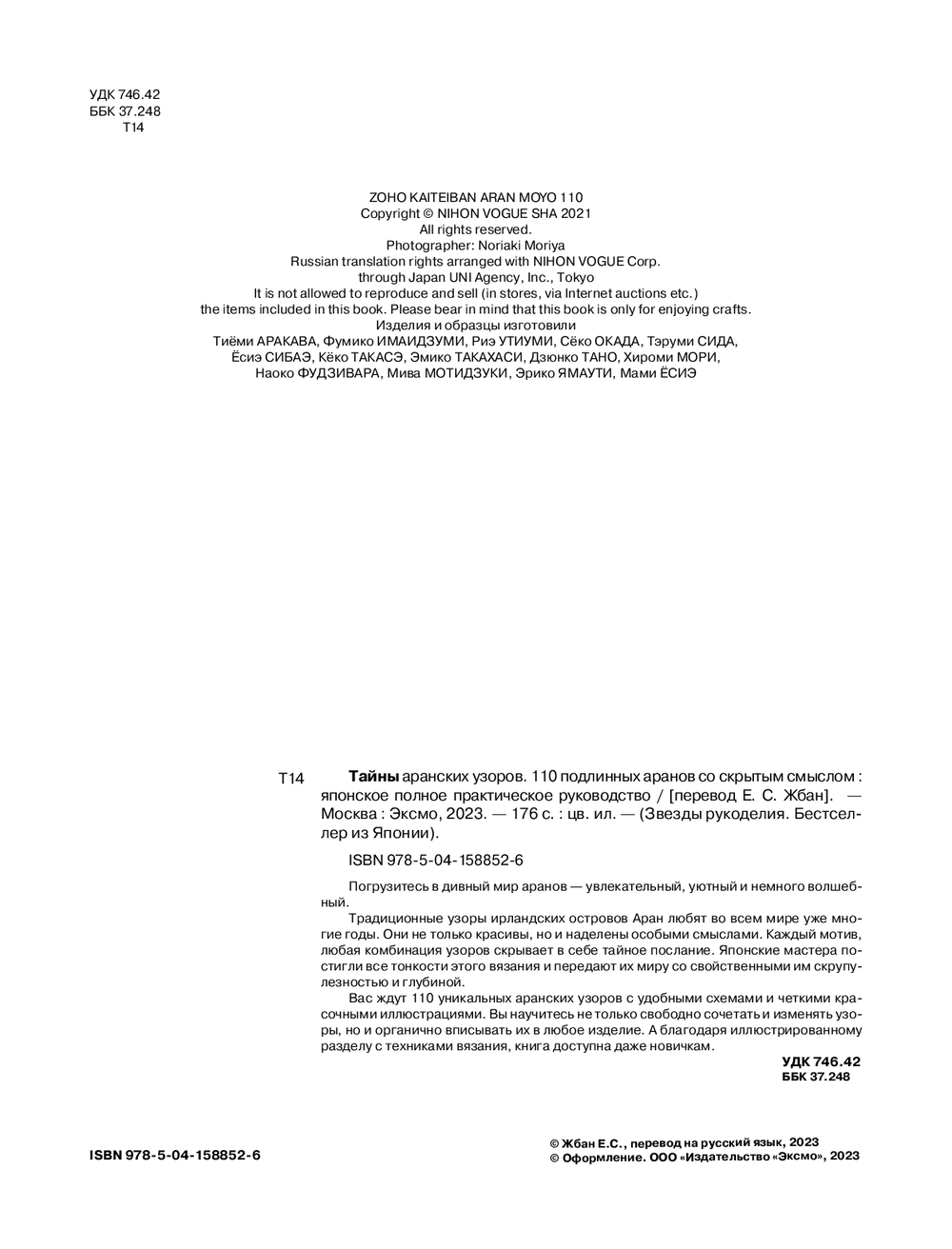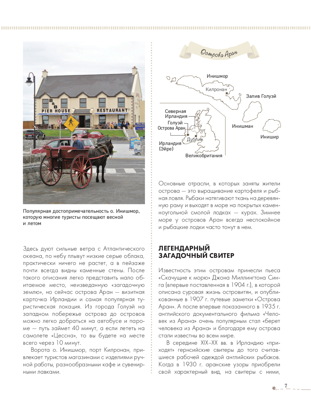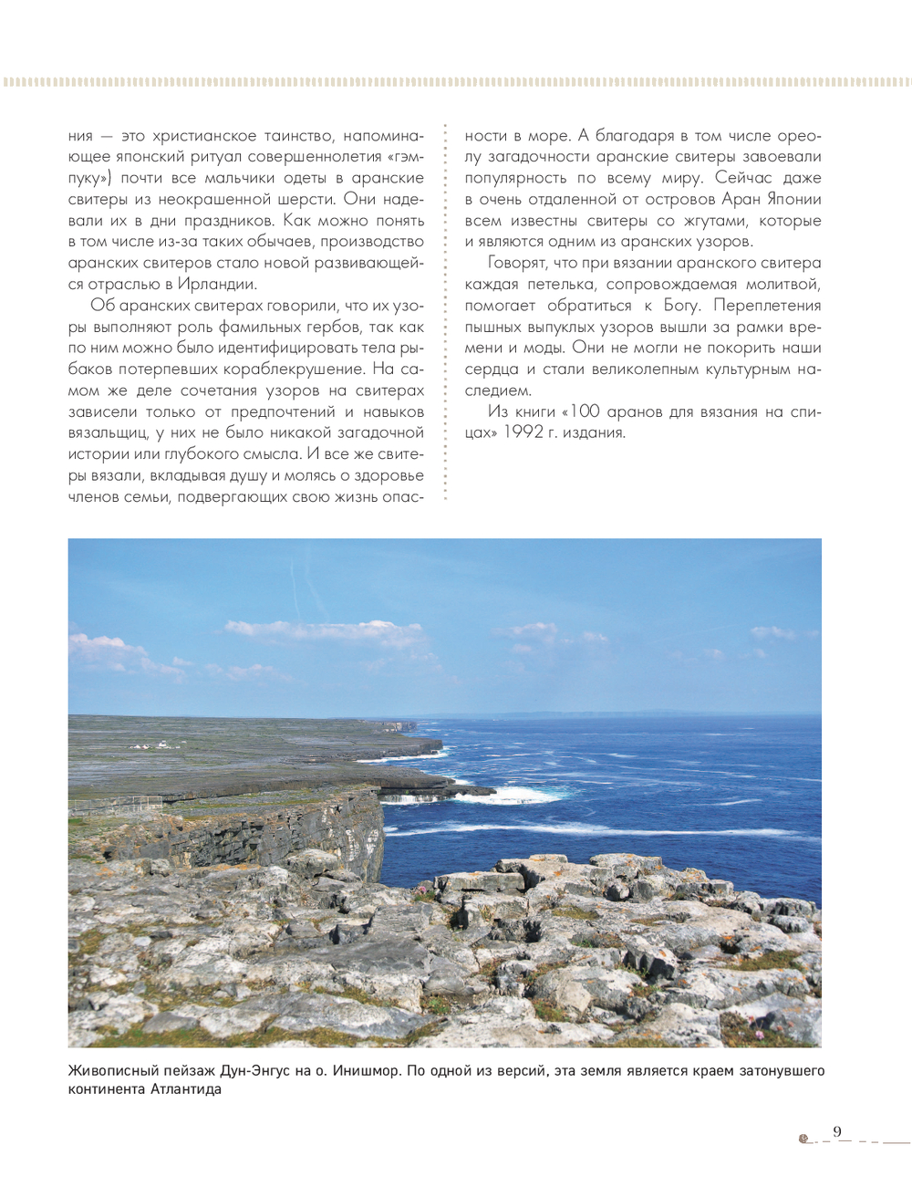 "Глубокое во всех отношениях руководство. Чисто японская интерпретация аранов, пропитанная духом ирландского побережья. "Перевернутая чайка", "Поцелуй камня Красноречия", "Жемчужный узор" – настоящая поэзия пряжи!" – Юрие Мита, модельер.