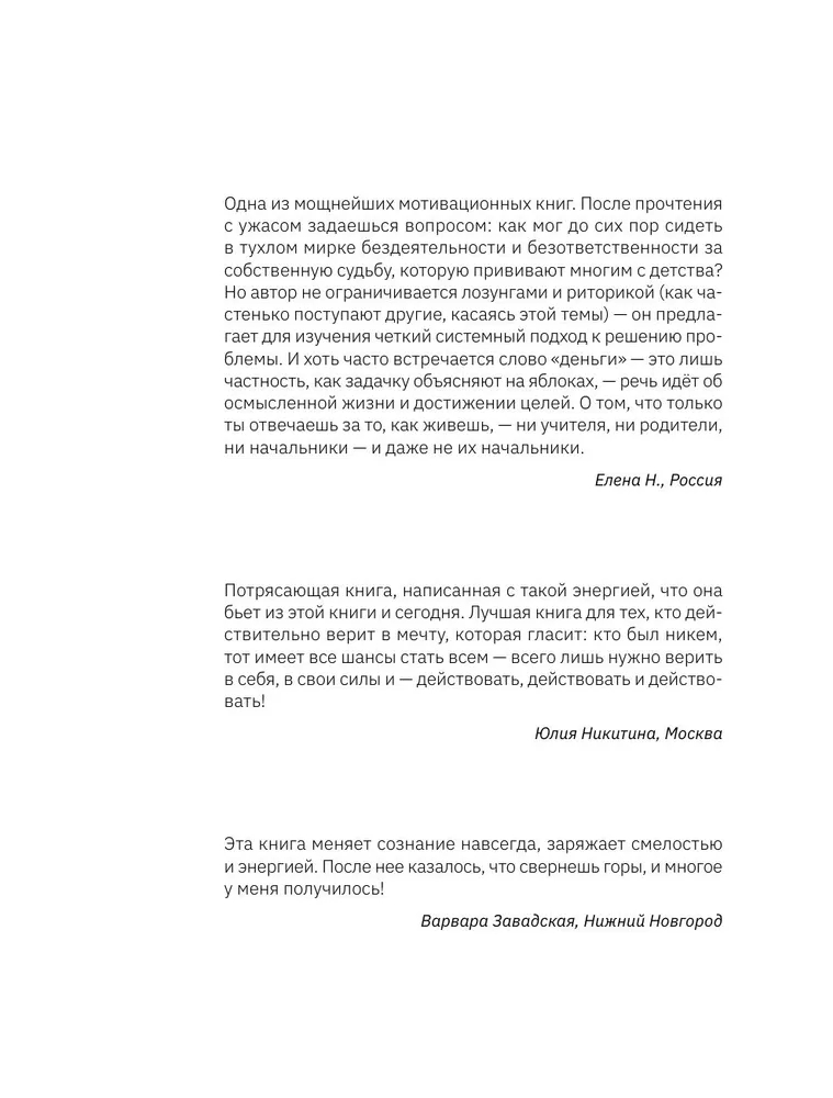 Вы узнаете, что делают самые богатые люди планеты, чего не делают остальные; как приобрести, сохранить и приумножить благосостояние; как сделать карьеру; как открыть свой бизнес; как общаться с людьми, убеждать их, превращать в союзников и вести за собой; как создать команду, которая будет рваться к победе; как не сдаваться и идти вперед, преодолевать трудности и добиваться цели – как жить полной жизнью и достигать максимума своих возможностей, превращая мечты в реальность.