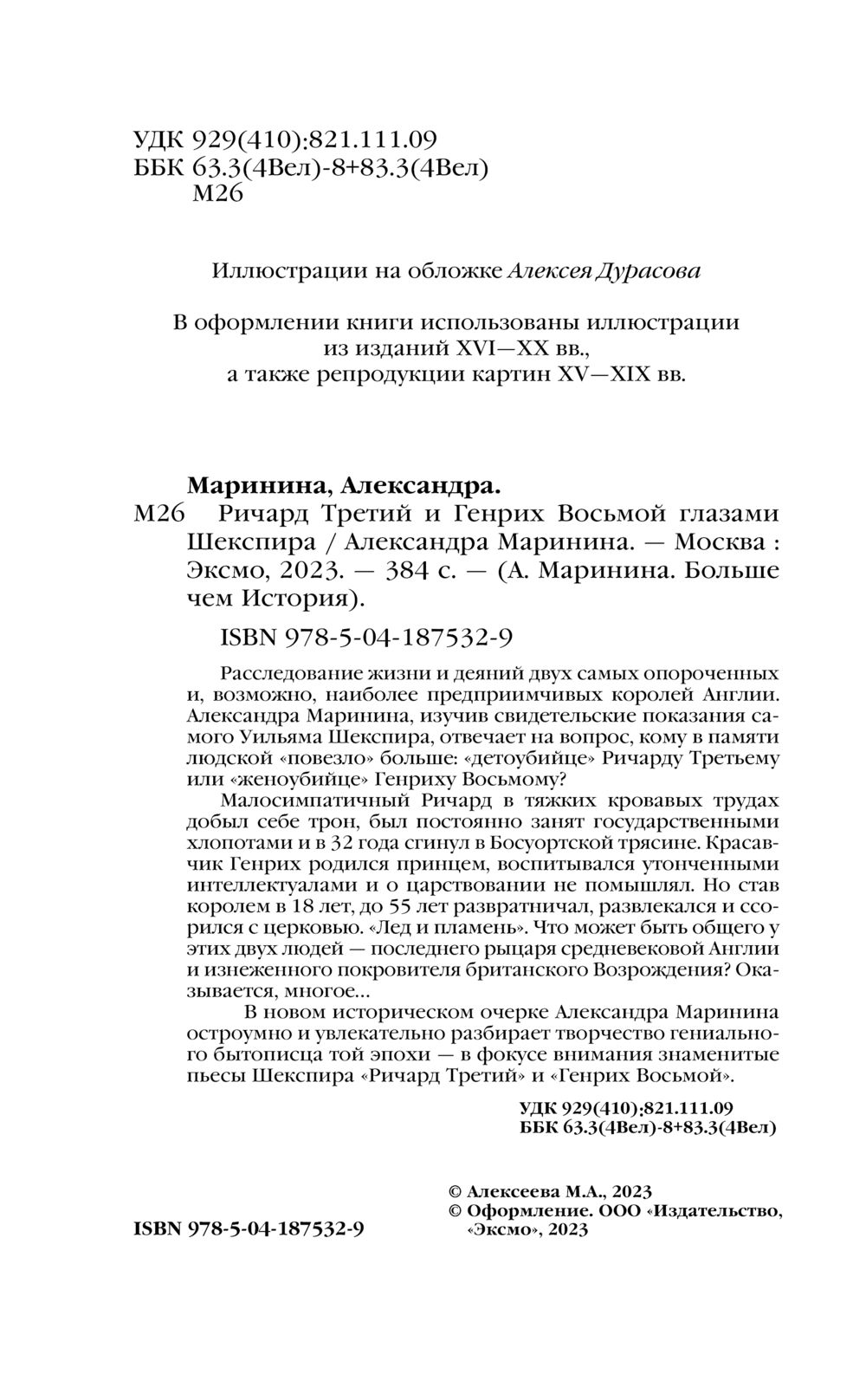 Расследование жизни и деяний двух самых опороченных и, возможно, наиболее предприимчивых королей Англии. Александра Маринина, изучив свидетельские показания самого Уильяма Шекспира, отвечает на вопрос, кому в памяти людской "повезло" больше: "детоубийце" Ричарду Третьему или "женоубийце" Генриху Восьмому?