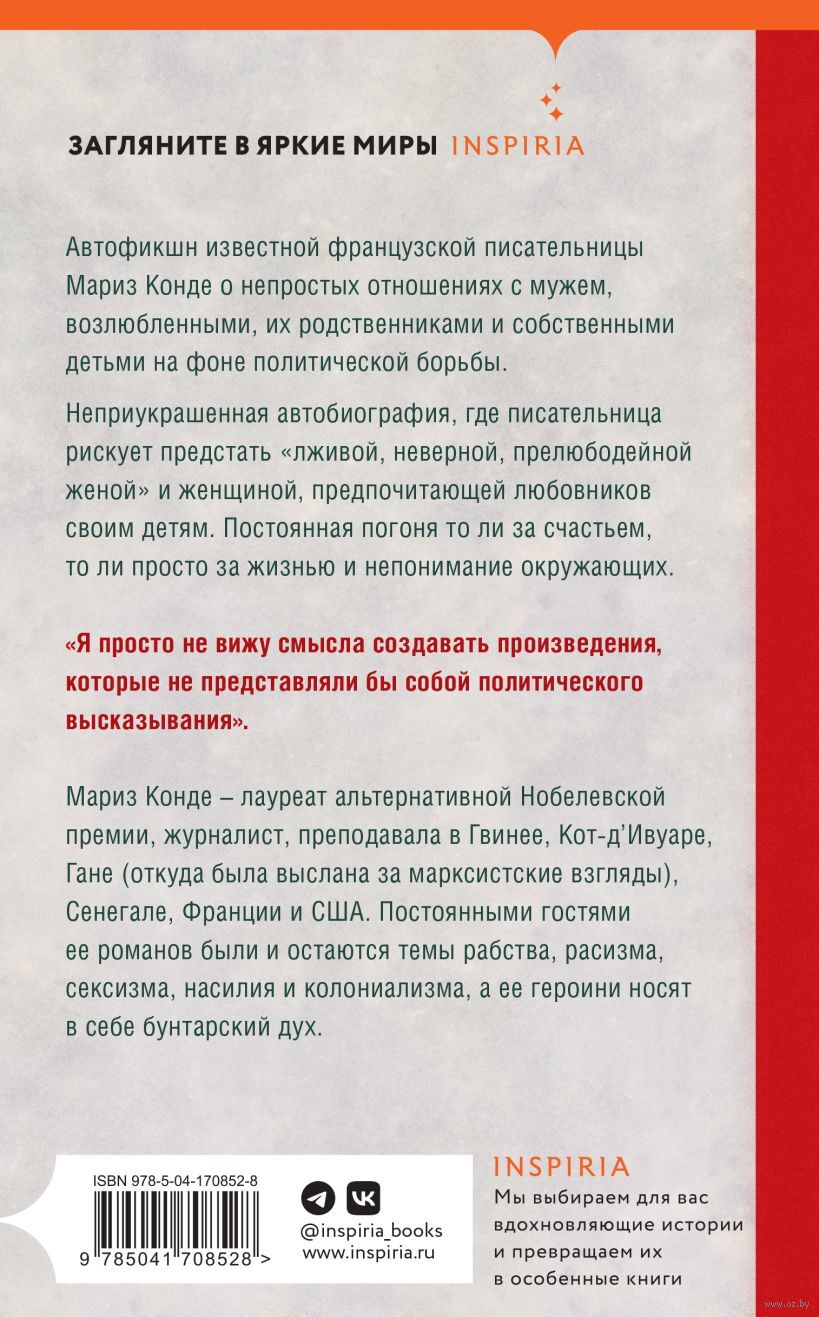 Автофишкн известной французской писательницы Мариз Конде о непростых отношениях с мужем, возлюбленными, их родственниками и собственными детьми на фоне политической борьбы.