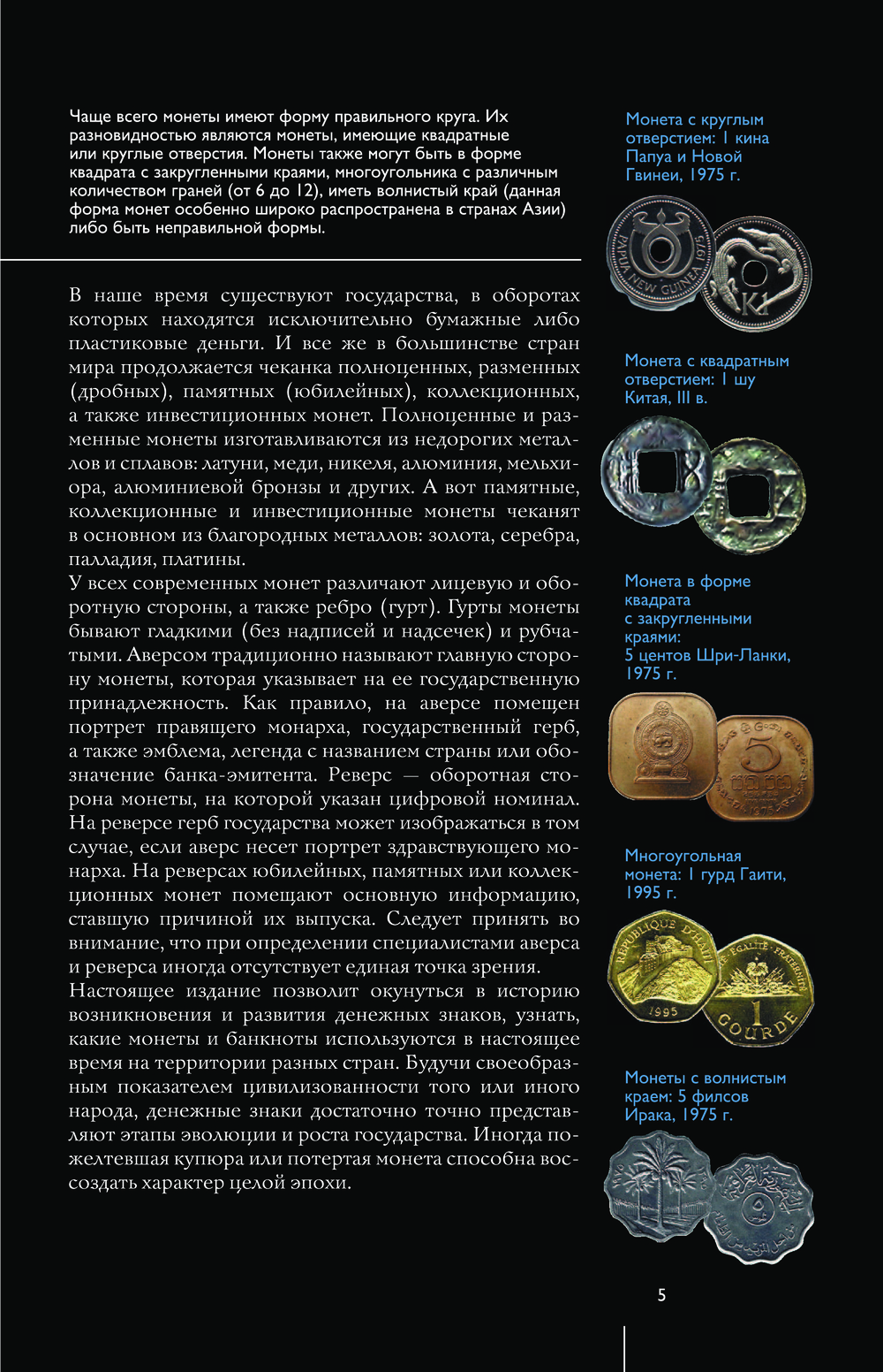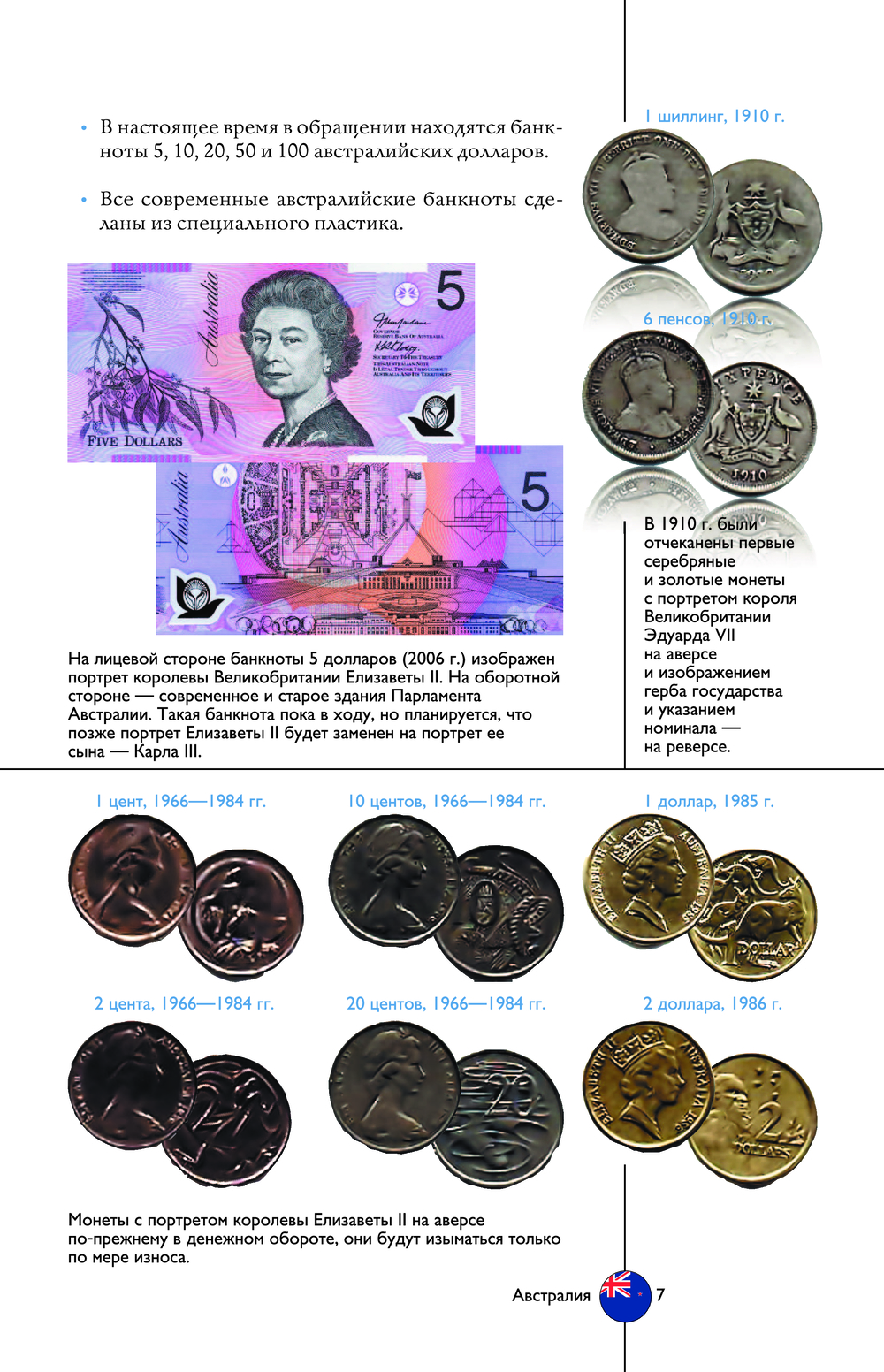 Из этого иллюстрированного гида вы узнаете о денежных единицах разных стран мира. Какова история возникновения и развития денежных знаков? Что изображено на реверсах и аверсах монет? Из каких материалов изготавливают монеты и банкноты и где их чеканят и печатают? Какие деньги сейчас в обращении в разных странах мира?