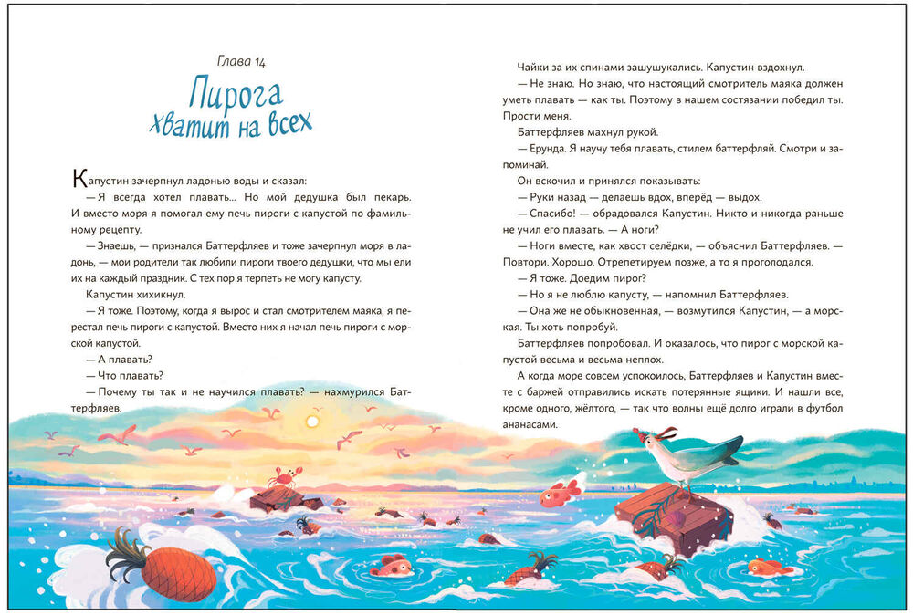 Книга "Капустин, Баттерфляев и два маяка" – это история о двух маяках, маленьком и большом, и о двух смотрителях-соседях. Первый, Капустин, печёт пироги с морской капустой, а второй, Баттерфляев, признает только бутерброды с селёдкой. Первый не умеет плавать, а второй плавает как рыба. Как двум смотрителям ужиться на одном острове и решить, кто из них зажжёт свой маяк?