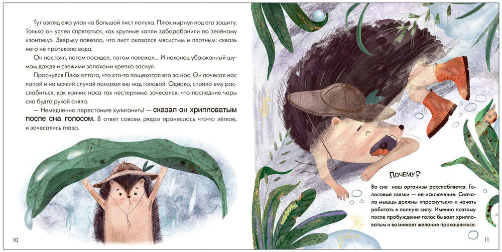 Однажды во время прогулки по лесу ёжик Плюх познакомился с Капелькой. Но внезапно она исчезла! Встреча с прекрасным всегда оставляет след. Ёжик Плюх, как настоящий романтик и начинающий натуралист, непременно хочет раскрыть тайну исчезновения новой подруги. Трогательная сказка дополнена научными фактами о том, как вести себя в лесу во время дождя, как происходит круговорот воды в природе и т.д. А также наглядными сюжетными иллюстрациями.