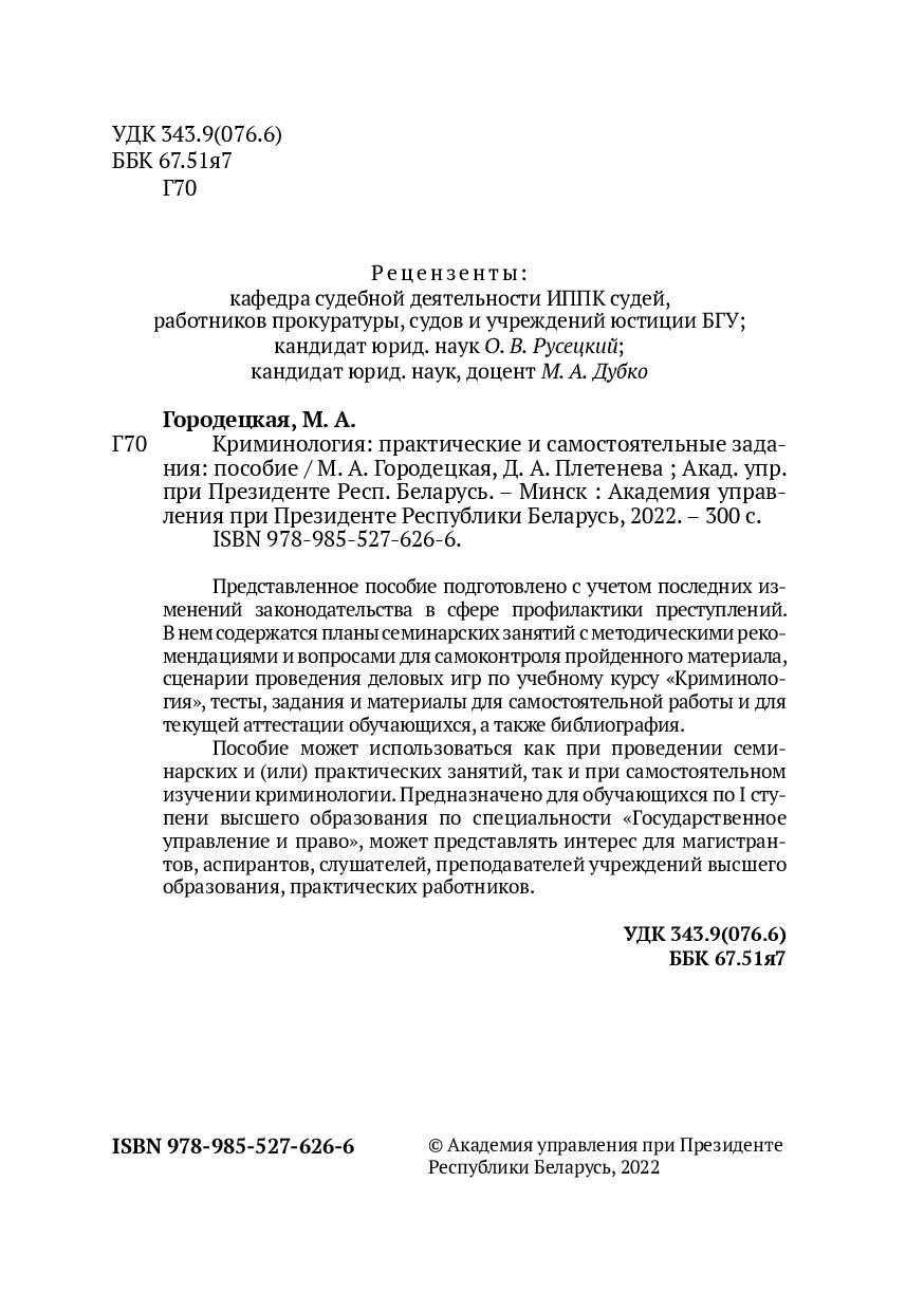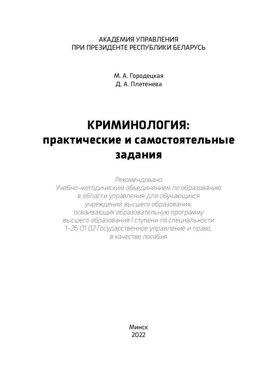 Пособие может использоваться как при проведении семинарских и (или) практических занятий, так и при самостоятельном изучении криминологии. Предназначено для обучающихся по I ступени высшего образования по специальности "Государственное управление и право", может представлять интерес для магистрантов, аспирантов, слушателей, преподавателей учреждений высшего образования, практических работников.