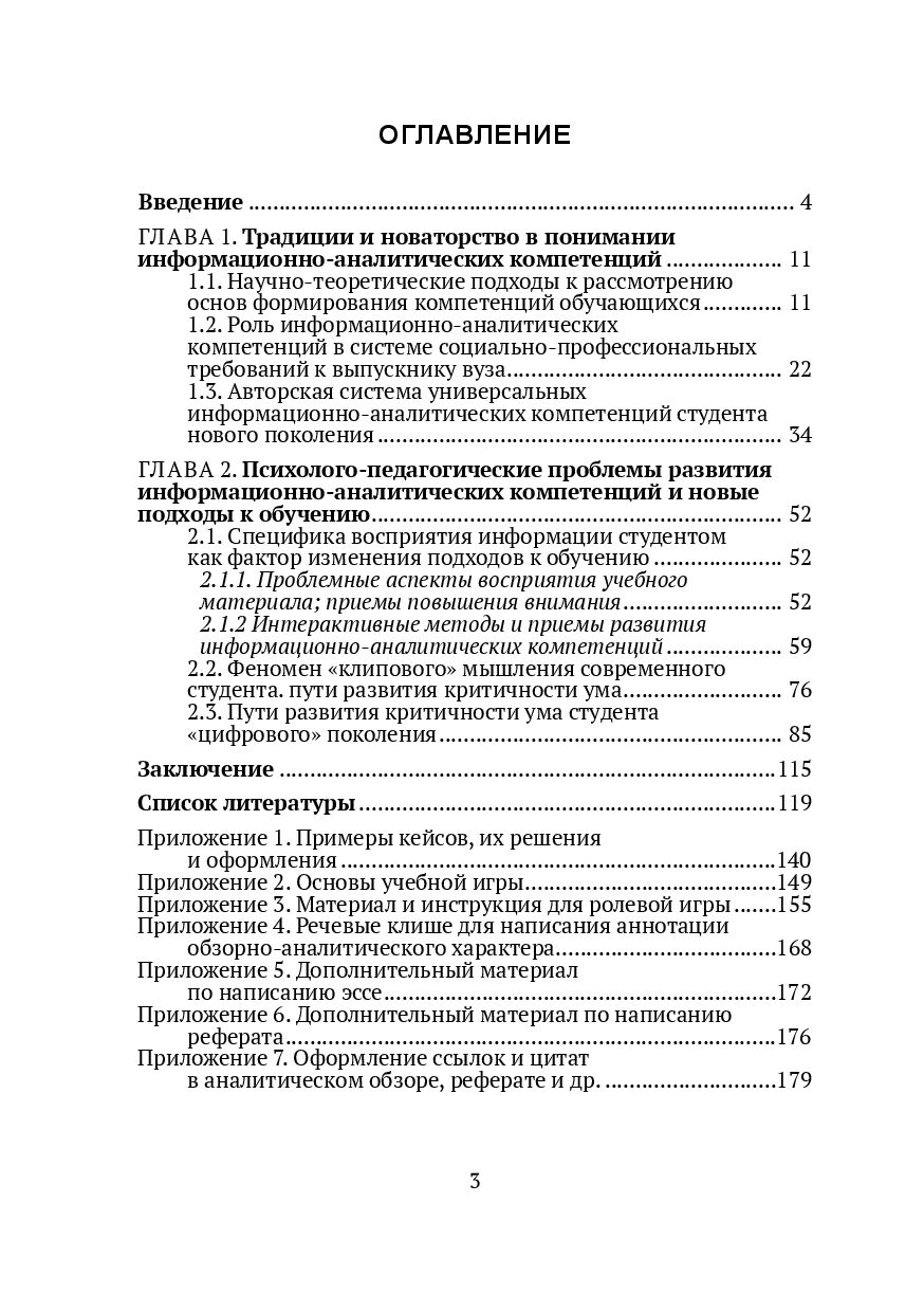 В монографии дано научное обоснование необходимости пересмотра подходов к пониманию и развитию информационно-аналитических компетенций студентов нового "цифрового" поколения. Отражены общие научные подходы к проблеме развития компетенций студентов, описана роль информационно-аналитических умений в системе социально-профессиональной готовности выпускника высшего учебного заведения к требованиям работодателей. Подробно рассмотрены причины и суть изменений в когнитивной сфере современных студентов, их последствия для обучения и контроля образовательных результатов.