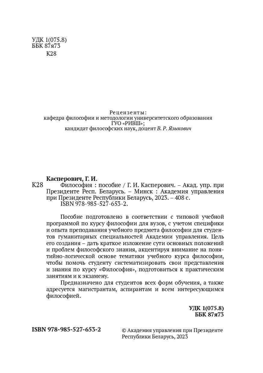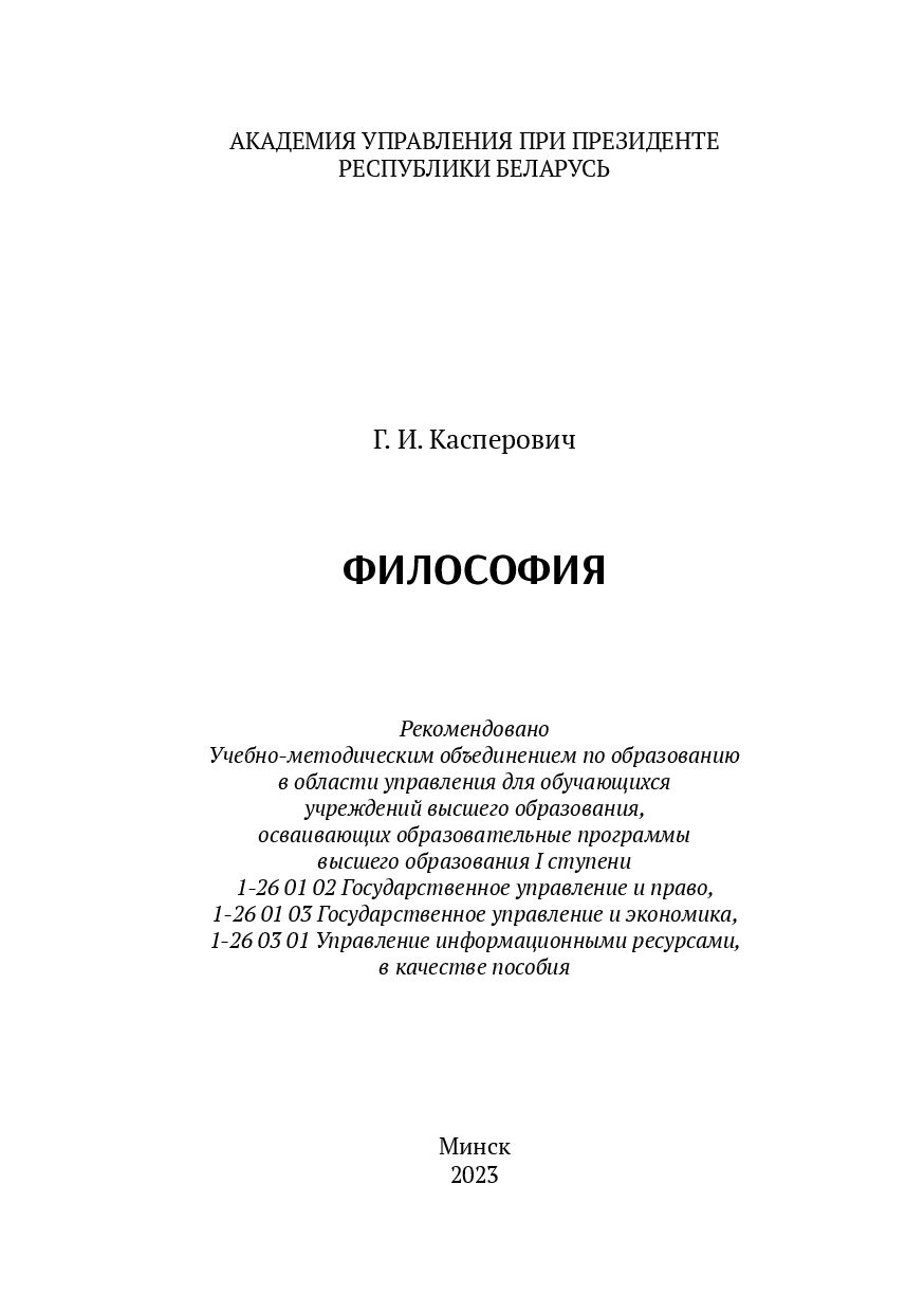 Пособие подготовлено в соответствии с типовой учебной программой по курсу философии для вузов, с учетом специфики и опыта преподавания учебного предмета философии для студентов гуманитарных специальностей Академии управления. Цель его создания – дать краткое изложение сути основных положений и проблем философского знания, акцентируя внимание на понятийно-логической основе тематики учебного курса философии, чтобы помочь студенту систематизировать свои представления и знания по курсу "Философия", подготовиться к практическим занятиям и к экзамену.