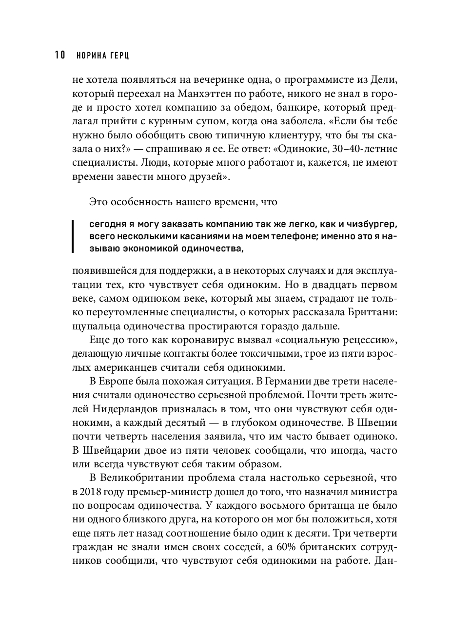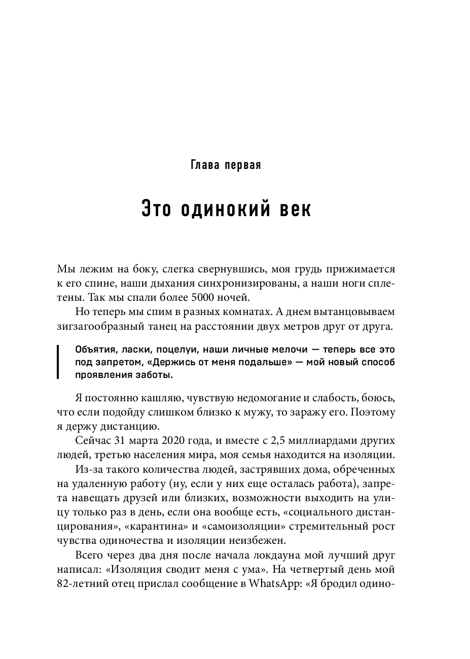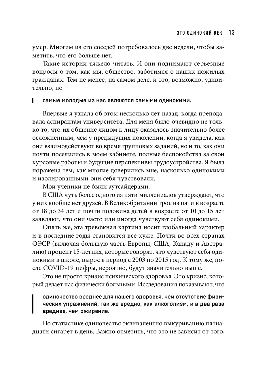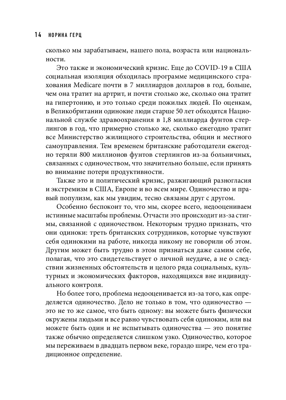 Эта книга не столько об эмоциональной боли, которую мы называем одиночеством, сколько о фрагментации сообщества. Известный академик и телеведущая – Норина Герц выдвигает широкий и убедительный аргумент в пользу того, что наш образ жизни сейчас глубоко раздроблен – упущены многие случайные и более глубокие человеческие связи, которые раньше были обычным явлением. Мы не созданы для изоляции. Одиночество наносит поразительный вред нашему здоровью.