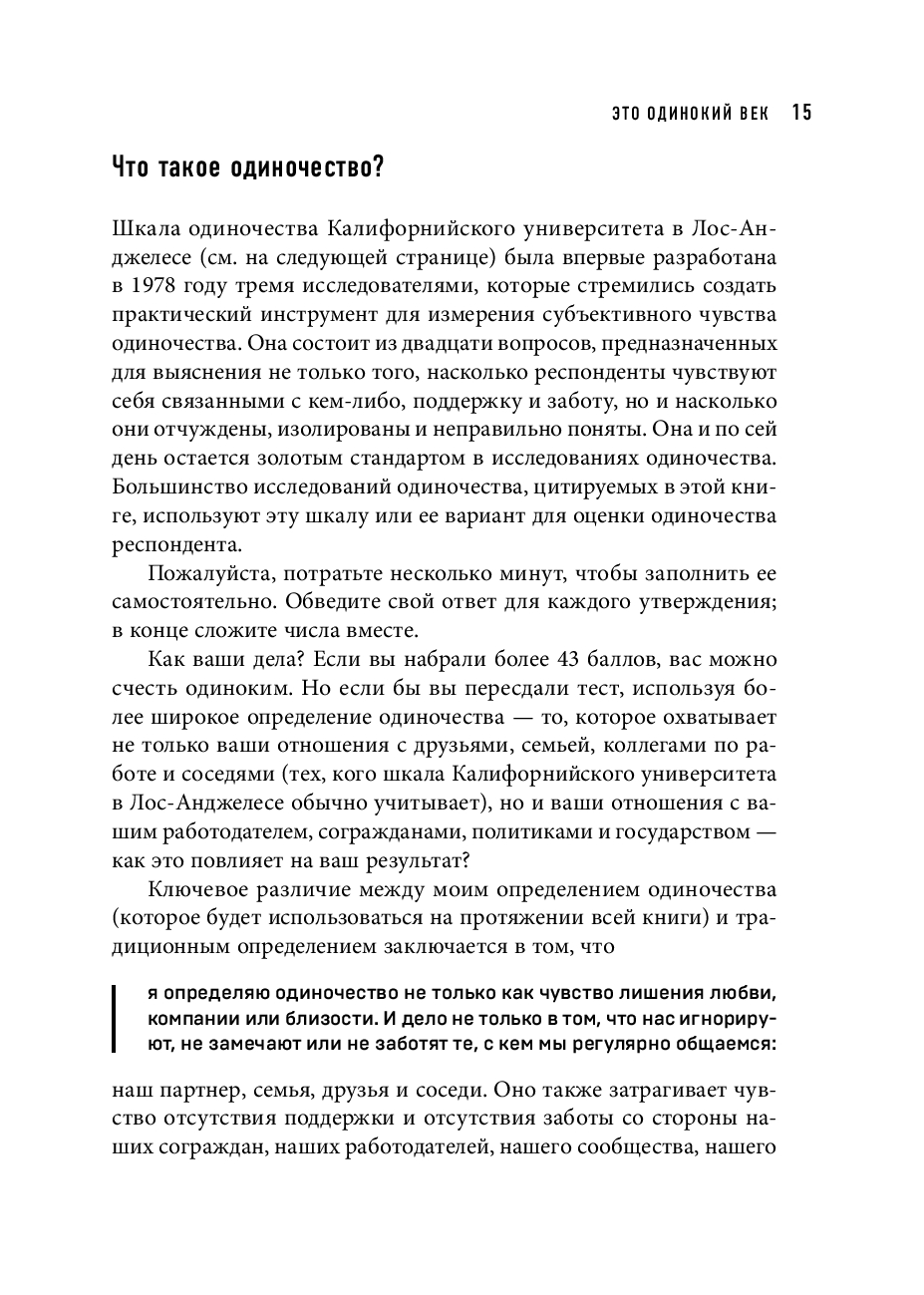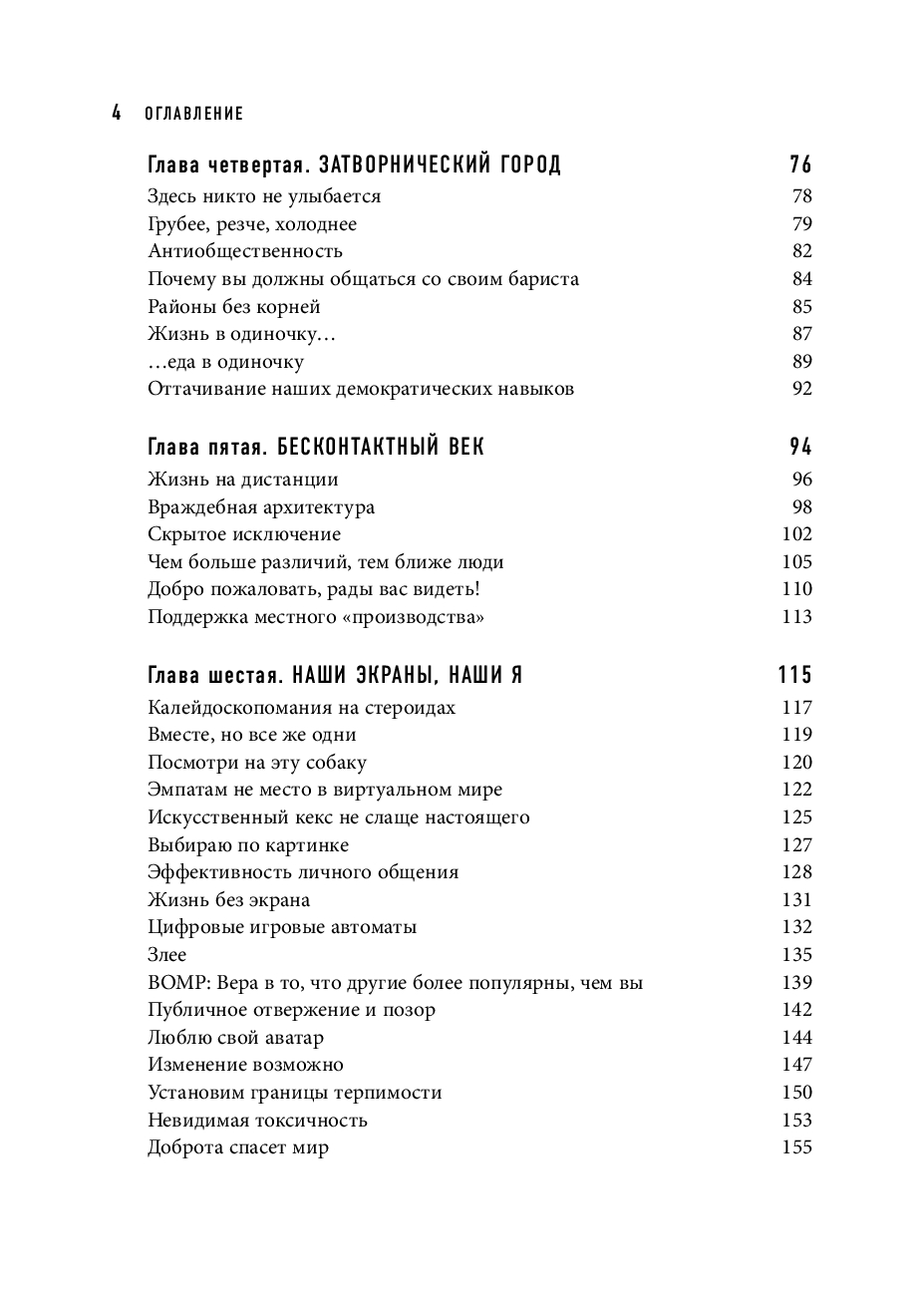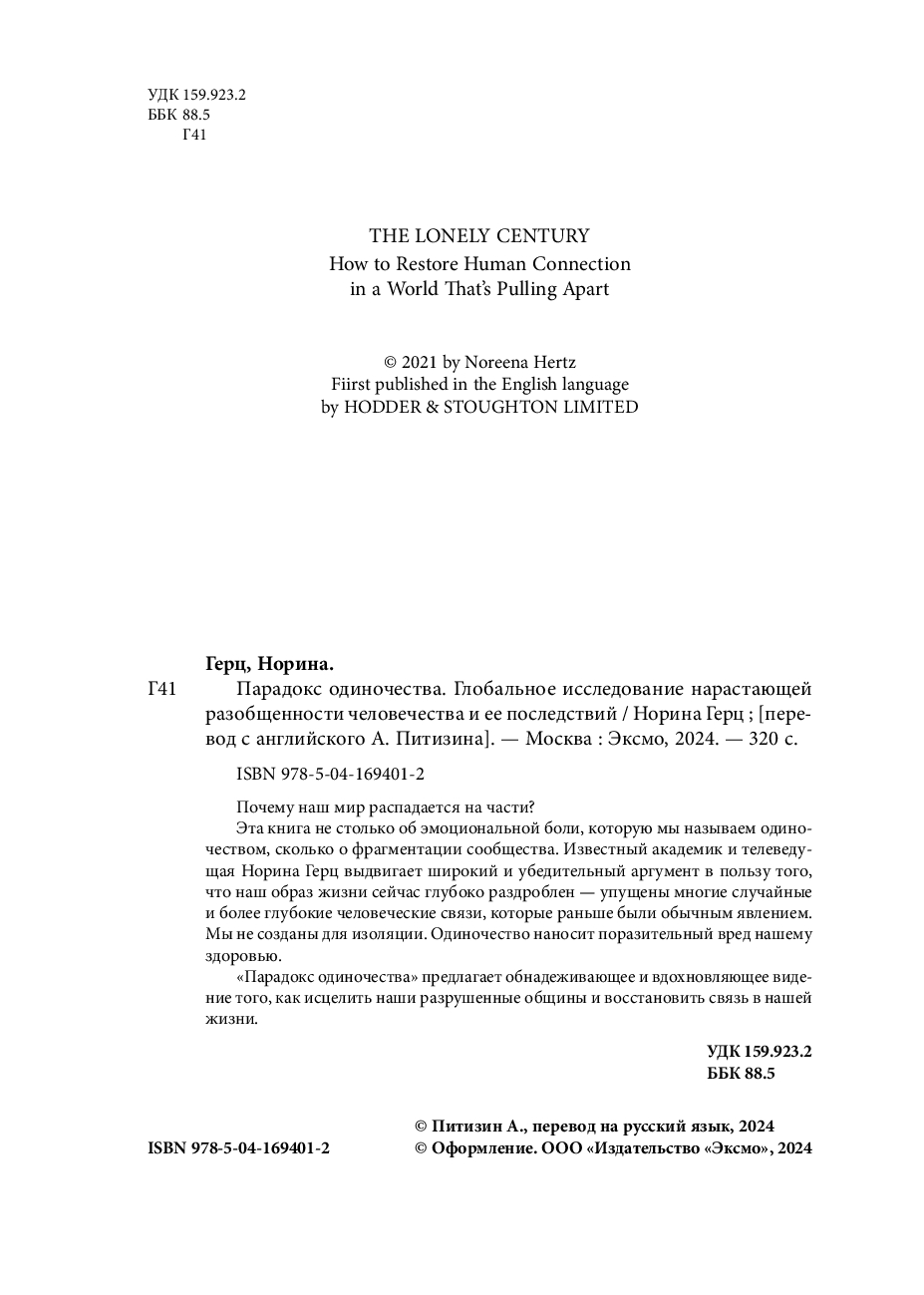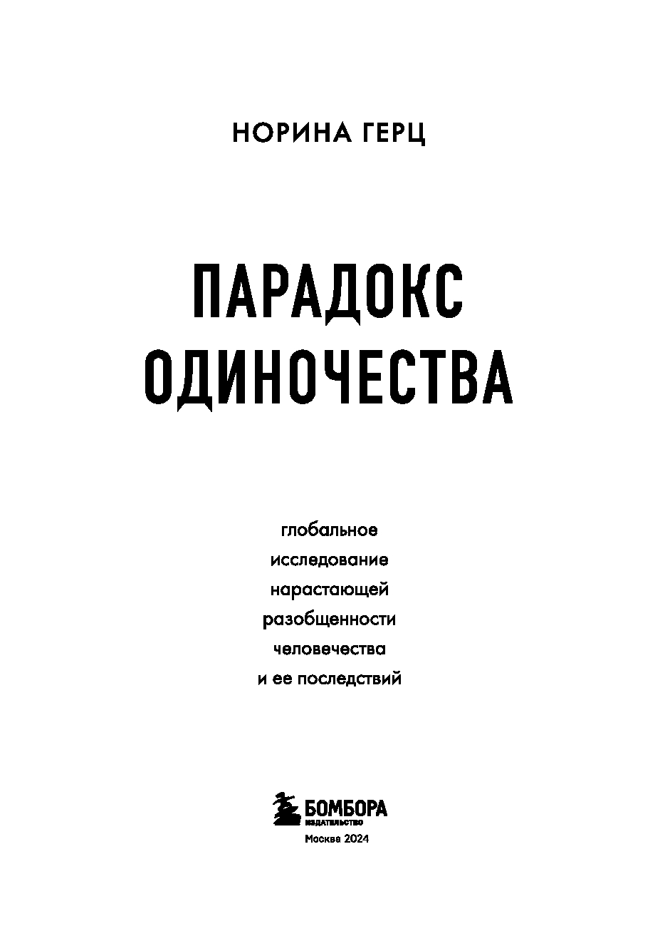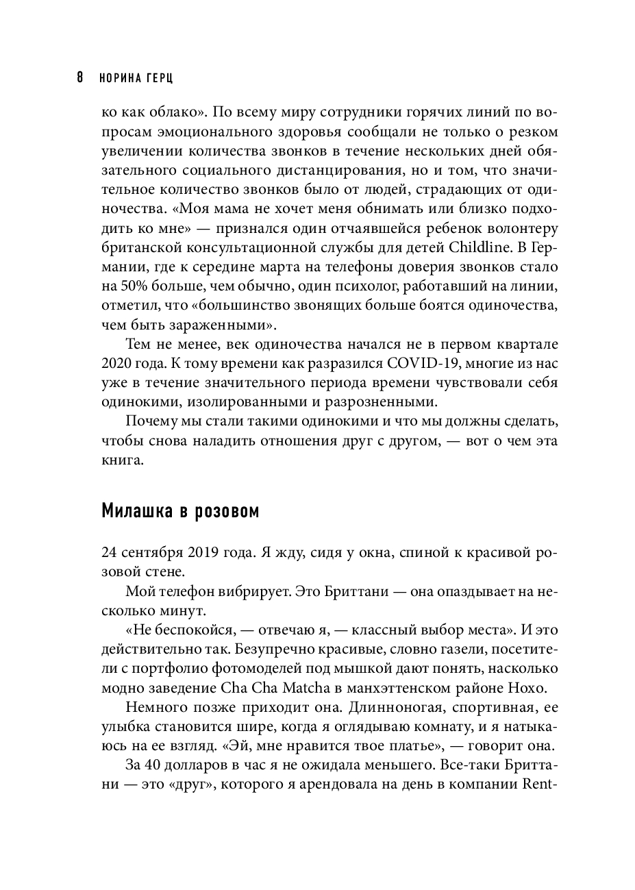 Эта книга не столько об эмоциональной боли, которую мы называем одиночеством, сколько о фрагментации сообщества. Известный академик и телеведущая – Норина Герц выдвигает широкий и убедительный аргумент в пользу того, что наш образ жизни сейчас глубоко раздроблен – упущены многие случайные и более глубокие человеческие связи, которые раньше были обычным явлением. Мы не созданы для изоляции. Одиночество наносит поразительный вред нашему здоровью.