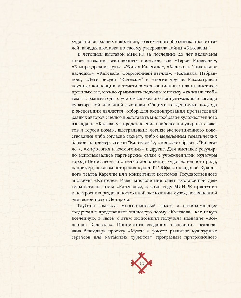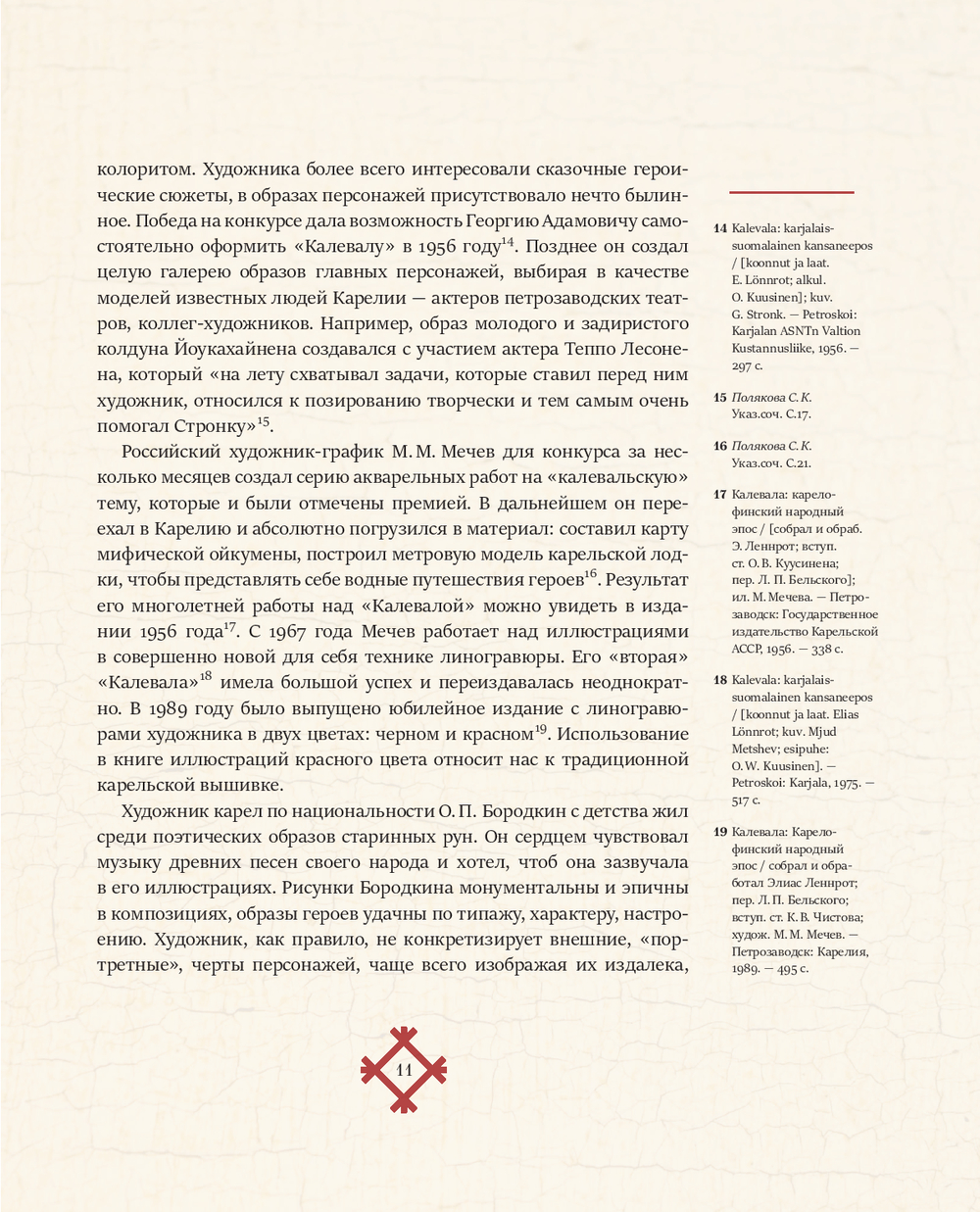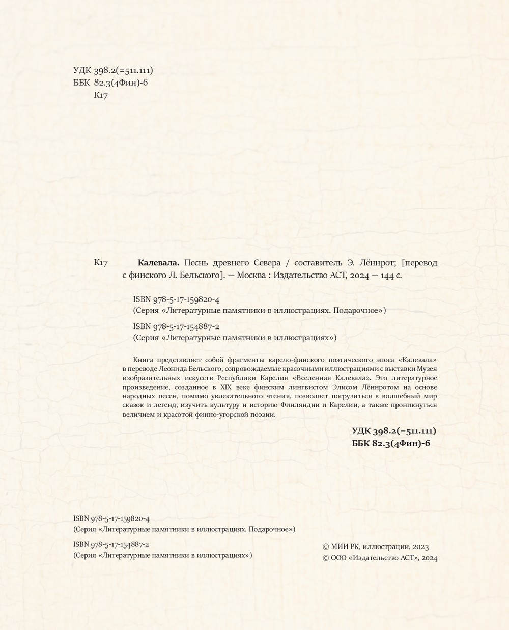 Книга представляет собой фрагменты карело-финского поэтического эпоса "Калевала" в переводе Леонида Бельского, сопровождаемые красочными иллюстрациями с выставки Музея изобразительных искусств Республики Карелия "Вселенная Калевала". Это литературное произведение, созданное в XIX веке финским лингвистом Элисом Лённротом на основе народных песен, помимо увлекательного чтения, позволяет погрузиться в волшебный мир сказок и легенд, изучить культуру и историю Финляндии и Карелии, а также проникнуться величием и красотой финно-угорской поэзии.