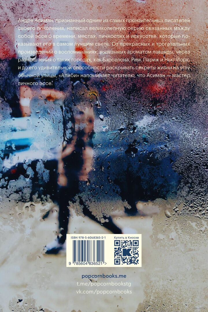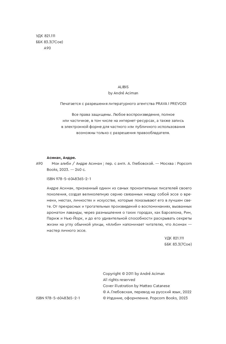 Андре Асиман, признанный одним из самых пронзительных писателей своего поколения, написал великолепную серию связанных между собой эссе о времени, местах, личностях и искусстве, которые показывают его в лучшем свете. От прекрасных и трогательных произведений о воспоминаниях, вызванных ароматом лаванды, через размышления о таких городах, как Барселона, Рим, Париж и Нью-Йорк, и до его удивительной способности раскрывать секреты жизни на углу обычной улицы, "Алиби" напоминает читателю, что Асиман – мастер личного эссе.