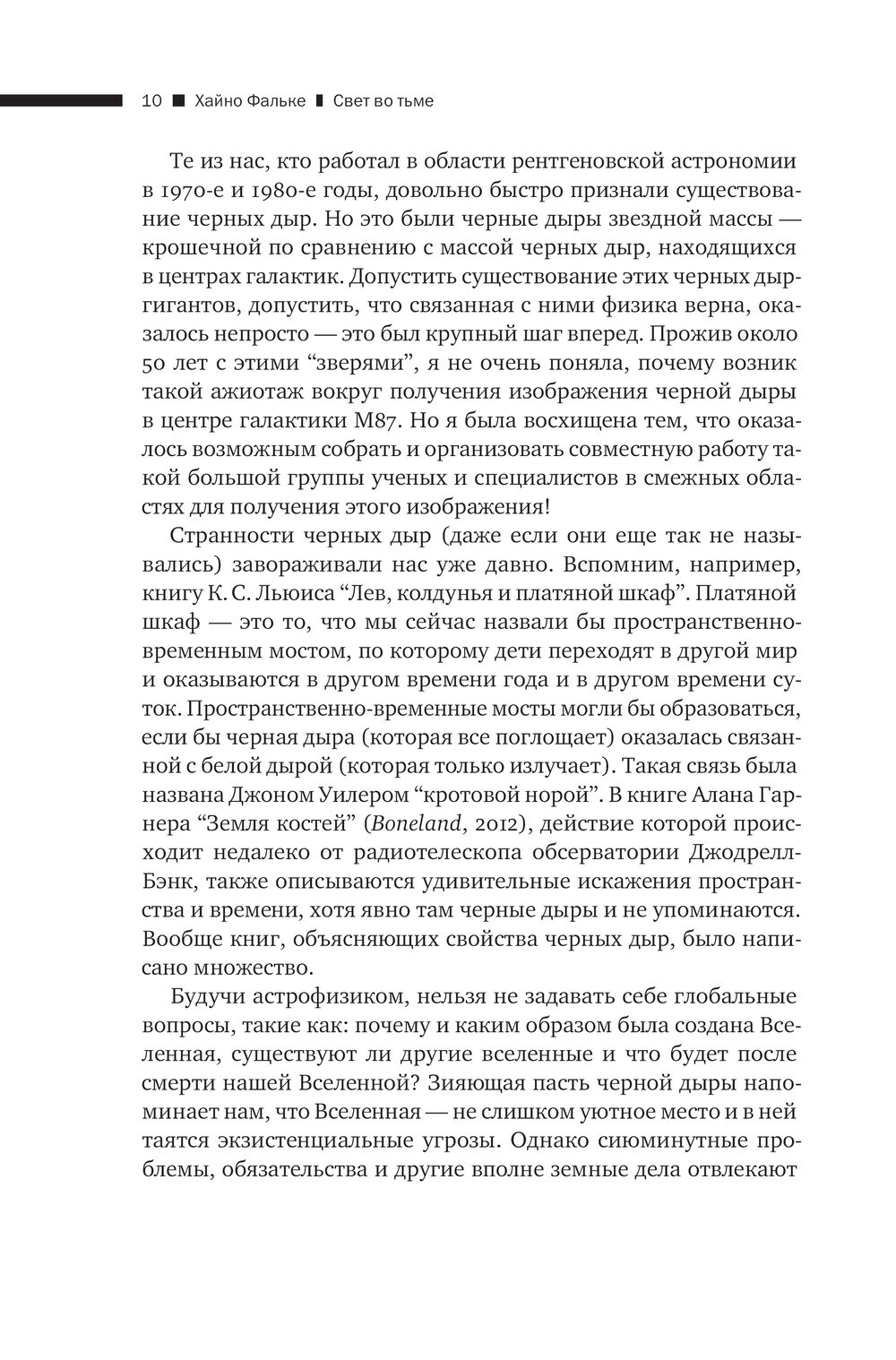 Читатель "Света во тьме" узнает, как группа ученых-энтузиастов сначала убедила распределителей ресурсов (денег, радиотелескопов, мощных компьютеров) выделить на задуманный проект достаточное их количество, а затем провела наблюдения, проанализировала данные и получила долгожданное изображение. "Мифическое существо космических размеров обрело форму и цвет, и каждый человек смог его увидеть", – подытоживает Фальке. Он занимался этим проектом более двадцати лет, и его, верующего христианина, пастора-мирянина, не пугало, что многие именуют черные дыры "вратами ада", ведь цель науки – раздвигать границы неизведанного.