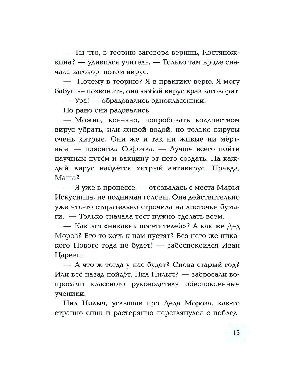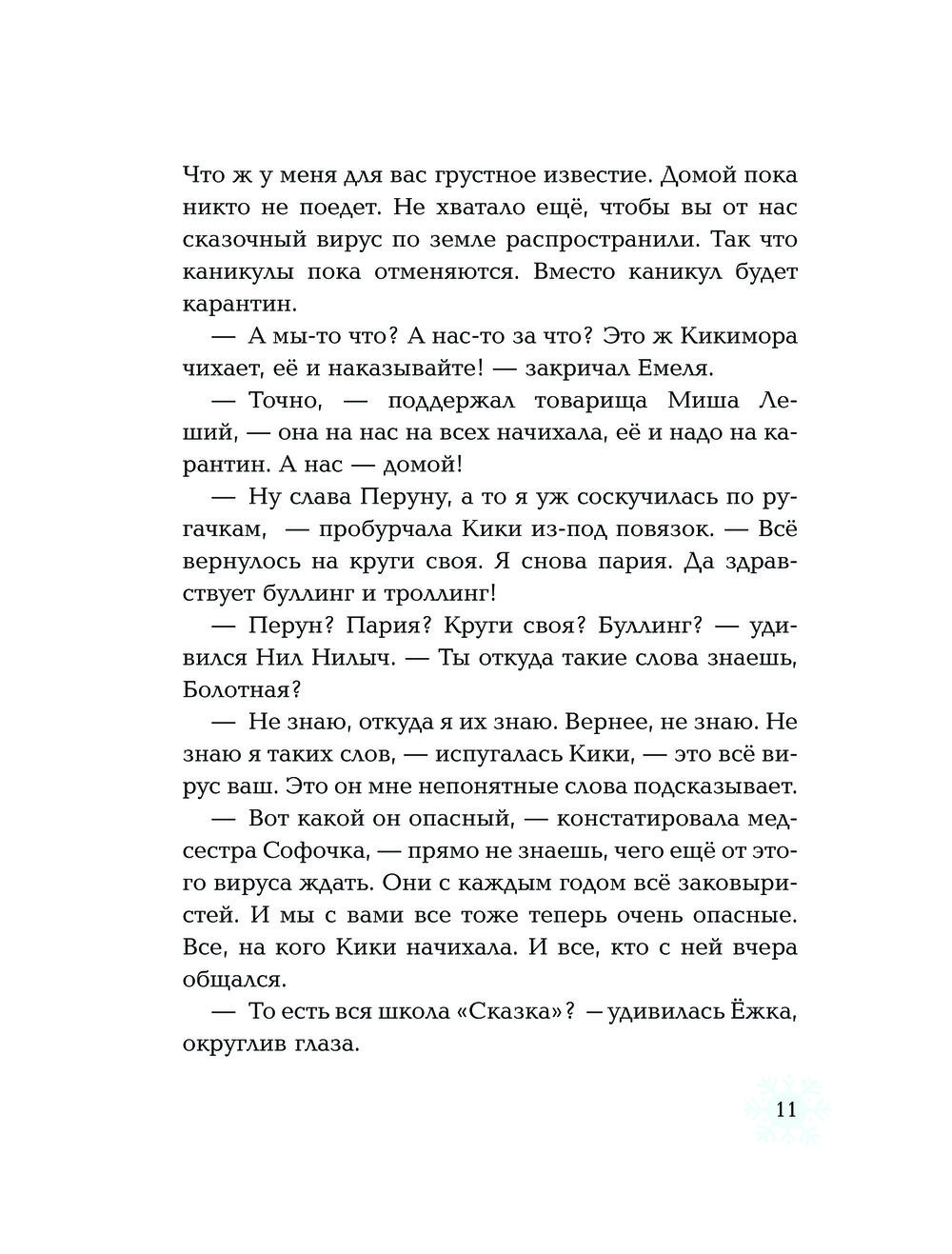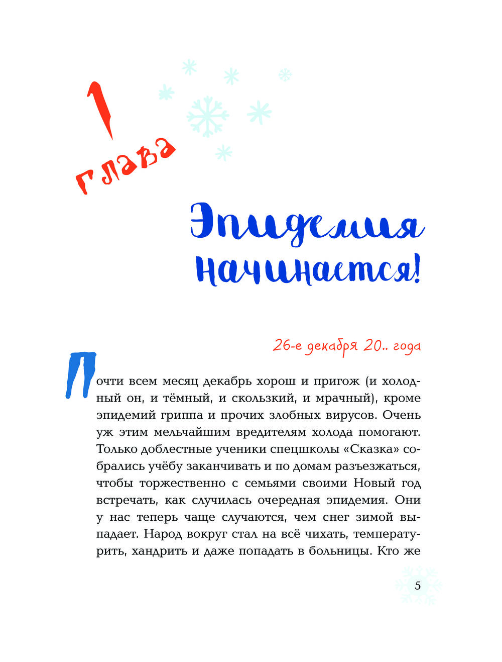 Мало того, что в школе "Сказка" прямо перед каникулами объявился какой-то новый вирус, из-за которого всех посадили на карантин. Так ещё и Ёжку похитили! А вместе с ней и всех снегурочек с праздников. Пока Марья Искусница днями-ночами не спит и работает над созданием спасительной вакцины, ребят из сказочной школы ждёт настоящее испытание. Ведь с колдуньей-похитительницей, Изольдой-Снеговикторией Великой и Холодной, будет справиться не так-то просто! Хорошо, что есть столько верных друзей, готовых и в огонь, и в стужу лететь-скакать ради спасения отважной и непокорной Ёженьки!