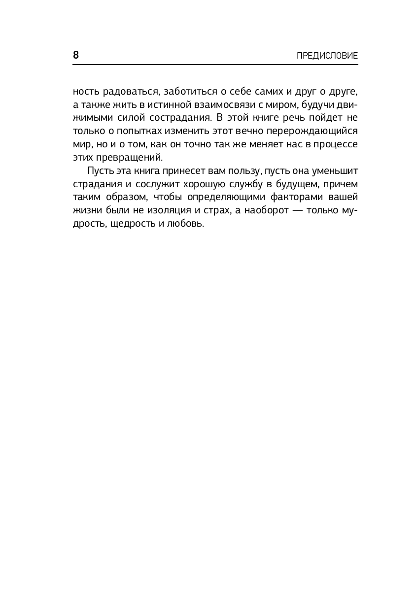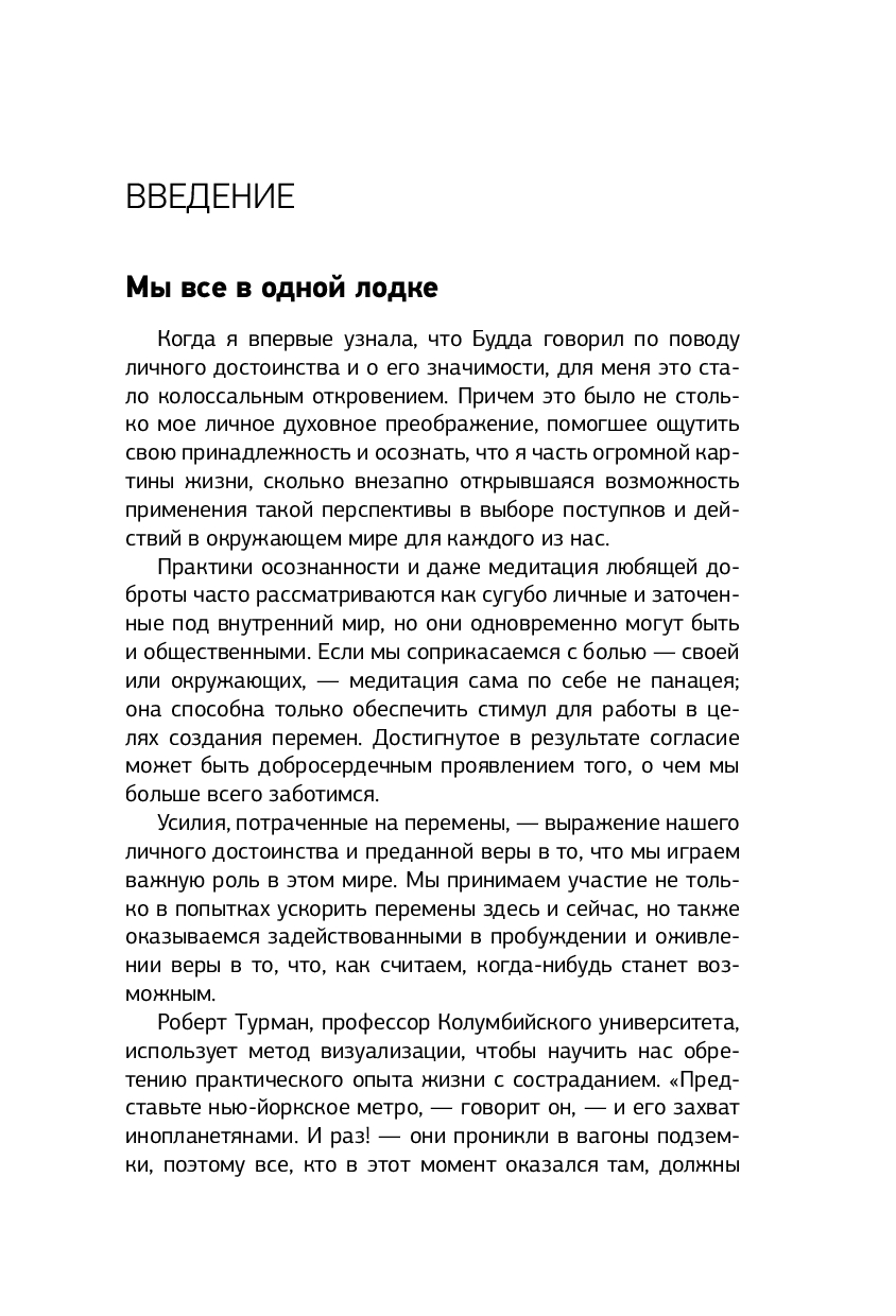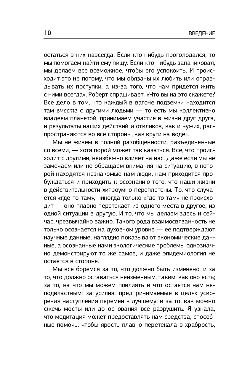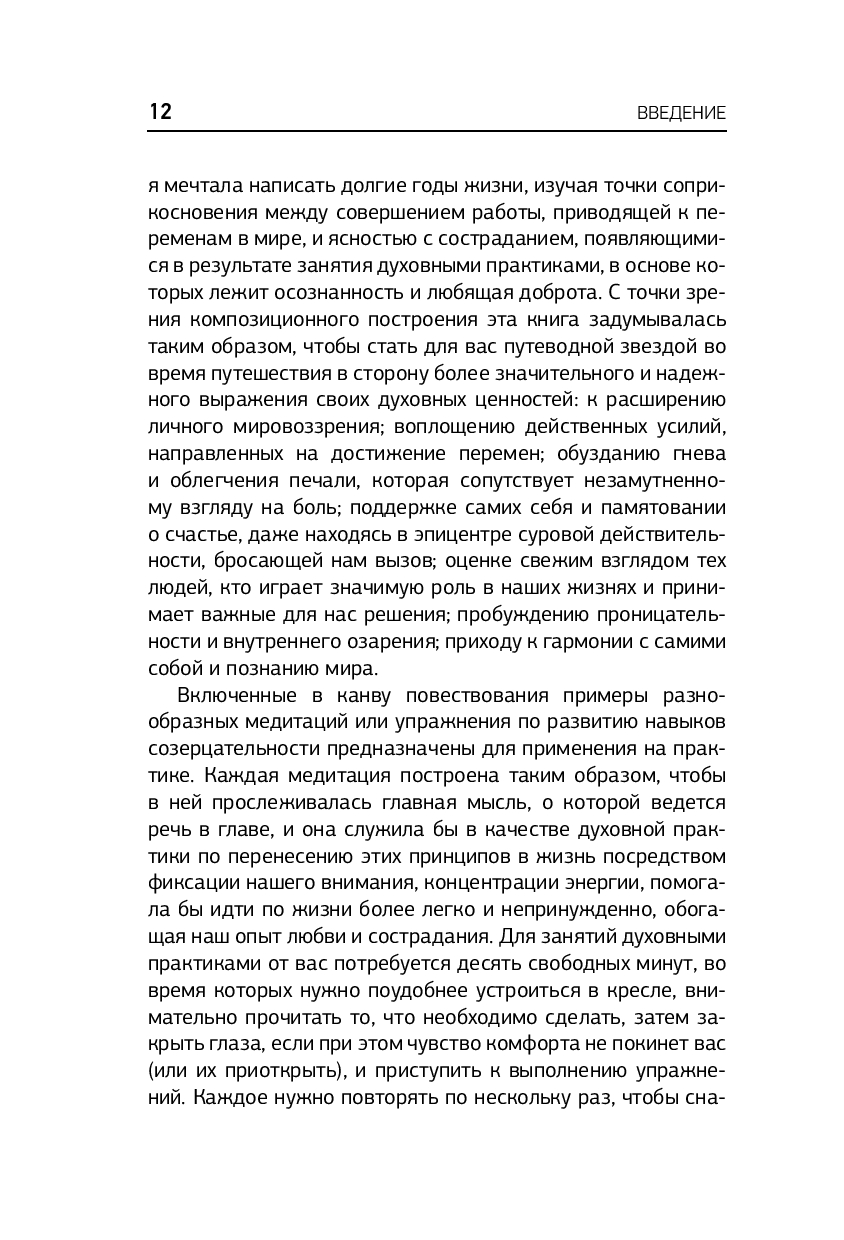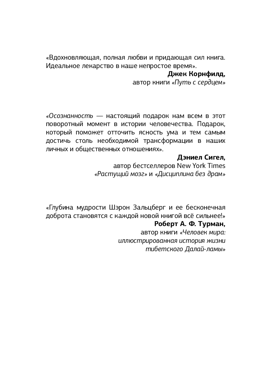 В современной жизни почти каждый день приносит будоражащие новости, вызывающие гнев, горе и боль. Постоянный страх и тревожность заставляют людей чувствовать себя подавленными, что часто приводит к апатии, выгоранию и депрессии. В своей книге Зальцберг объясняет, как использовать осознанность для развития внутренней силы, обретения баланса и исцеления себя самих и мира вокруг. Она говорит о том, что медитация – это не замена действию, а скорее способ проявить щедрость по отношению к самому себе, избавиться от рамок и ловушек мышления и напитаться энергией для здорового существования.