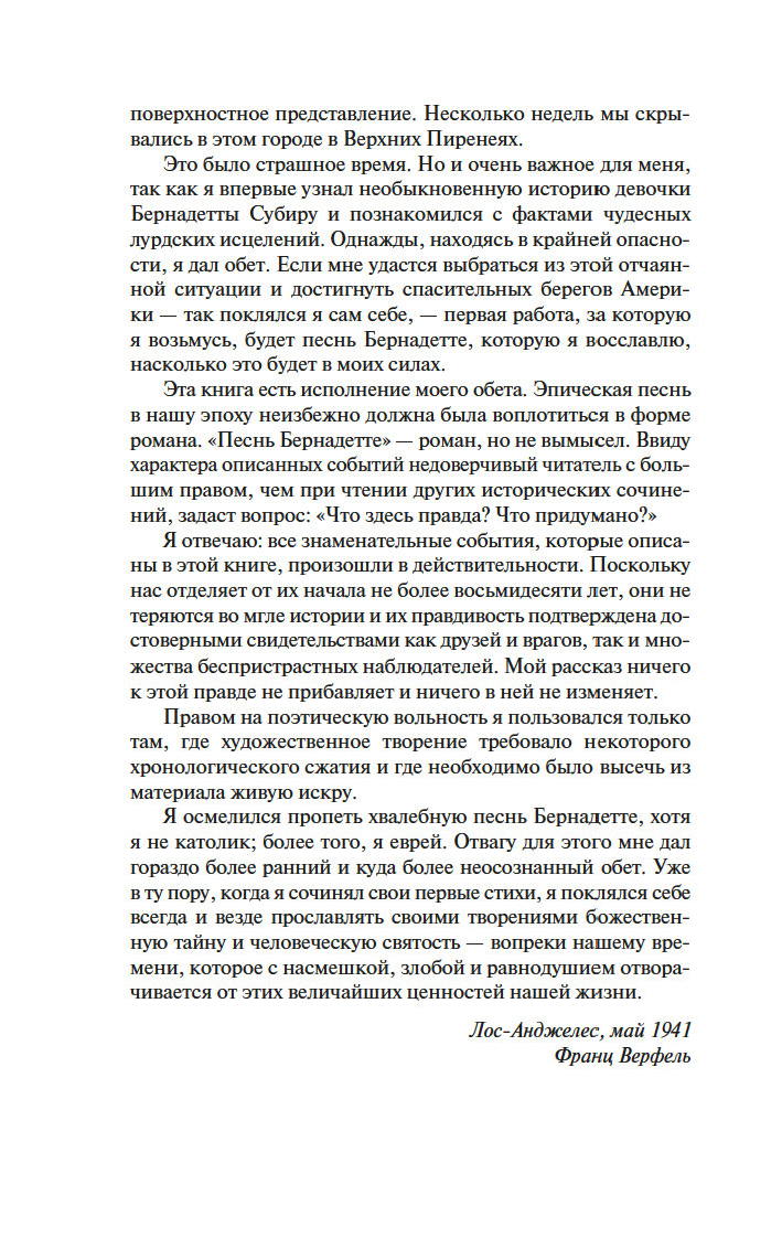 Франц Верфель – классик австрийской литературы XX века, пражский поэт, писатель и драматург, ученик Густава Майринка, соратник и друг Макса Брода, Райнера Марии Рильке, Роберта Музиля, Мартина Бубера – был звездой. Он считался лицом немецкоязычного экспрессионизма и вместе с Францем Кафкой и Максом Бродом входил в "пражский круг" – группу писателей и поэтов, которые перед началом Первой мировой изобретали неслыханный голос новой литературы. Поэзией Верфеля восхищались мэтры; его пьесы ставили по всей Европе. Верфель обладал развитым чутьем к трагическому, страшному и смешному, журналистской наблюдательностью, романтическим, порой мистическим взглядом на реальность и редким умением улавливать тончайшие движения человеческой души. Его поздний роман "Песнь Бернадетте", ставший бестселлером в США и экранизированнный в 1943 году, – проникновенная и подкупающая своей репортерской точностью история французской девочки, которой в Лурде являлась Дева Мария; история бескомпромиссной честности, любви и восторга перед этим миром вопреки всему.