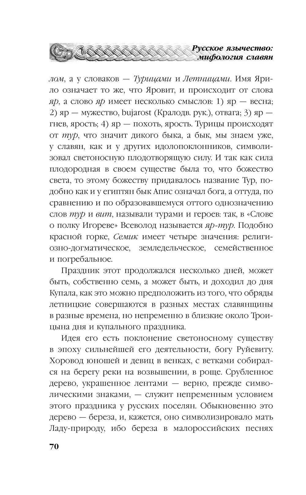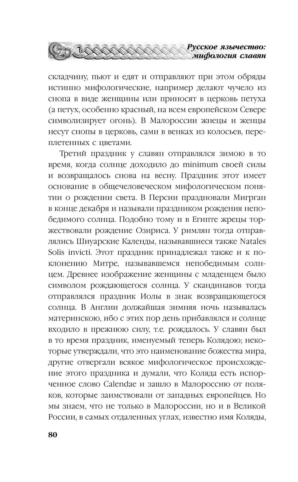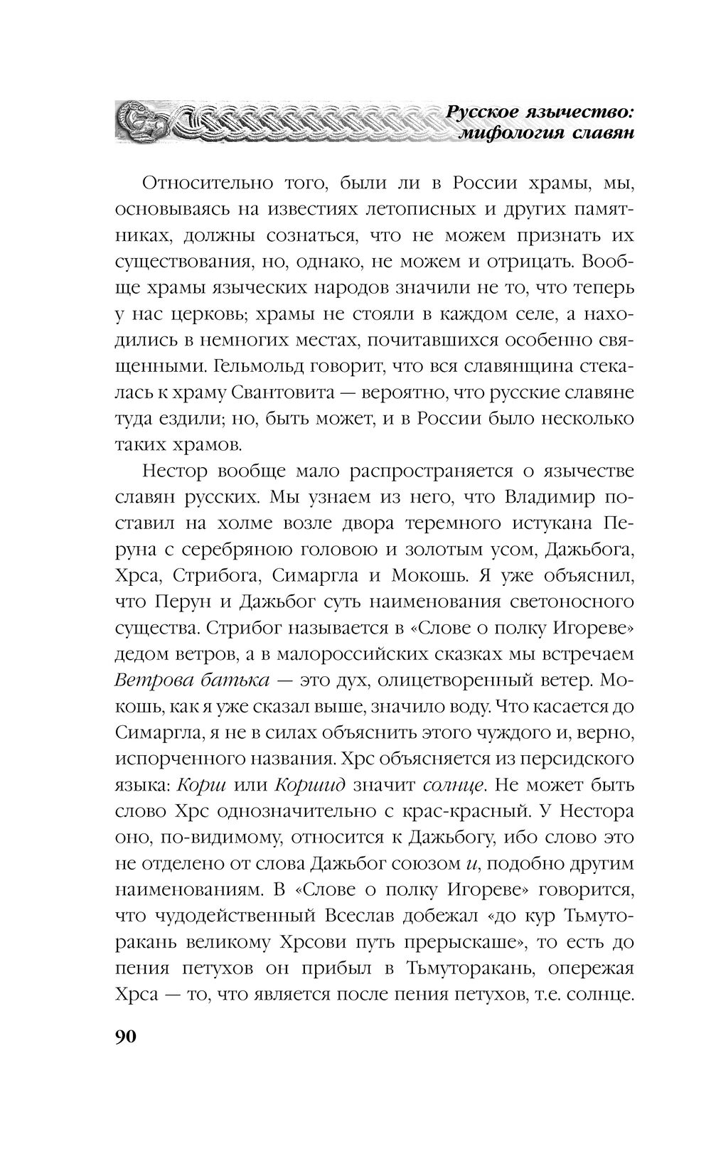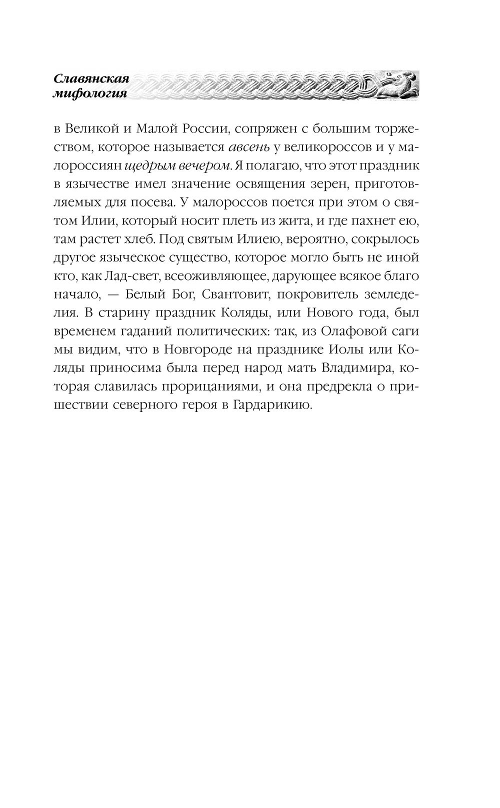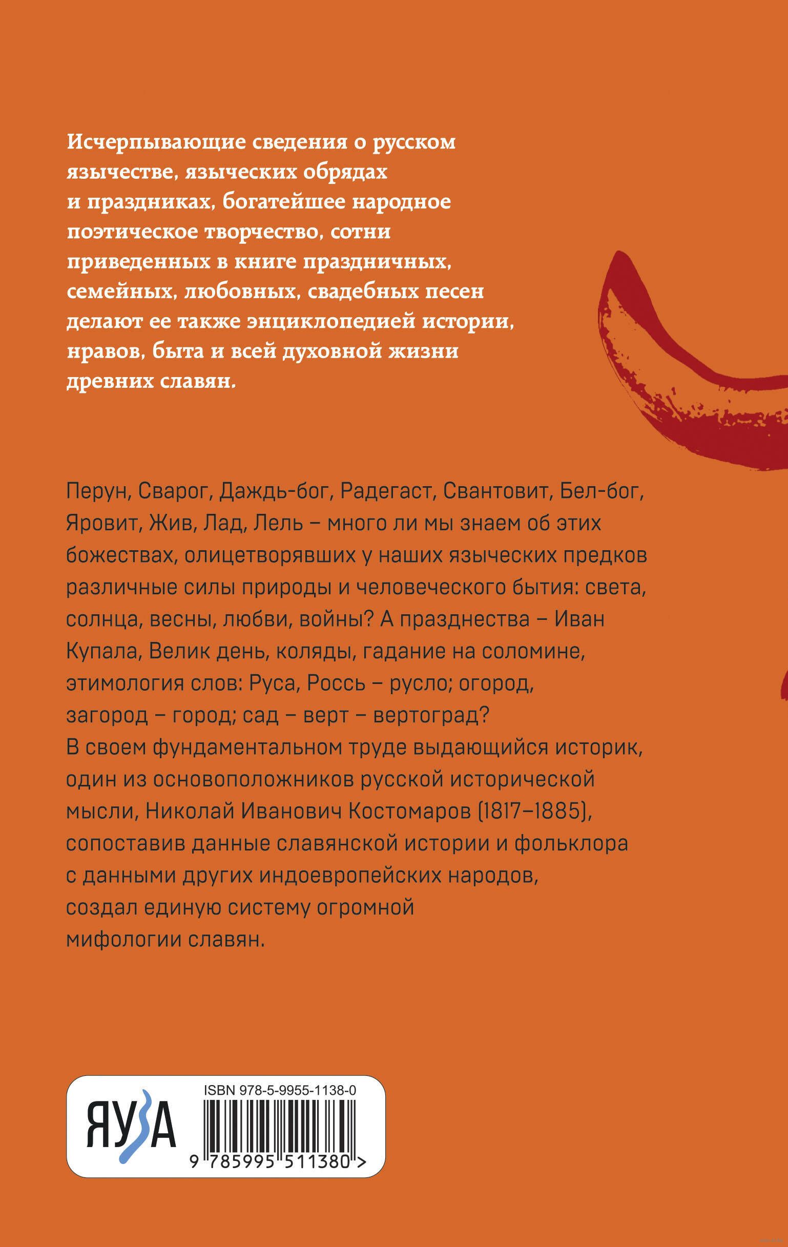 Перун, Сварог, Даждь-бог, Радегаст, Свантовит, Бел-бог, Яровит, Жив, Лад, Лель – много ли мы знаем об этих божествах, олицетворявших у наших языческих предков различные силы природы и человеческого бытия: света, солнца, весны, любви, войны? А празднества – Иван Купала, Велик день, Коляды, гадание на соломине, этимология слов: Руса, Россь – русло; огород, загород – город; сад – верт – вертоград? В своем фундаментальном труде выдающийся историк, один из основоположников русской исторической мысли Николай Иванович Костомаров (1817-1885), сопоставив данные славянской истории и фольклора с данными других индоевропейских народов, создал единую систему огромной мифологии славян.