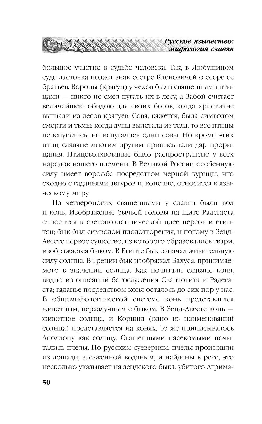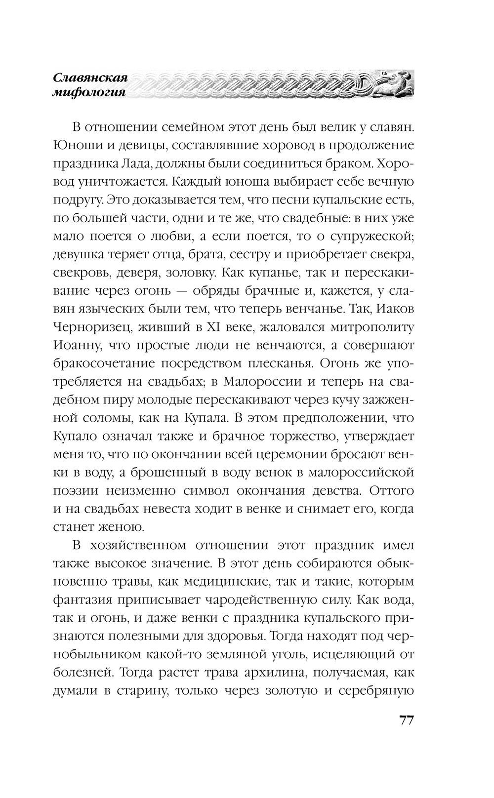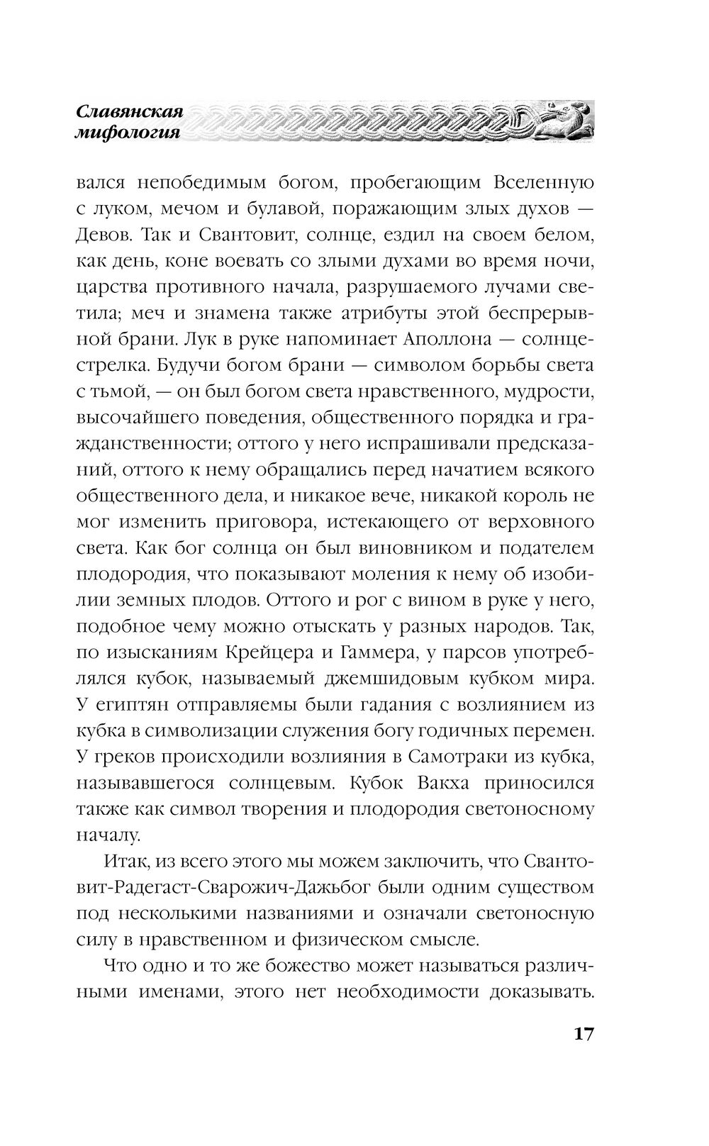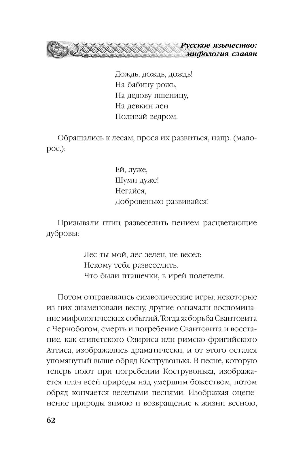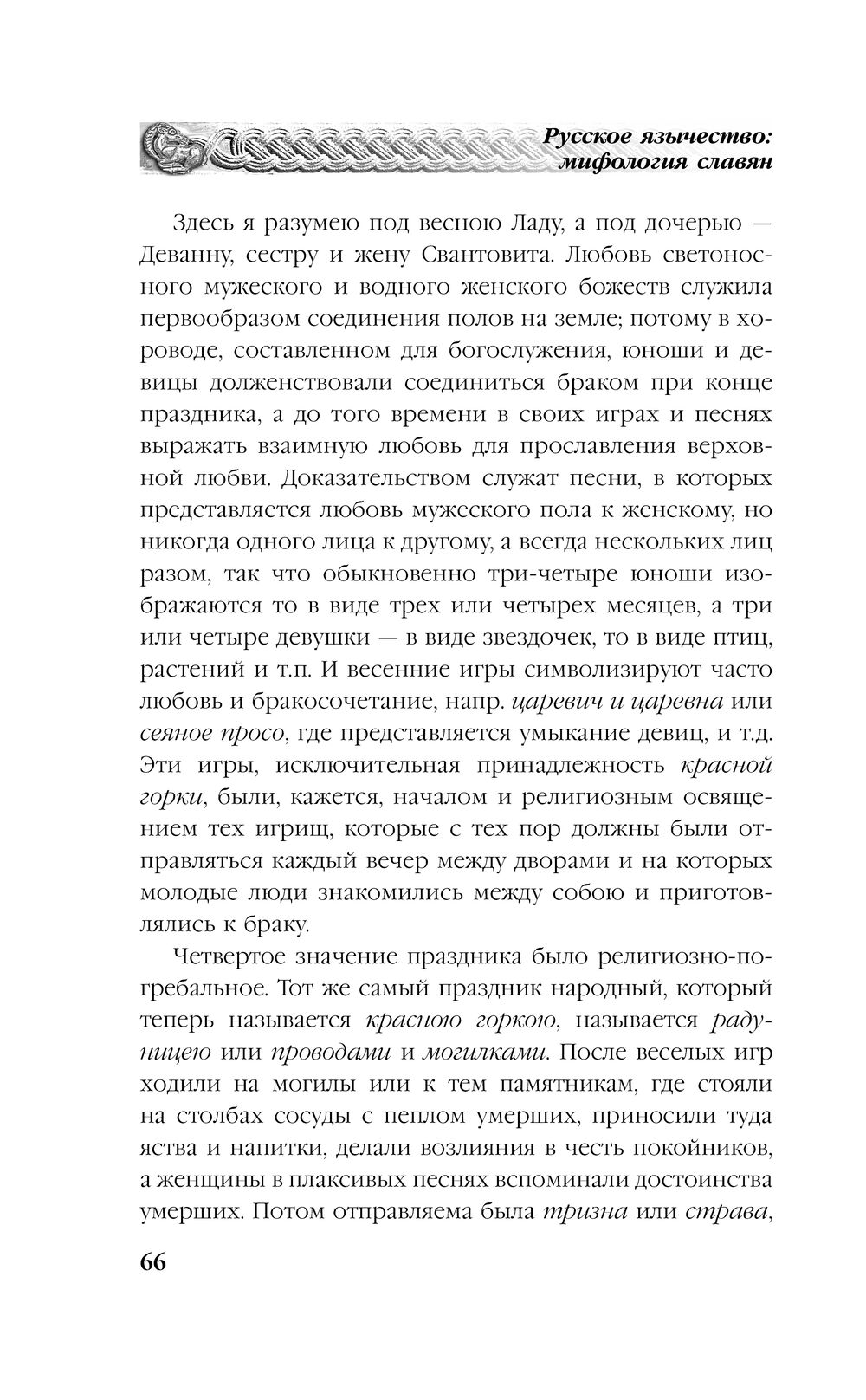 Перун, Сварог, Даждь-бог, Радегаст, Свантовит, Бел-бог, Яровит, Жив, Лад, Лель – много ли мы знаем об этих божествах, олицетворявших у наших языческих предков различные силы природы и человеческого бытия: света, солнца, весны, любви, войны? А празднества – Иван Купала, Велик день, Коляды, гадание на соломине, этимология слов: Руса, Россь – русло; огород, загород – город; сад – верт – вертоград? В своем фундаментальном труде выдающийся историк, один из основоположников русской исторической мысли Николай Иванович Костомаров (1817-1885), сопоставив данные славянской истории и фольклора с данными других индоевропейских народов, создал единую систему огромной мифологии славян.