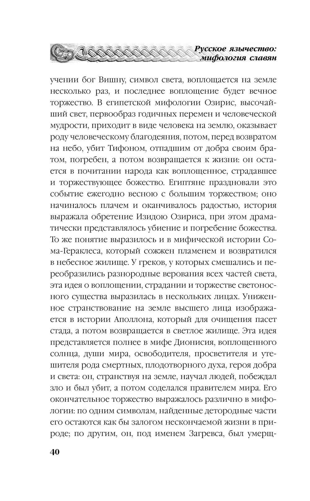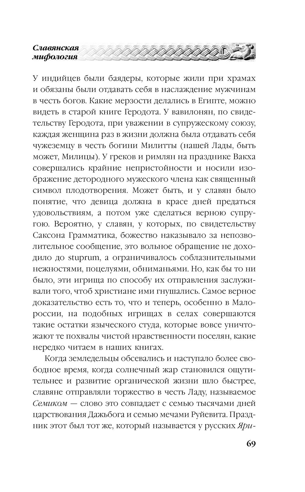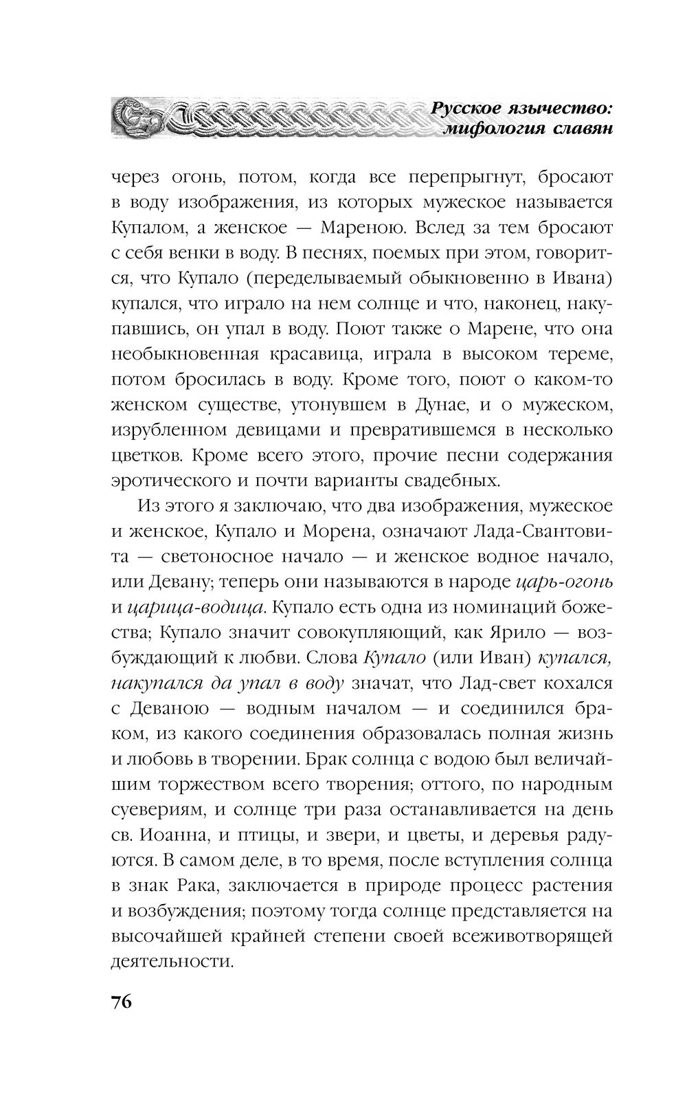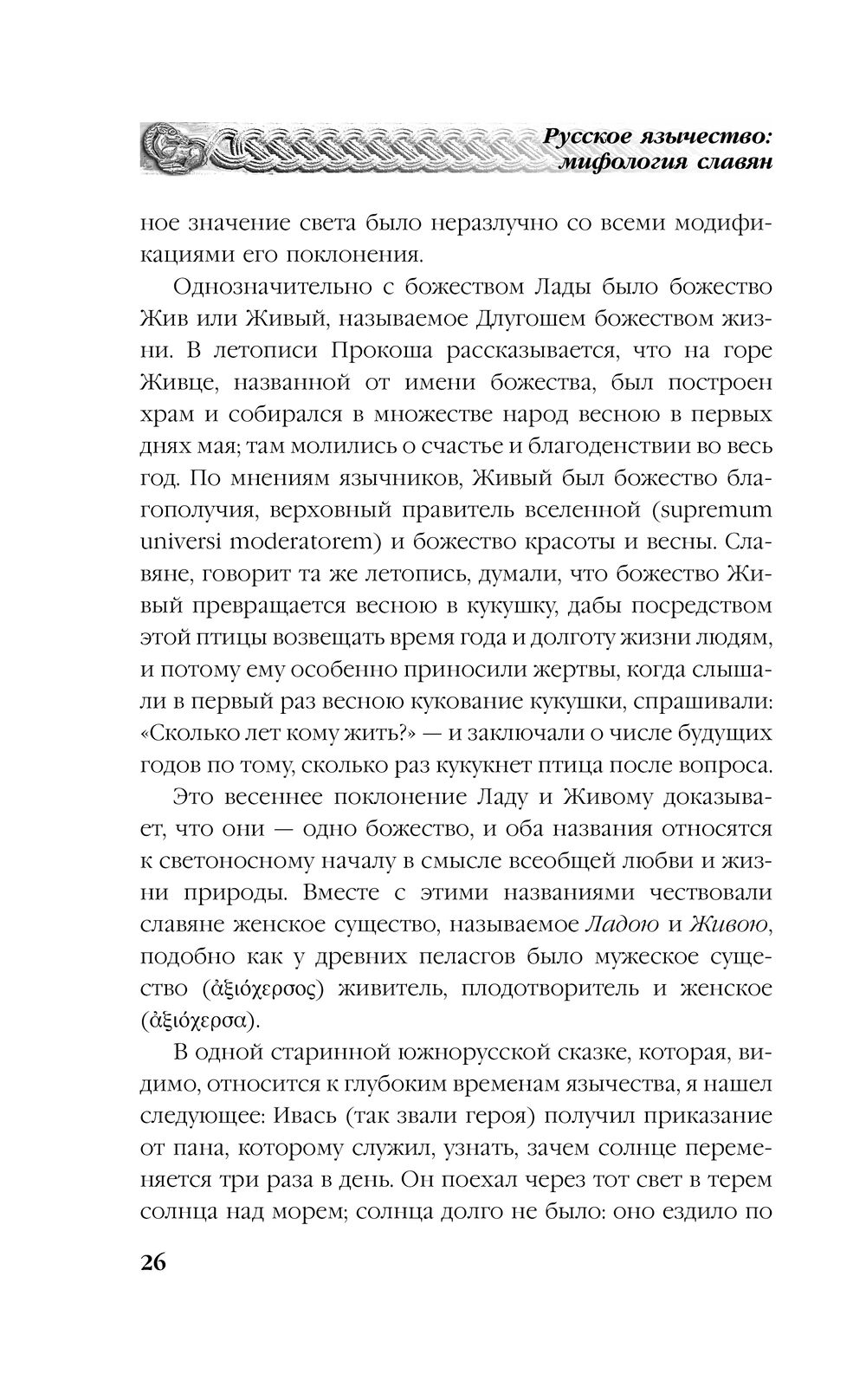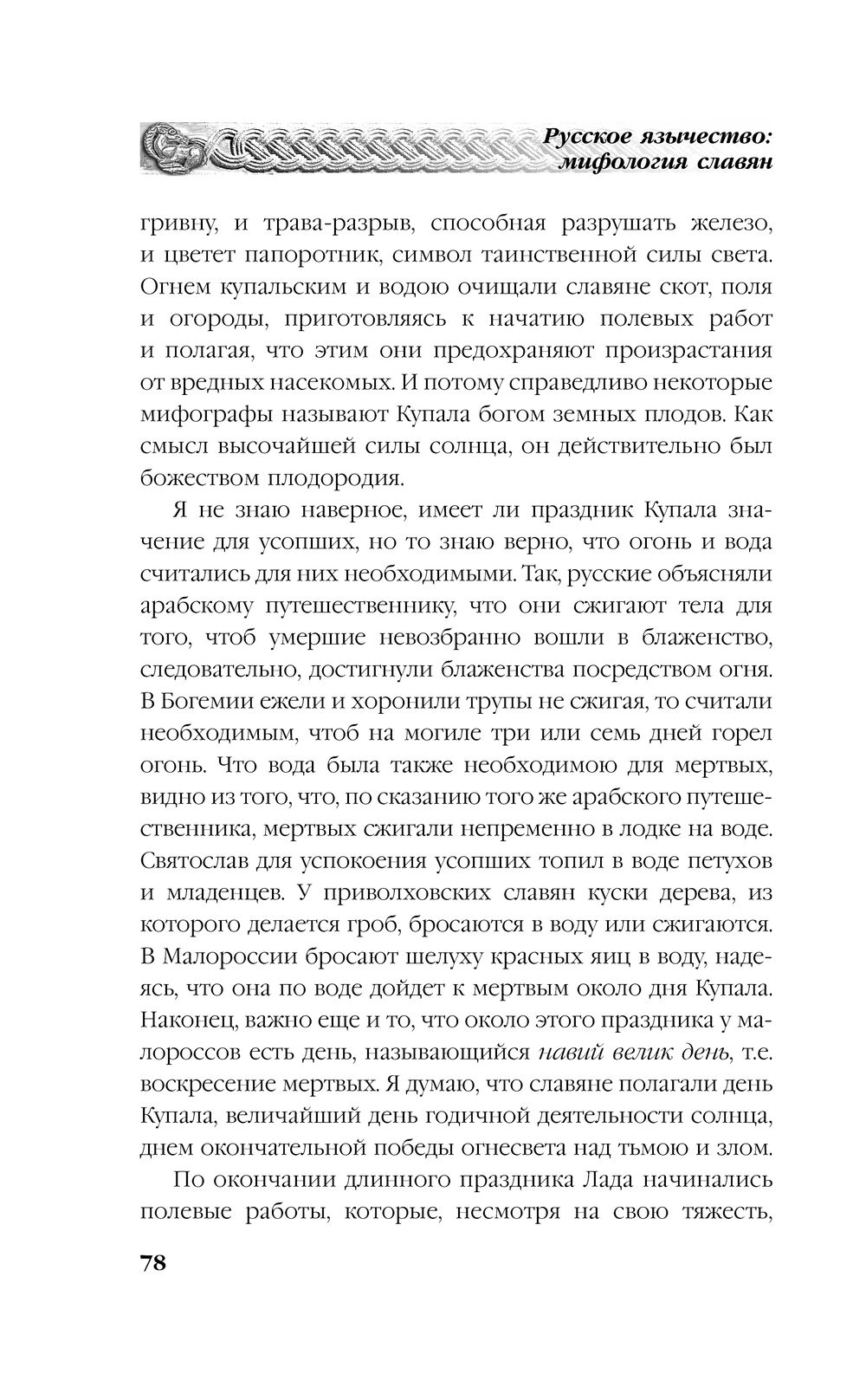 Перун, Сварог, Даждь-бог, Радегаст, Свантовит, Бел-бог, Яровит, Жив, Лад, Лель – много ли мы знаем об этих божествах, олицетворявших у наших языческих предков различные силы природы и человеческого бытия: света, солнца, весны, любви, войны? А празднества – Иван Купала, Велик день, Коляды, гадание на соломине, этимология слов: Руса, Россь – русло; огород, загород – город; сад – верт – вертоград? В своем фундаментальном труде выдающийся историк, один из основоположников русской исторической мысли Николай Иванович Костомаров (1817-1885), сопоставив данные славянской истории и фольклора с данными других индоевропейских народов, создал единую систему огромной мифологии славян.