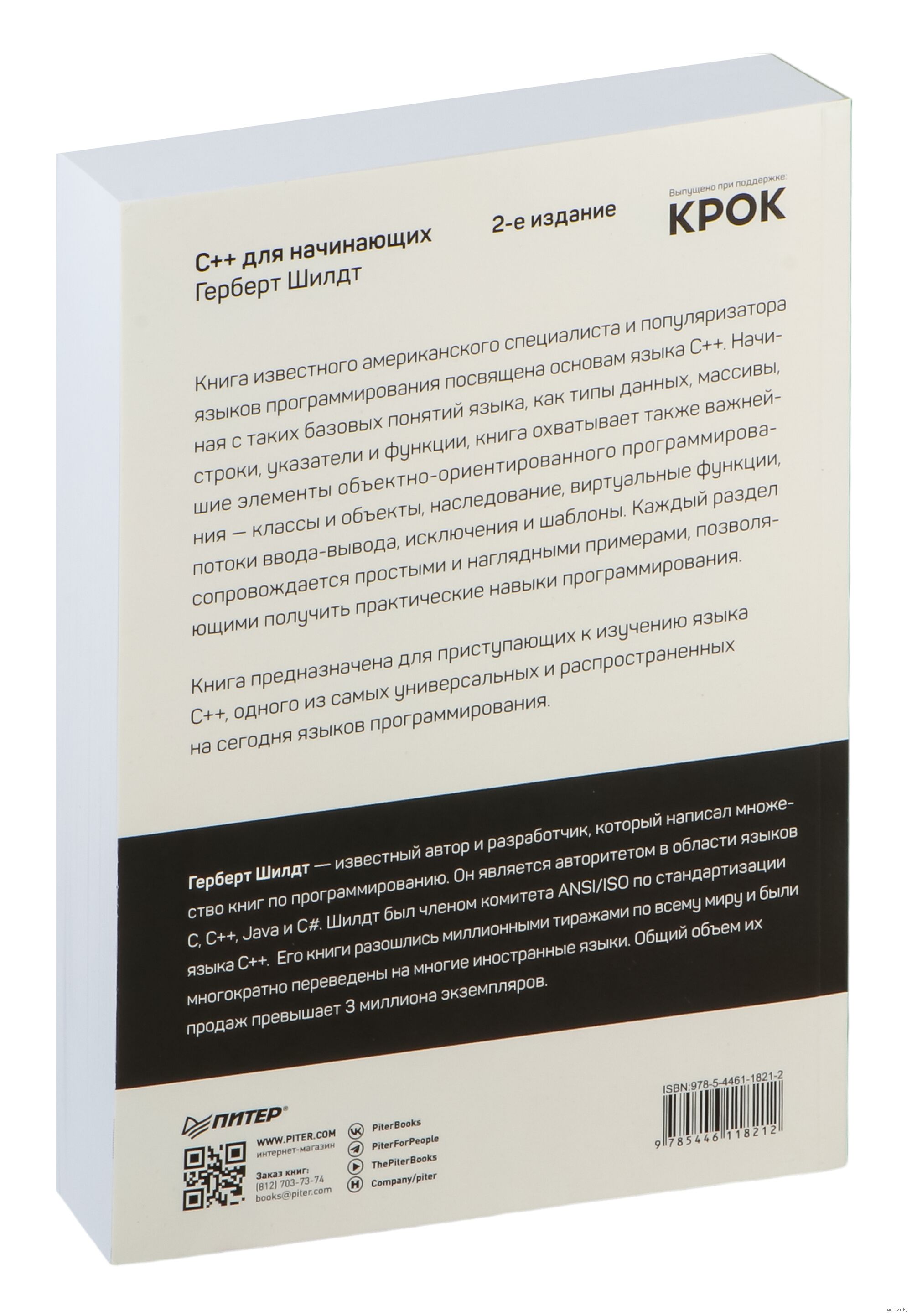 Книга известного американского специалиста и популяризатора языков программирования посвящена основам языка С++. Начиная с таких базовых понятий языка, как типы данных, массивы, строки, указатели и функции, книга охватывает также важнейшие элементы объектно-ориентированного программирования – классы и объекты, наследование, виртуальные функции, потоки ввода-вывода, исключения и шаблоны. Каждый раздел сопровождается простыми и наглядными примерами, позволяющими получить практические навыки программирования.