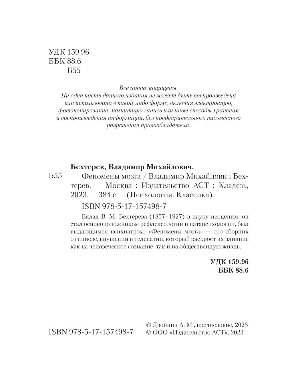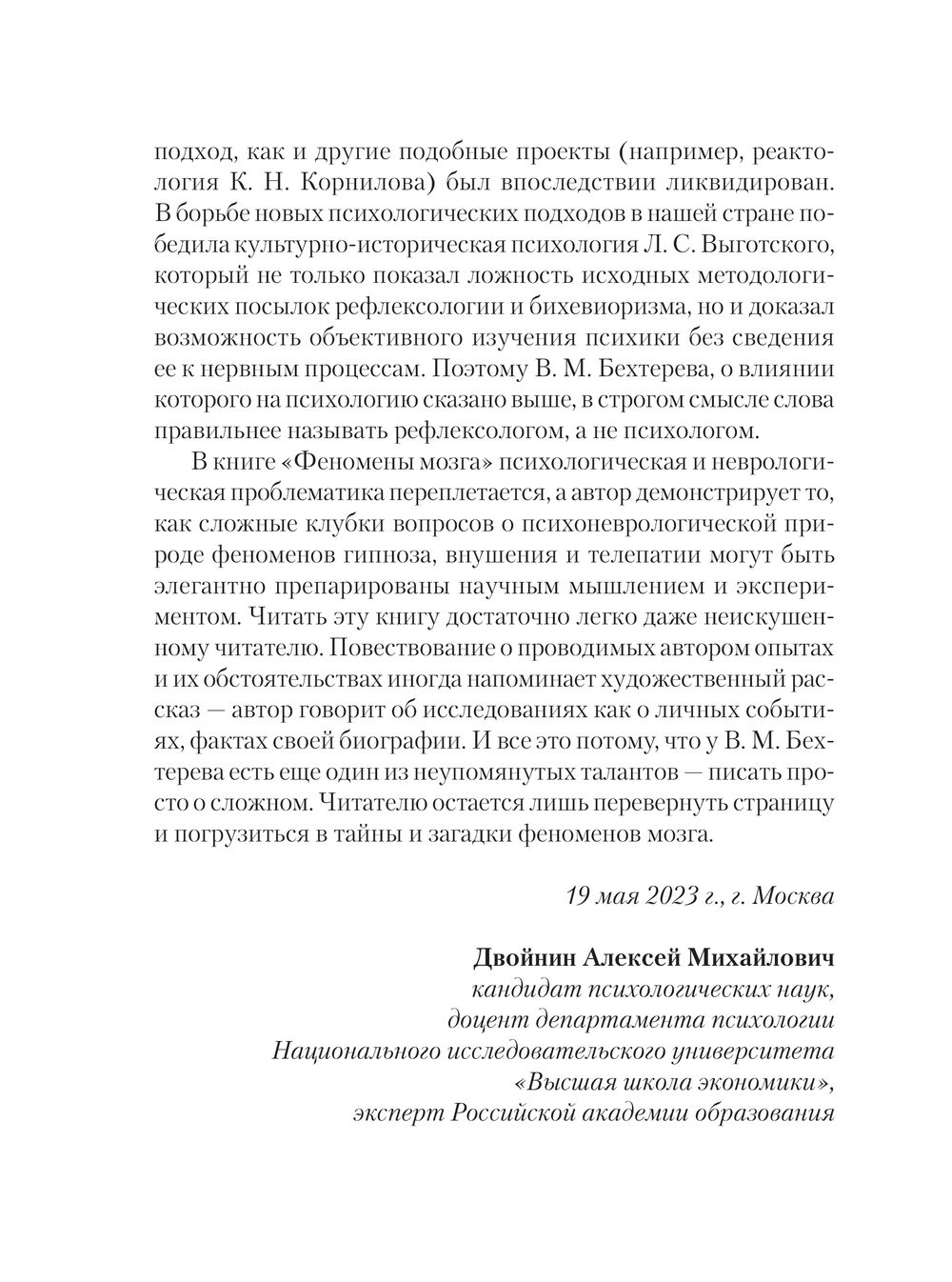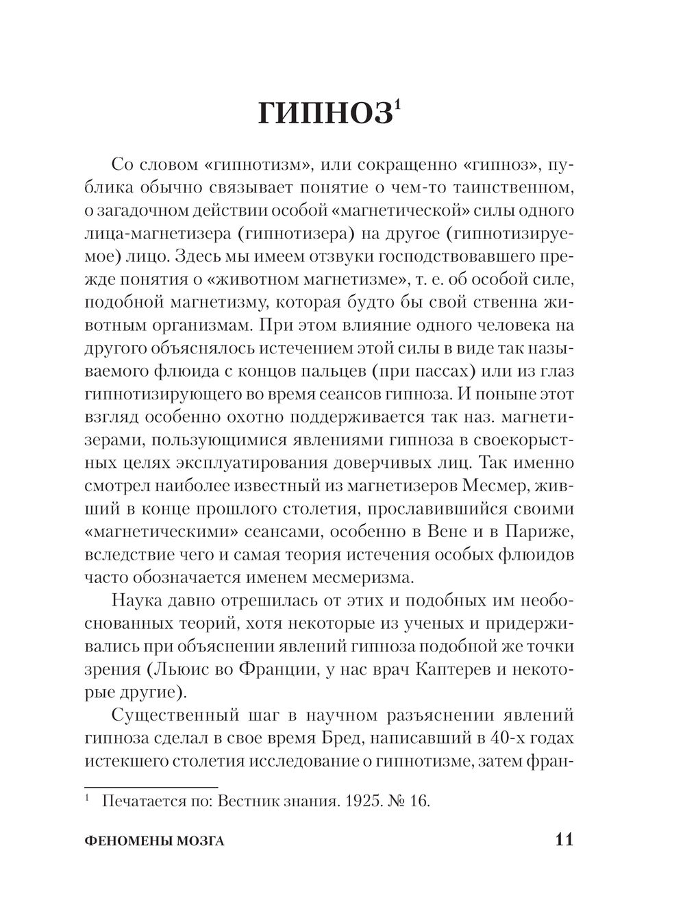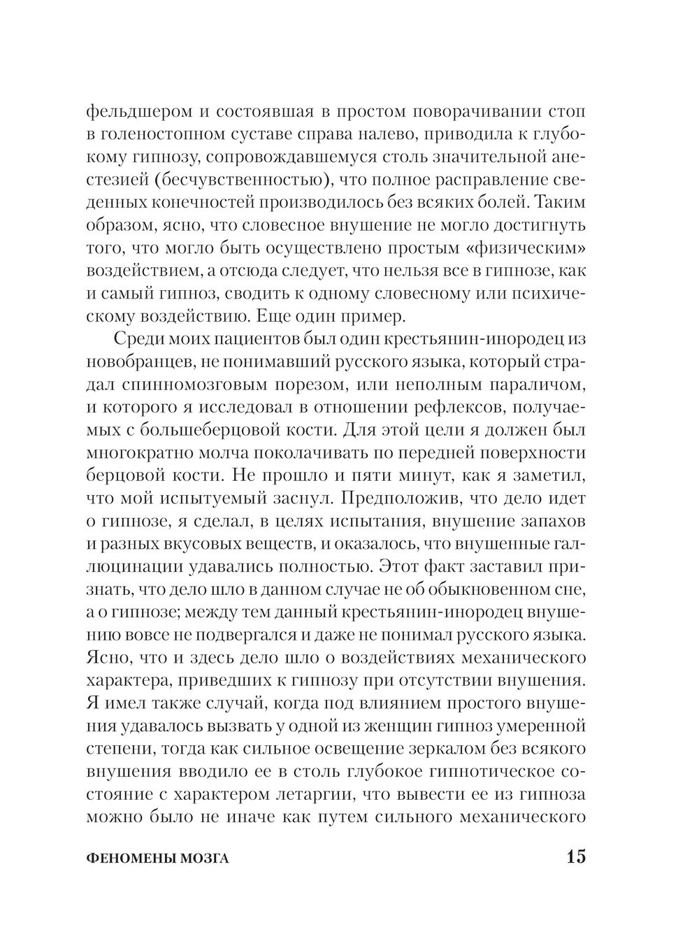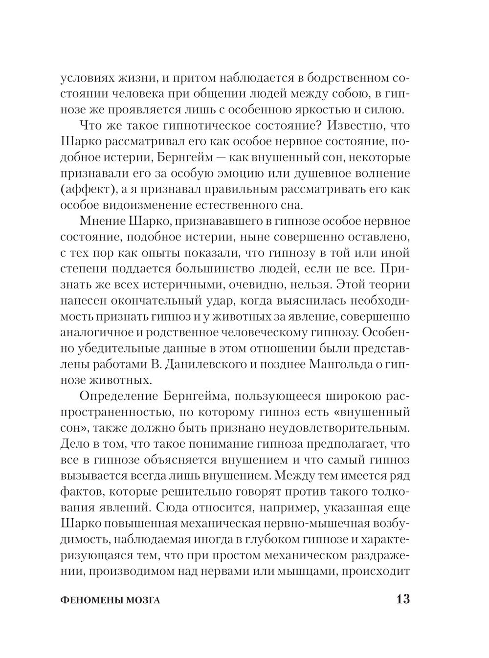 Вклад В. М. Бехтерева (1857-1927) в науку неоценим: он стал основоположником рефлексологии и патапсихологии. был выдающимся психиатром. "Феномены мозга" – это сборник о гипнозе. внушении и телепатии. который раскроет их влияние как на человеческое сознание. так и на общественную жизнь. Книга будет полезна людям. занимающимся не только психологией и психиатрией. но и ораторским искусством и журналистикой.