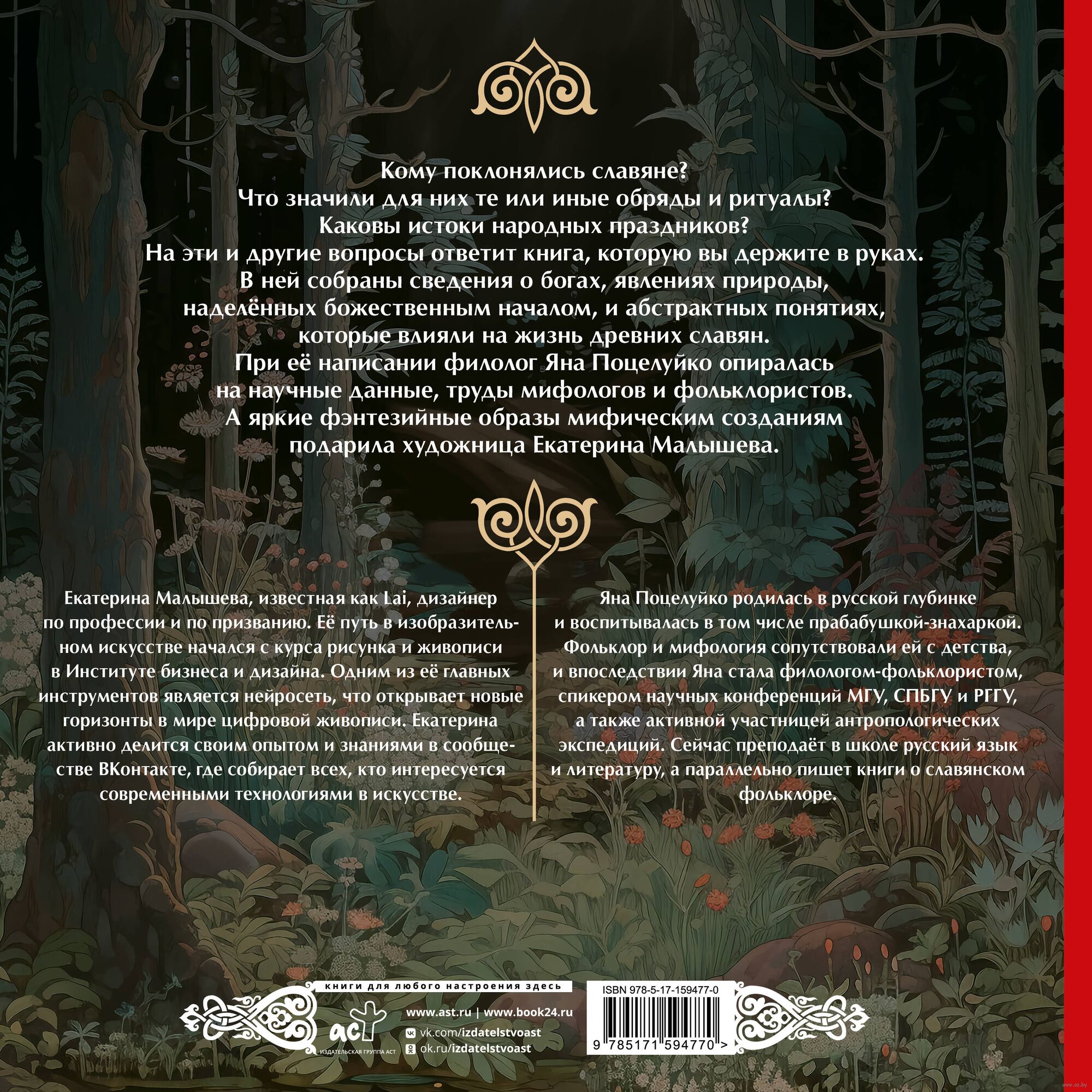 На эти и другие вопросы ответит книга, которую вы держите в руках. В ней собраны сведения о богах, явлениях природы, наделённых божественным началом, и абстрактных понятиях, которые влияли на жизнь древних славян. При её написании филолог Яна Поцелуйко опиралась на научные данные, труды мифологов и фольклористов. А яркие фэнтезийные образы мифическим созданиям подарила художница Екатерина Малышева.