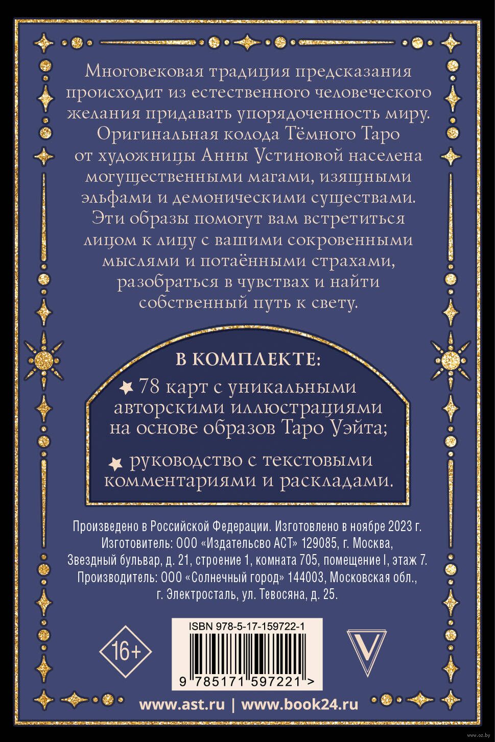 Многовековая традиция предсказания происходит из естественного человеческого желания придавать упорядоченность миру. Оригинальная колода Тёмного Таро от художницы Анны Устиновой населена могущественными магами, изящными эльфами и демоническими существами. Эти образы помогут вам встретиться лицом к лицу с вашими сокровенными мыслями и потаёнными страхами, разобраться в чувствах и найти собственный путь к свету.