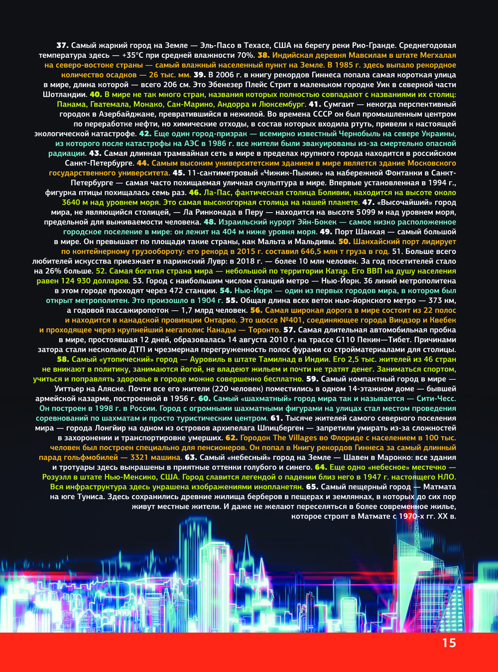 Если хочешь открыть для себя весь мир, начни с 5000 фактов! Многие из них станут для тебя настоящим сюрпризом, озадачат, ошеломят и поразят воображение. Из этой книги ты почерпнешь всесторонние знания о многочисленных предметах и явлениях: о животных и растениях, радуге и тумане, городах и мостах, богах и фантастических существах, науке и технике и о многом многом другом – даже о Гарри Поттере! Эта разносторонняя информация пополнит твой запас знаний и расширит кругозор, придав знакомым вещам новые черты и расставив неожиданные акценты в казалось бы привычных вопросах. Издание будет интересно каждому, в ком жив дух исследователя и кто не устает удивляться настоящим чудесам, созданным руками человека или самой природой.
