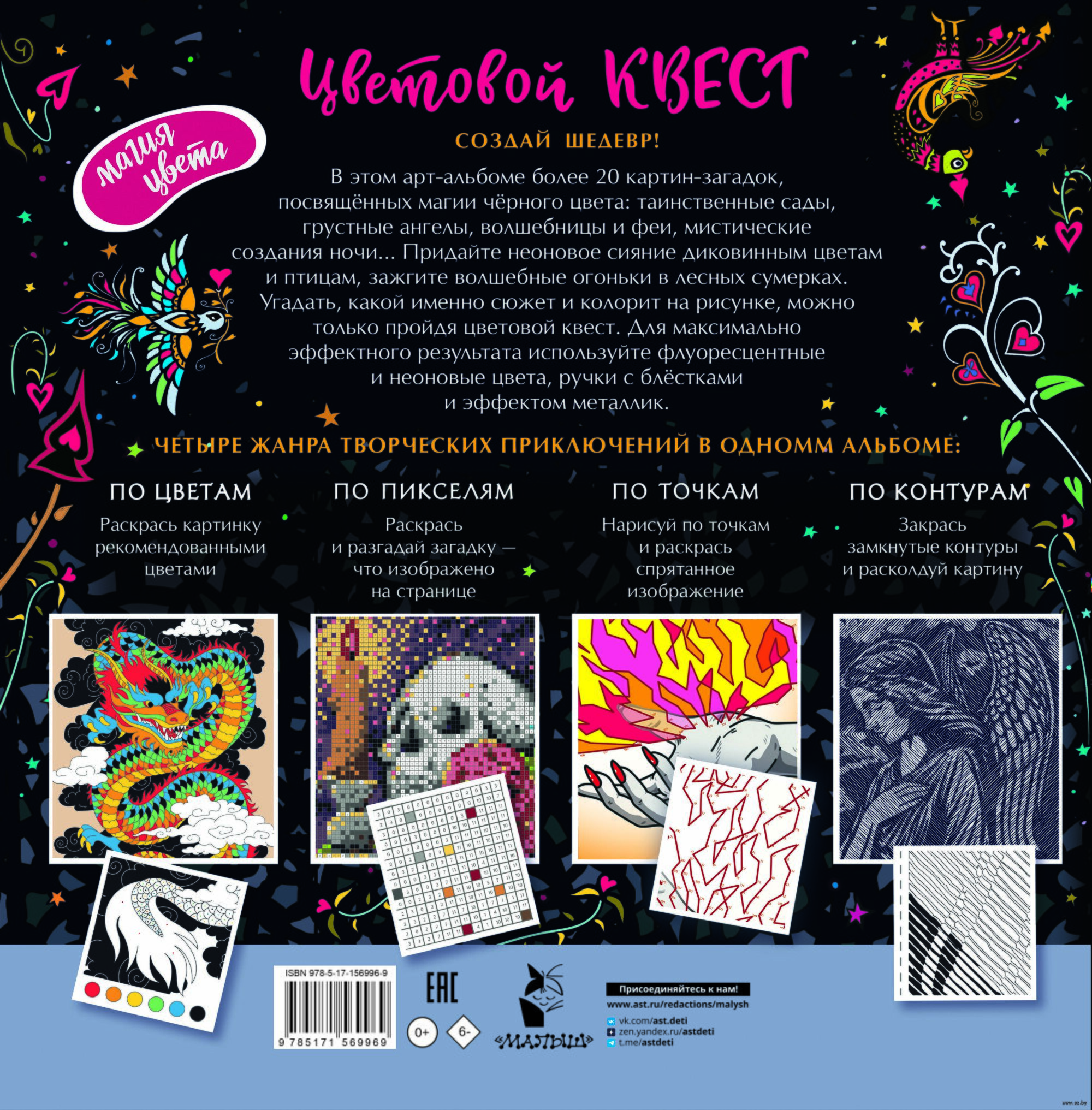 Этот творческий альбом объединяет несколько увлекательных жанров раскрашивания. На каждой странице вас ждут различные задания-квесты с непредсказуемым ярким результатом. Пока задание не пройдено – сюжеты и колорит картин остаются загадкой.