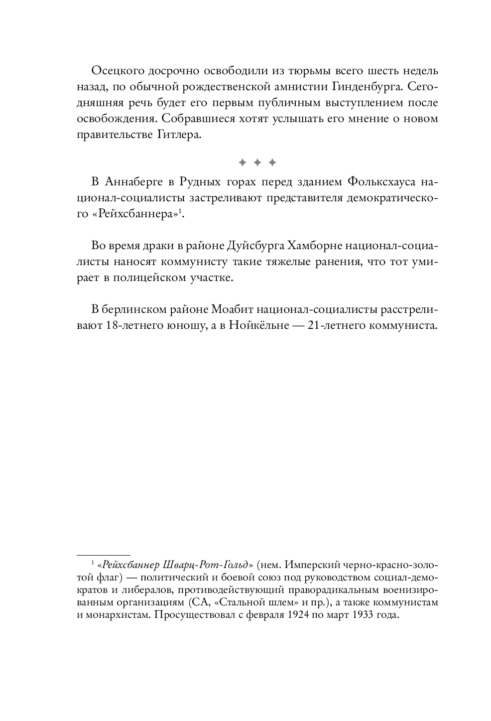 Уве Витшток на основе дневников, писем и архивных материалов воссоздает ощущение исторического слома, охватившего Германию. На превращение слабеющей демократии в царство террора у нацистов ушло не больше месяца. Рассказ о судьбах 33 немецких интеллектуалов – от Томаса Манна и Эльзы Ласкер-Шюлер до Бертольда Брехта – соседствует с хроникой столкновений на улицах, где правые избивают и убивают левых – и наоборот.