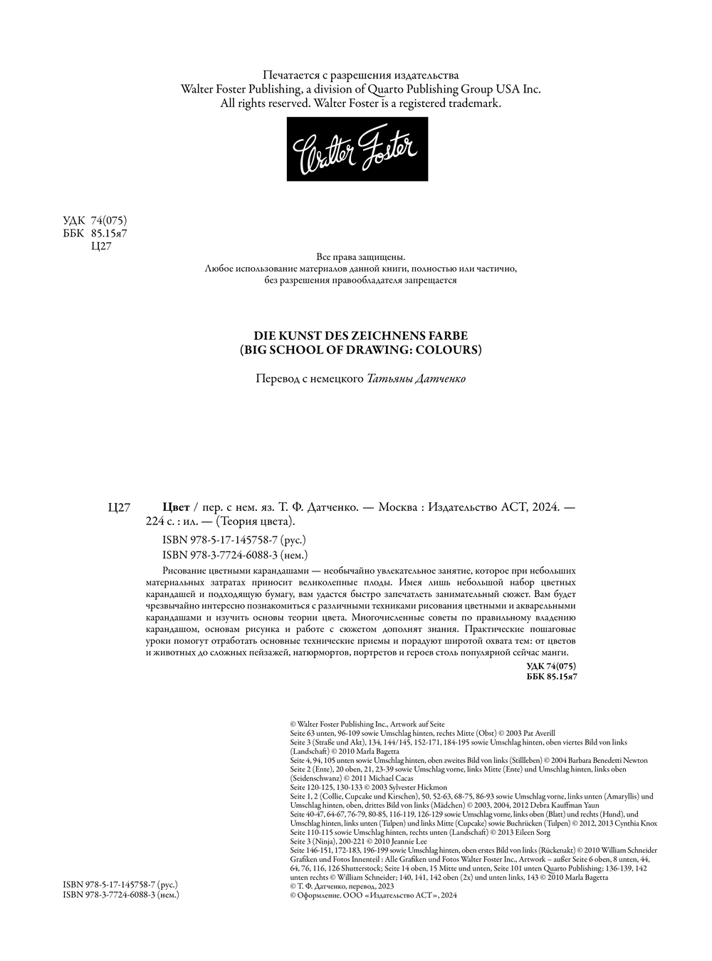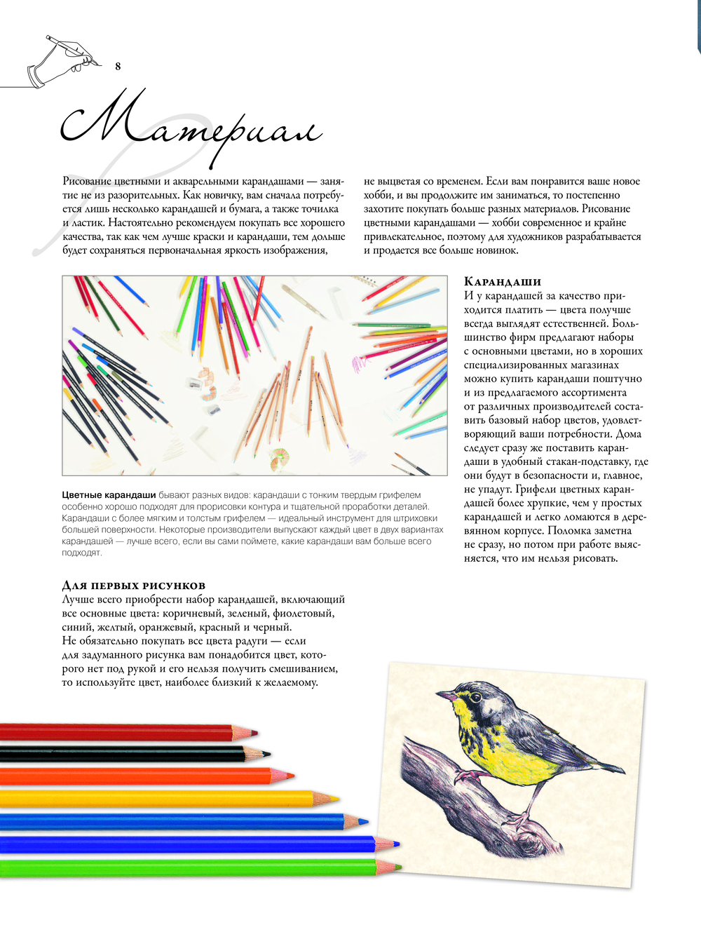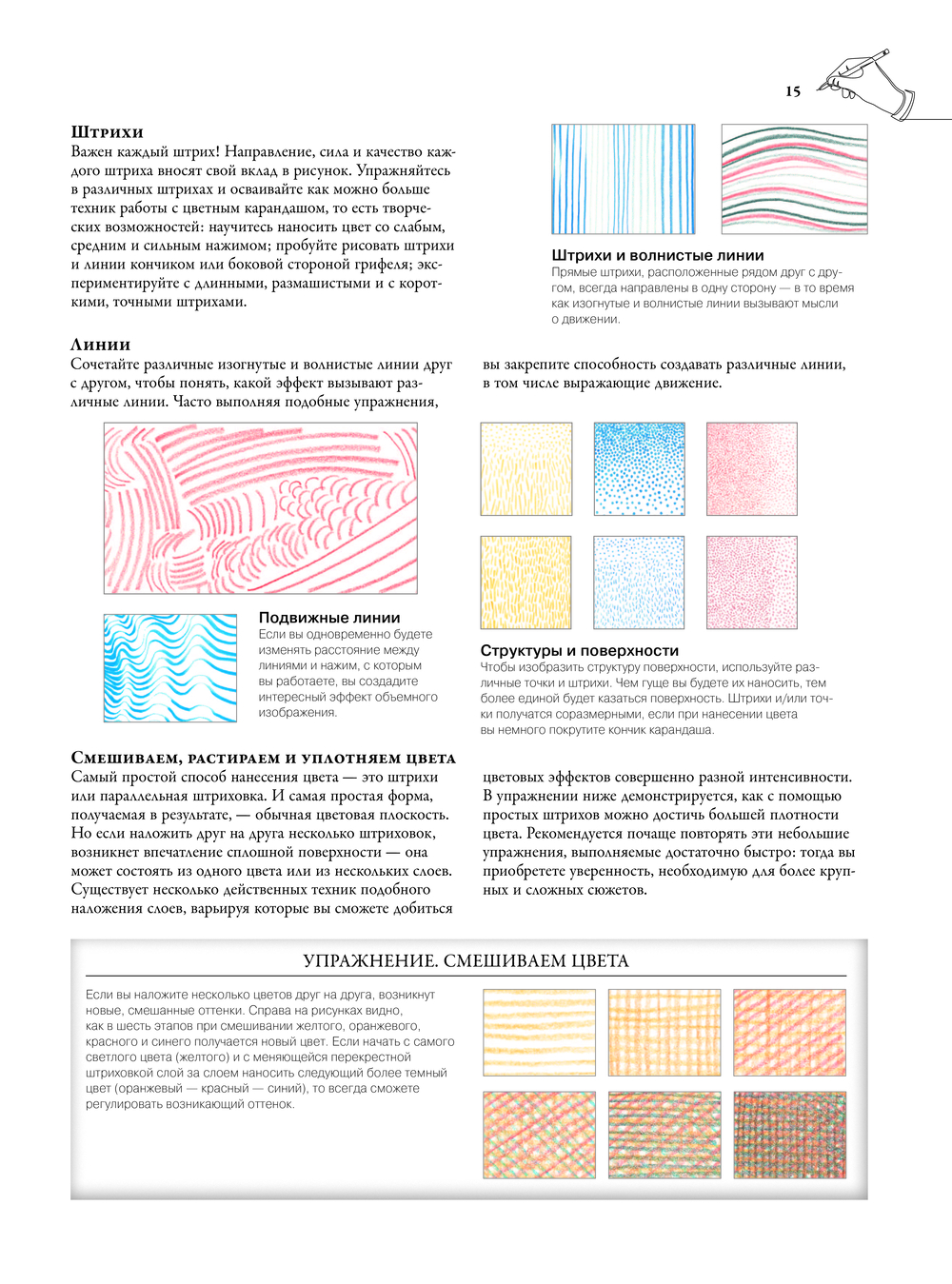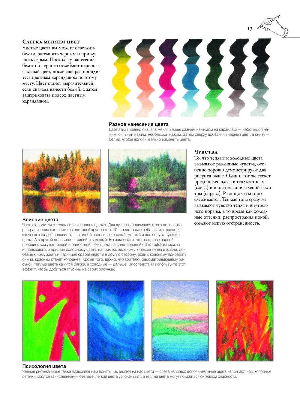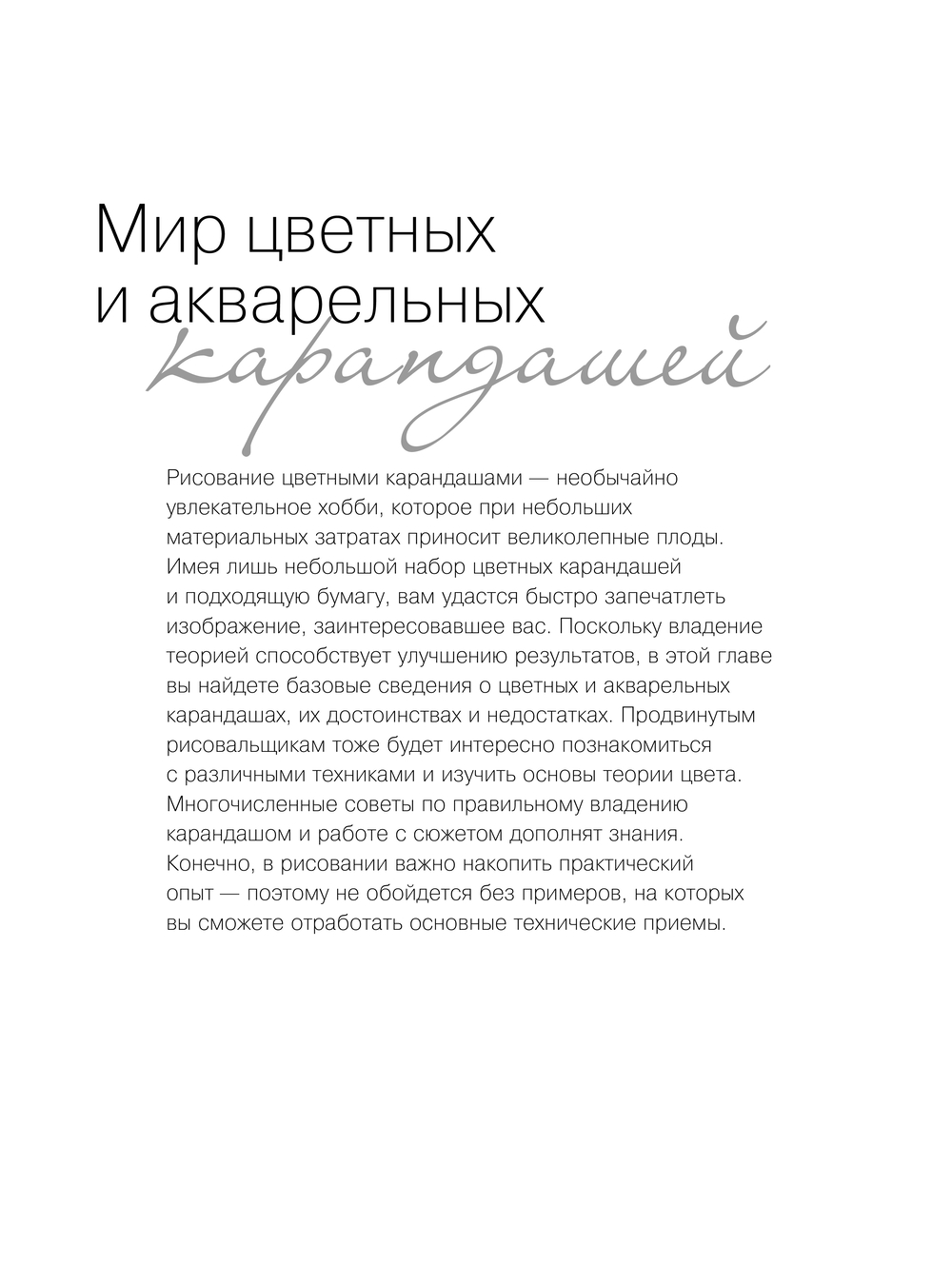 Рисование цветными карандашами, пастелью, цветными маркерами- необычайно увлекательное занятие, которое при небольших материальных затратах приносит великолепные плоды. Имея лишь небольшой набор цветных карандашей и подходящую бумагу, вам удастся быстро запечатлеть занимательный сюжет. Вам будет чрезвычайно интересно познакомиться с различными техниками рисования цветными и акварельными карандашами и изучить основы теории цвета. Многочисленные советы по правильному владению карандашом, основам рисунка и работе с сюжетом дополнят знания.