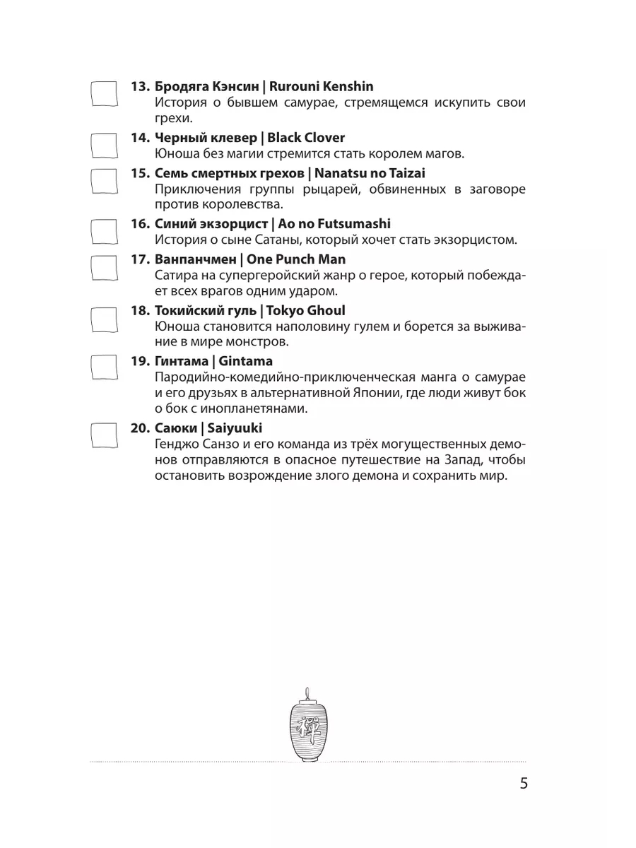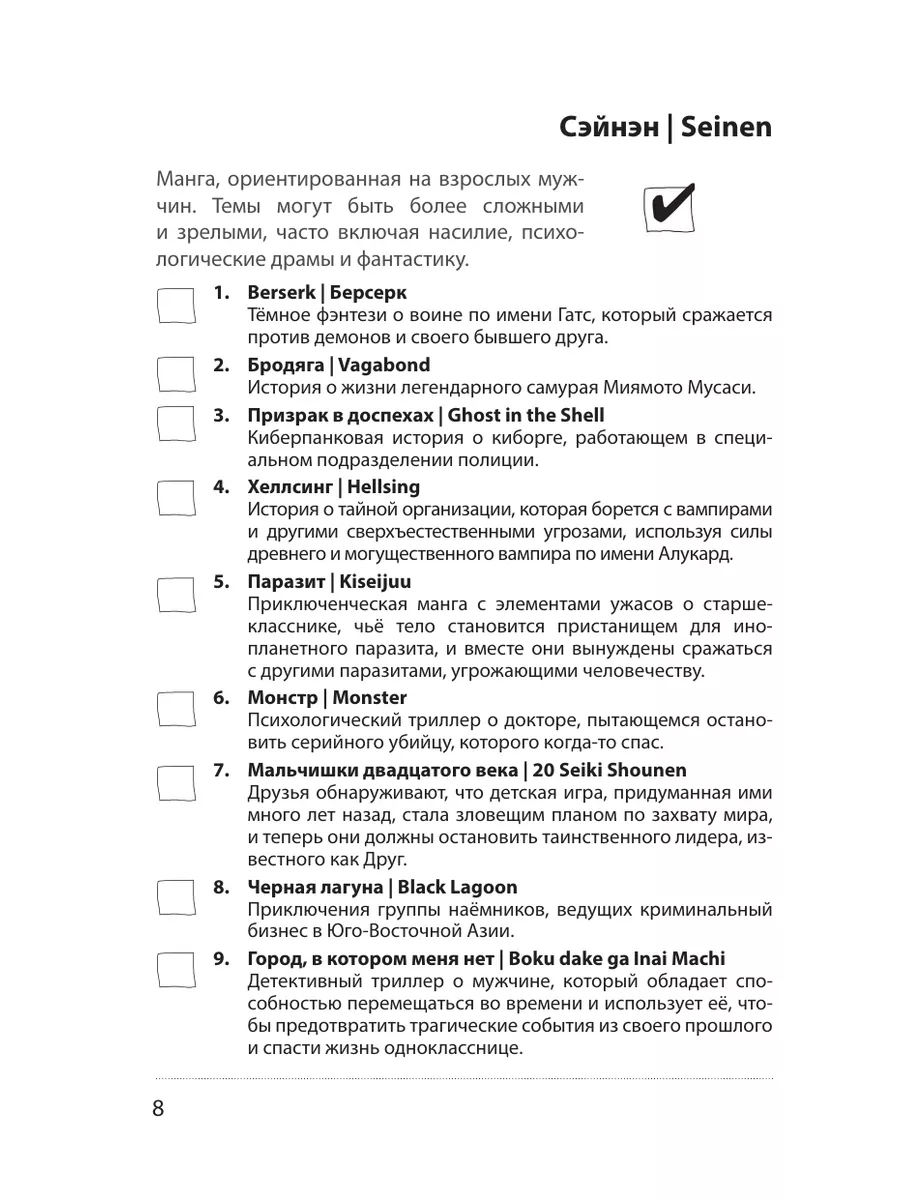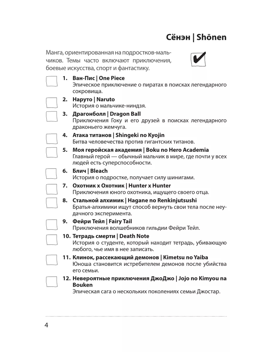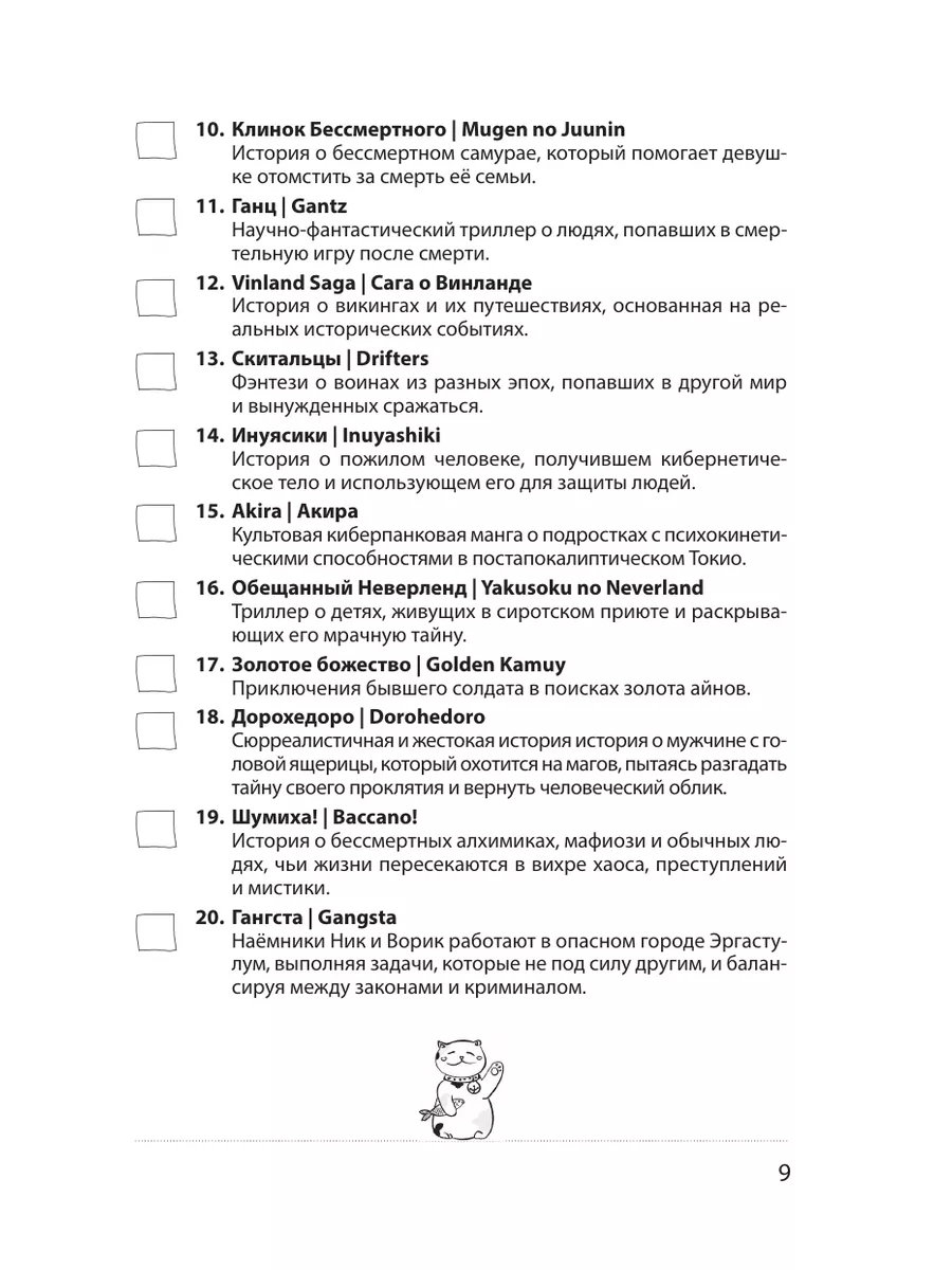 Внутри вы найдете трекер, который поможет отслеживать прочитанное и не потеряться в мире манги, а также 100 лучших тайтлов всех времен и 100 самых популярных новинок последних лет.