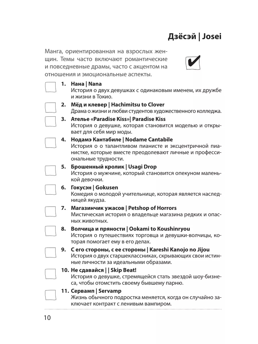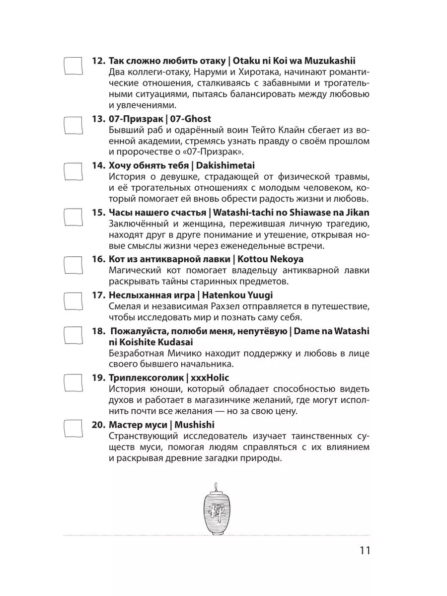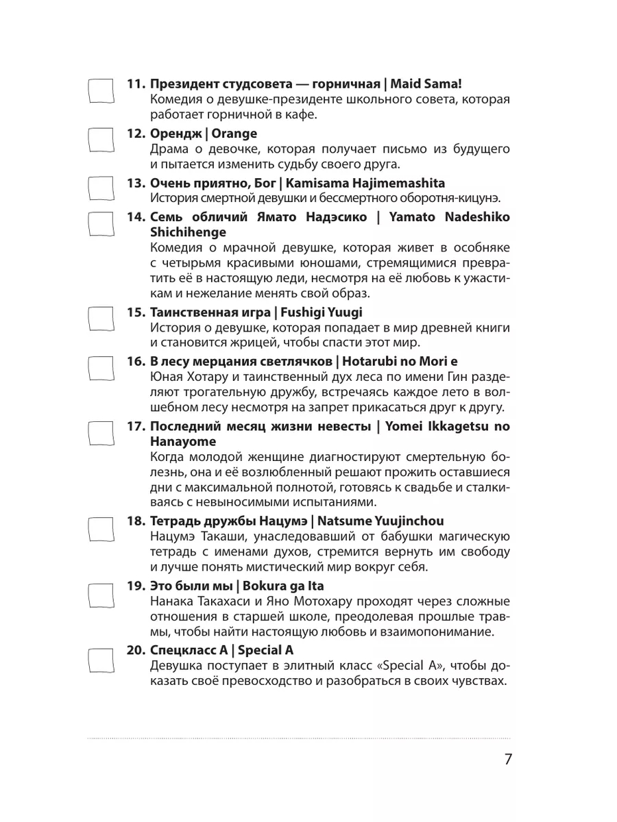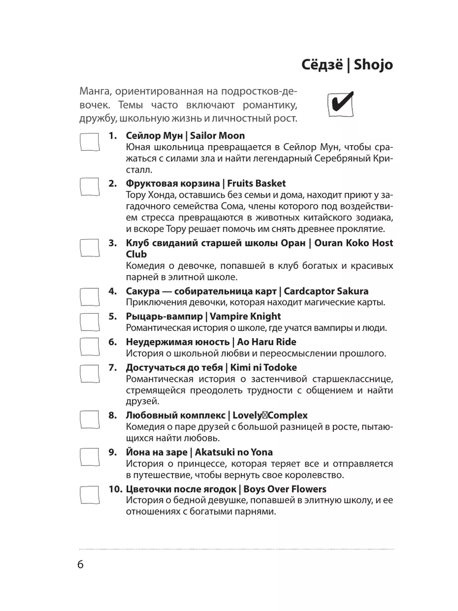 Внутри вы найдете трекер, который поможет отслеживать прочитанное и не потеряться в мире манги, а также 100 лучших тайтлов всех времен и 100 самых популярных новинок последних лет.