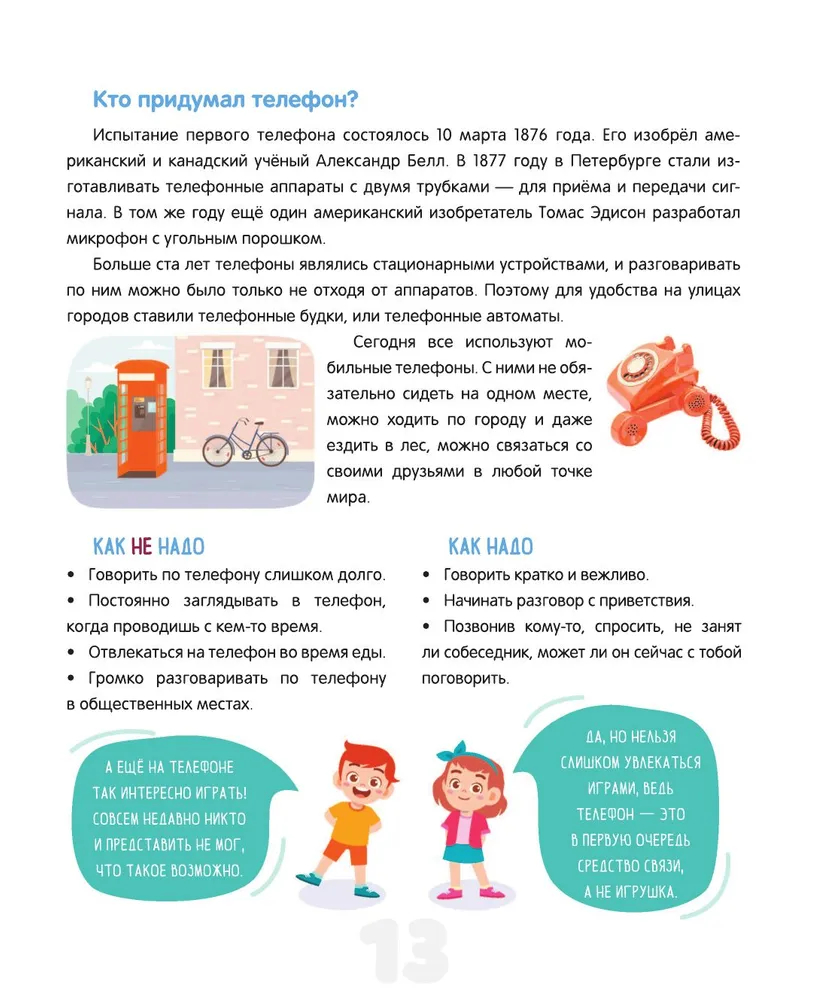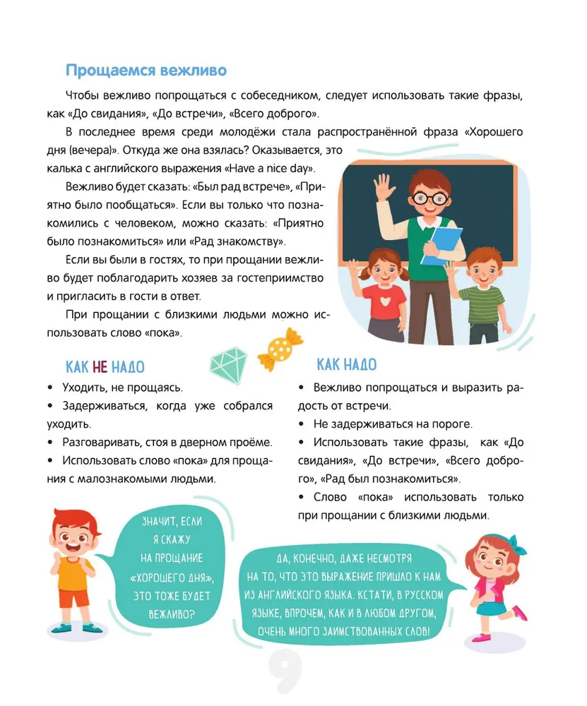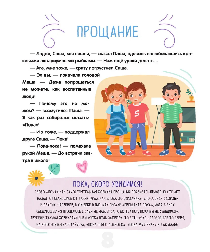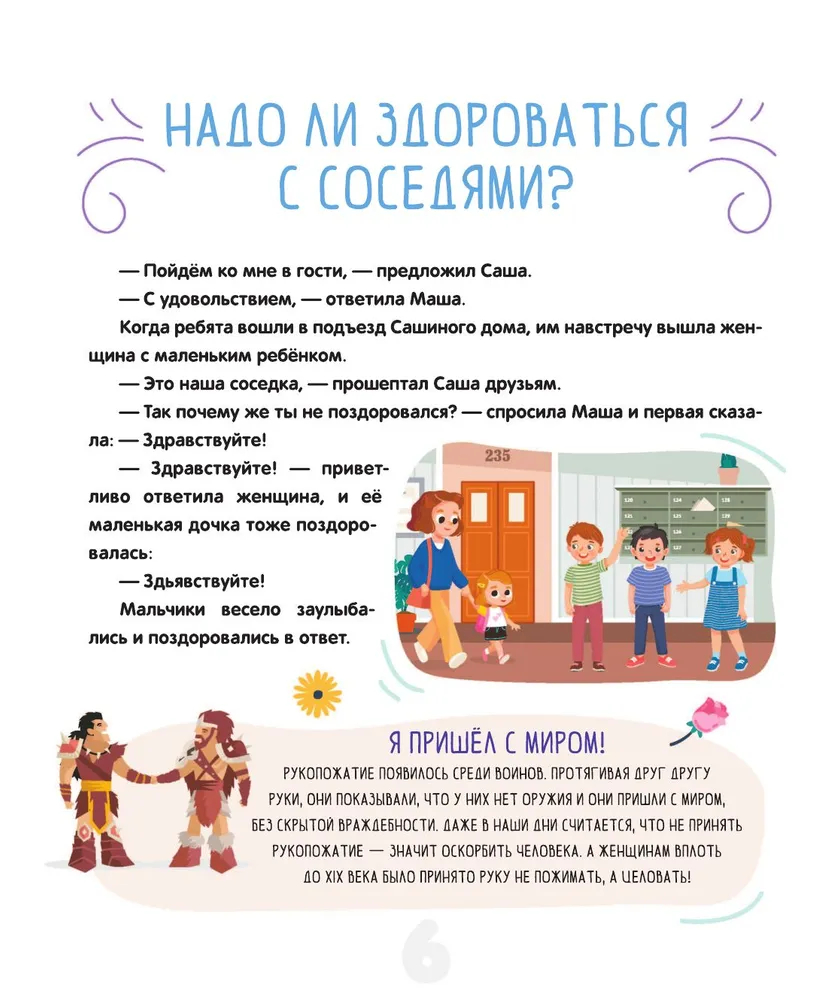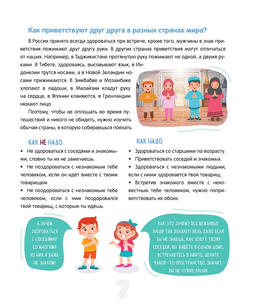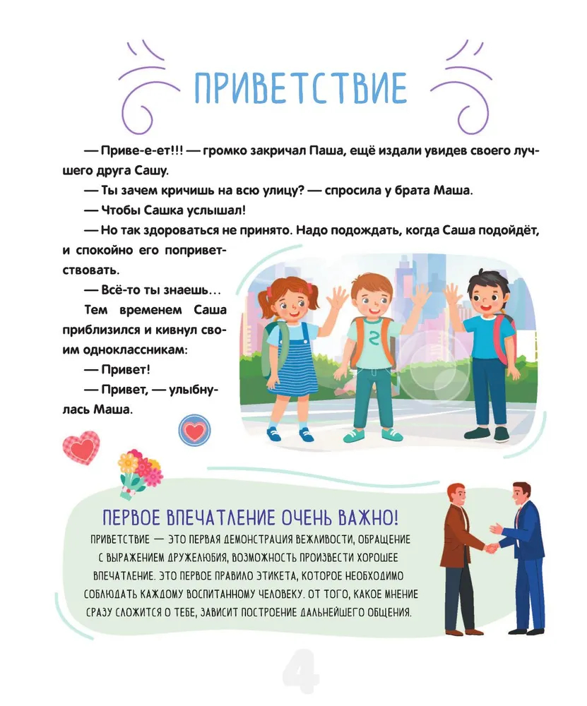 Данная книга – это увлекательное и практичное руководство, которое поможет детям освоить правила этикета и подскажет, как правильно вести себя в различных жизненных ситуациях. В ней они найдут множество интересных историй, примеров и практических советов, которые помогут им разобраться в такой важной сфере, как общение. В нашем непростом мире очень многое зависит от того, как человек выстраивает гармоничные отношения с окружающими, и недаром известная пословица гласит: относись к другим так, как хотел бы, чтобы относились к тебе. Эта книга – не "учебник хороших манер", где просто описываются правила поведения: это практичный путеводитель, который, несомненно, поспособствует всестороннему и гармоничному развитию ребёнка, формированию таких незаменимых качеств и черт характера, как вежливость и воспитанность.