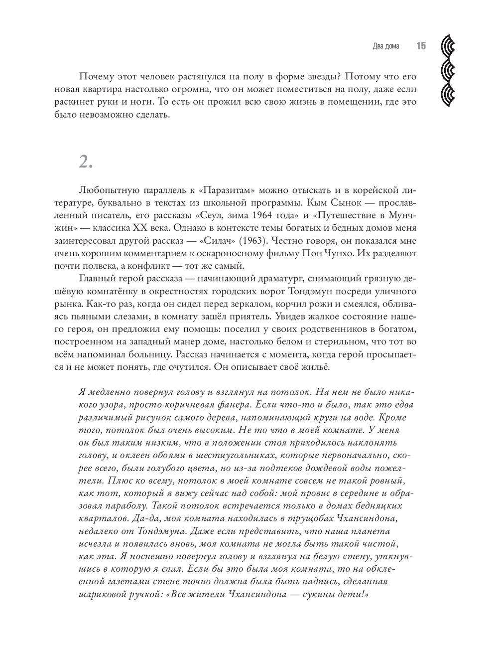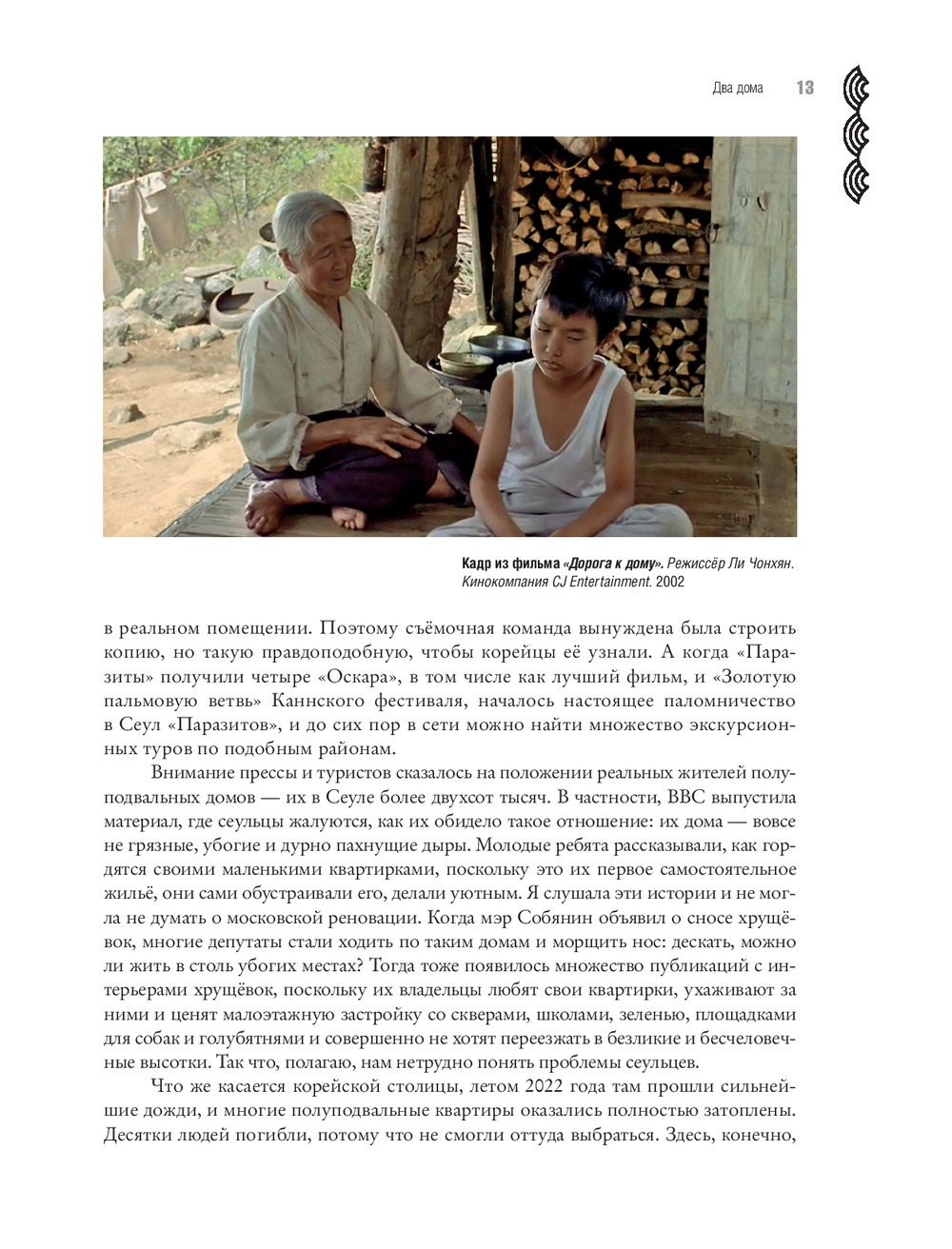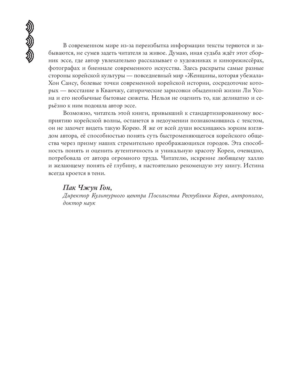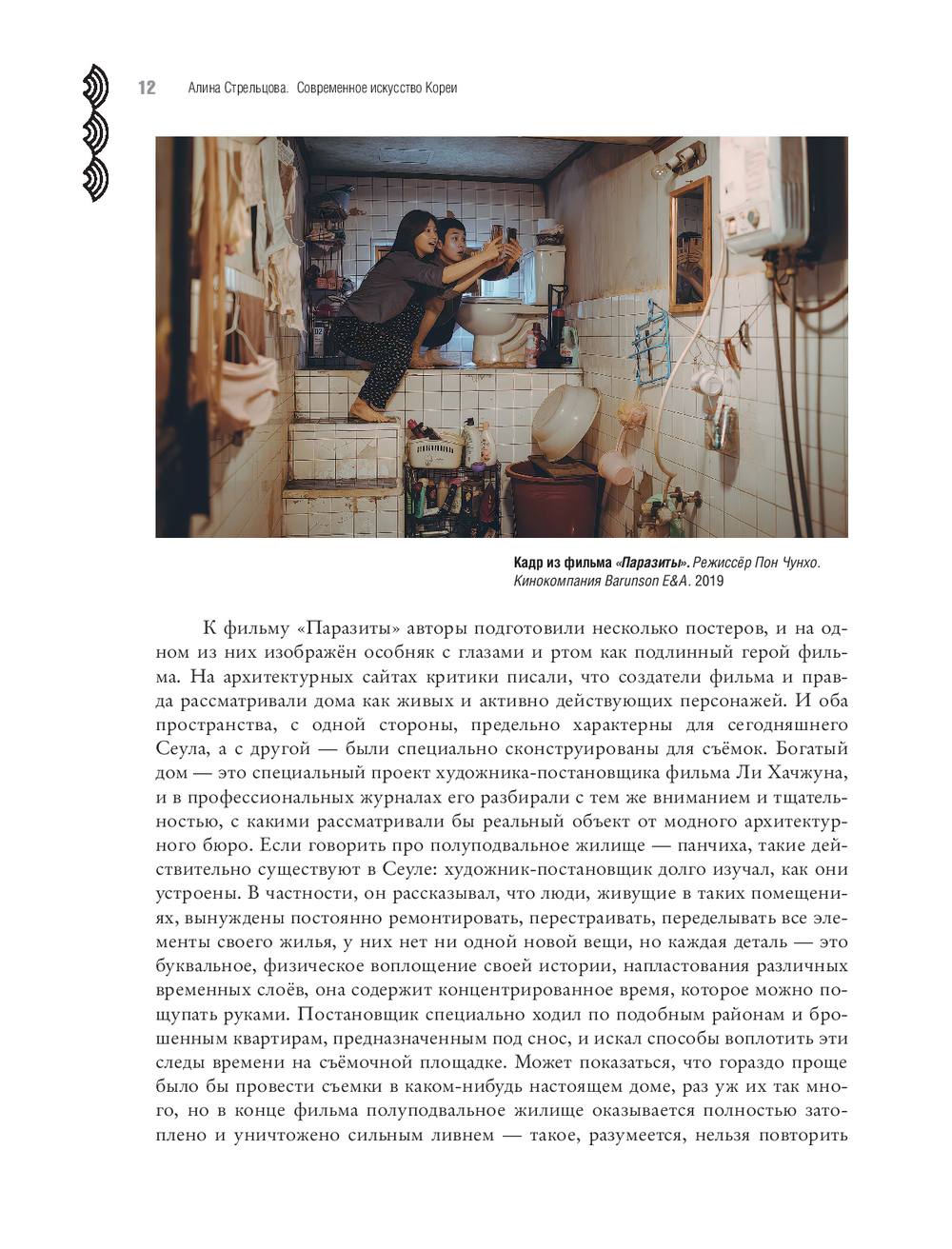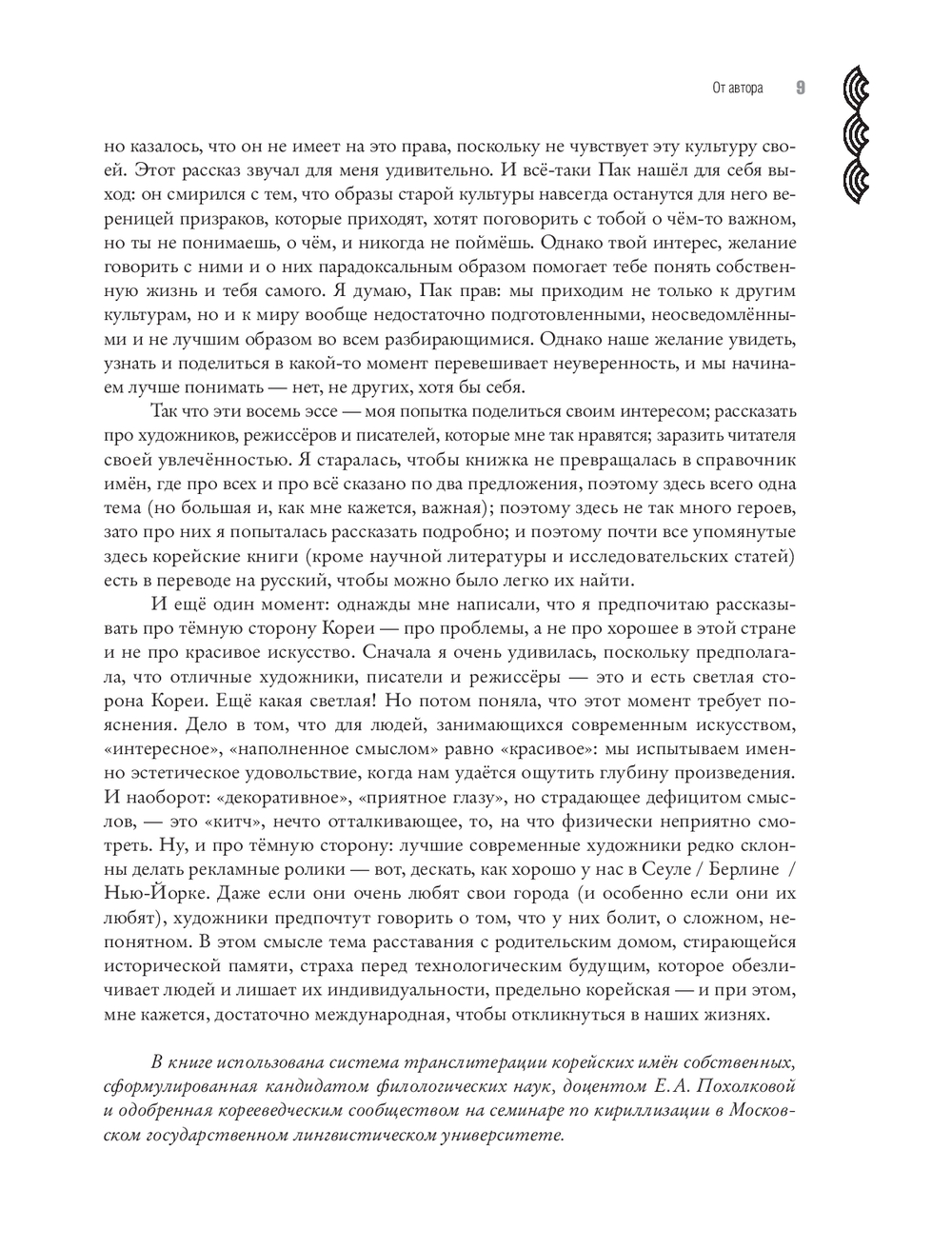 Несмотря на название, эта книга вовсе не претендует на энциклопедичность в описании современного корейского искусства и даже не пытается упомянуть всех заметных художников страны. Напротив, она демонстрирует предельно личный выбор тем и сюжетов, например, рассказывает, как художники смотрят на стремительно растущие и обновляющиеся корейские города и понимают, что тех старых бабушкиных домов, где они выросли, больше нет. А именно туда им хочется вернуться. О том, как в восьмидесятые годы художники ели крекеры со связанными руками, а самый первый корейский перформанс, предполагающий полноценное участие аудитории, состоял в совместном со зрителями распивании рисовой бражки макколи и поедании закусок панчханов, да и сейчас мы видим, как у знаменитого режиссёра Хон Сансу его актёры на экране просто едят, пьют и разговаривают ни о чём.