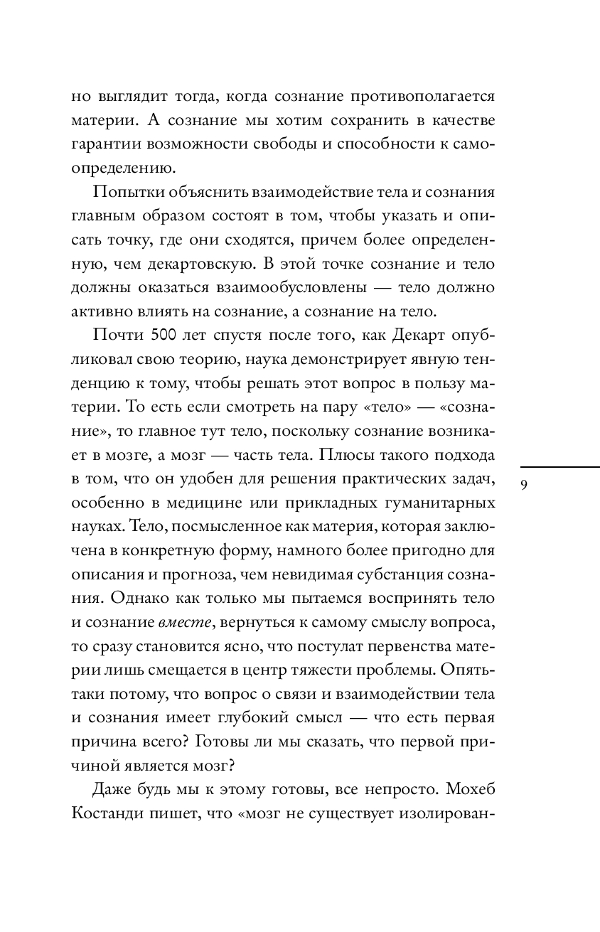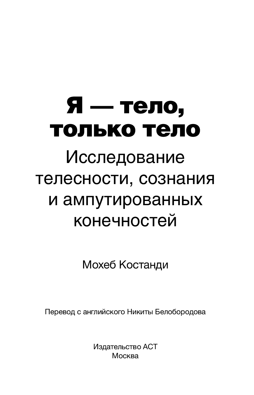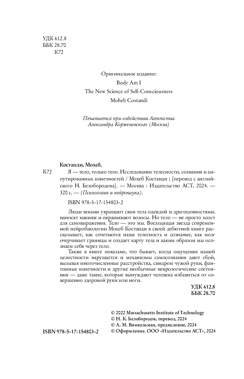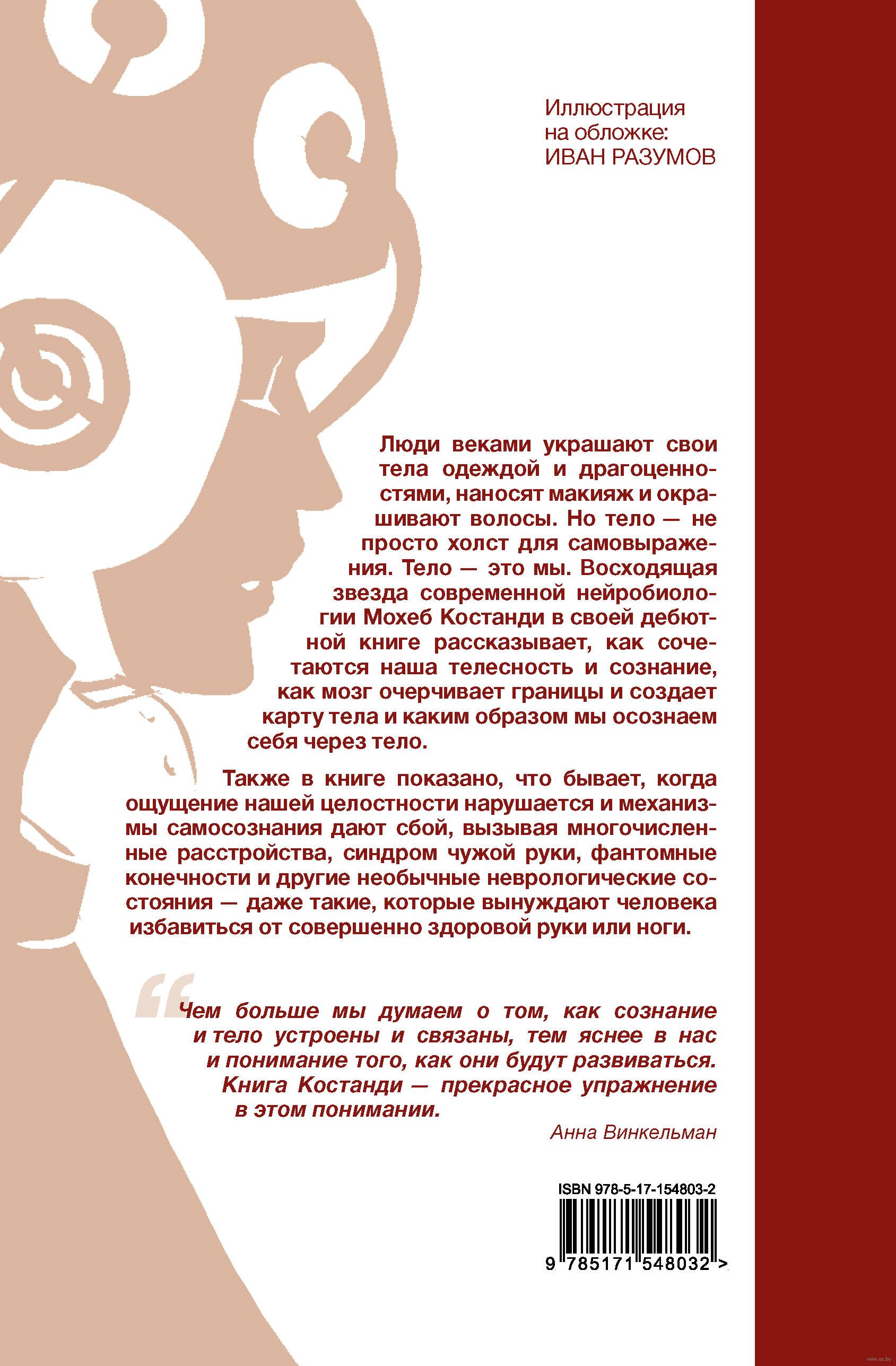 Люди веками украшают свои тела одеждой и драгоценностями, наносят макияж и окрашивают волосы. Но тело – не просто холст для самовыражения. Тело – это мы. Восходящая звезда современной нейробиологии Мохеб Костанди в своей дебютной книге рассказывает, как сочетаются наша телесность и сознание, как мозг очерчивает границы и создает карту тела и каким образом мы осознаем себя через тело.