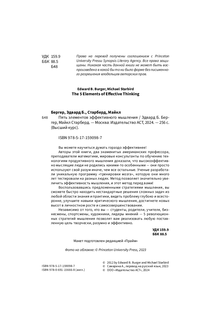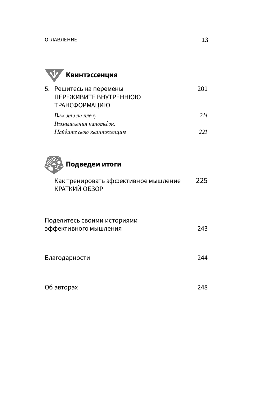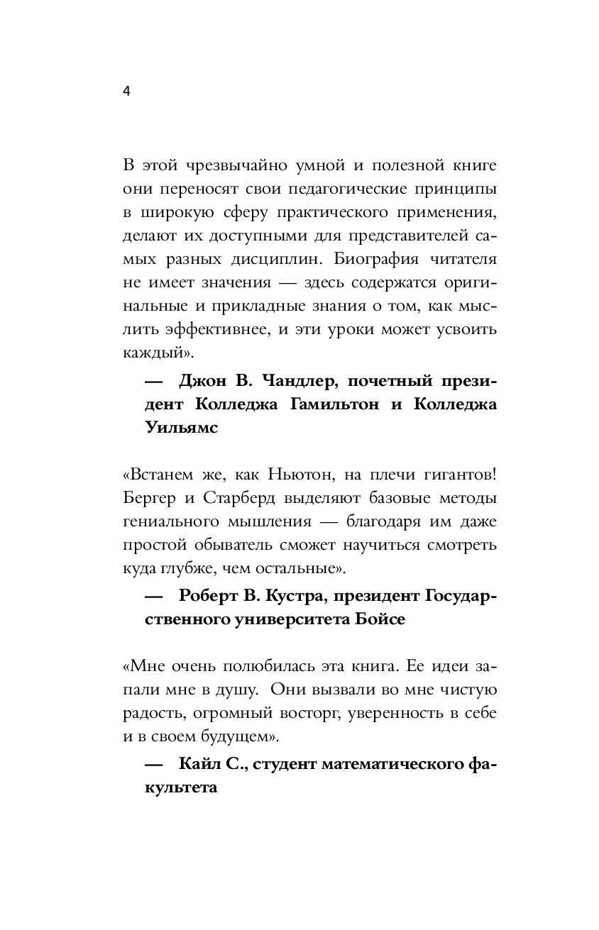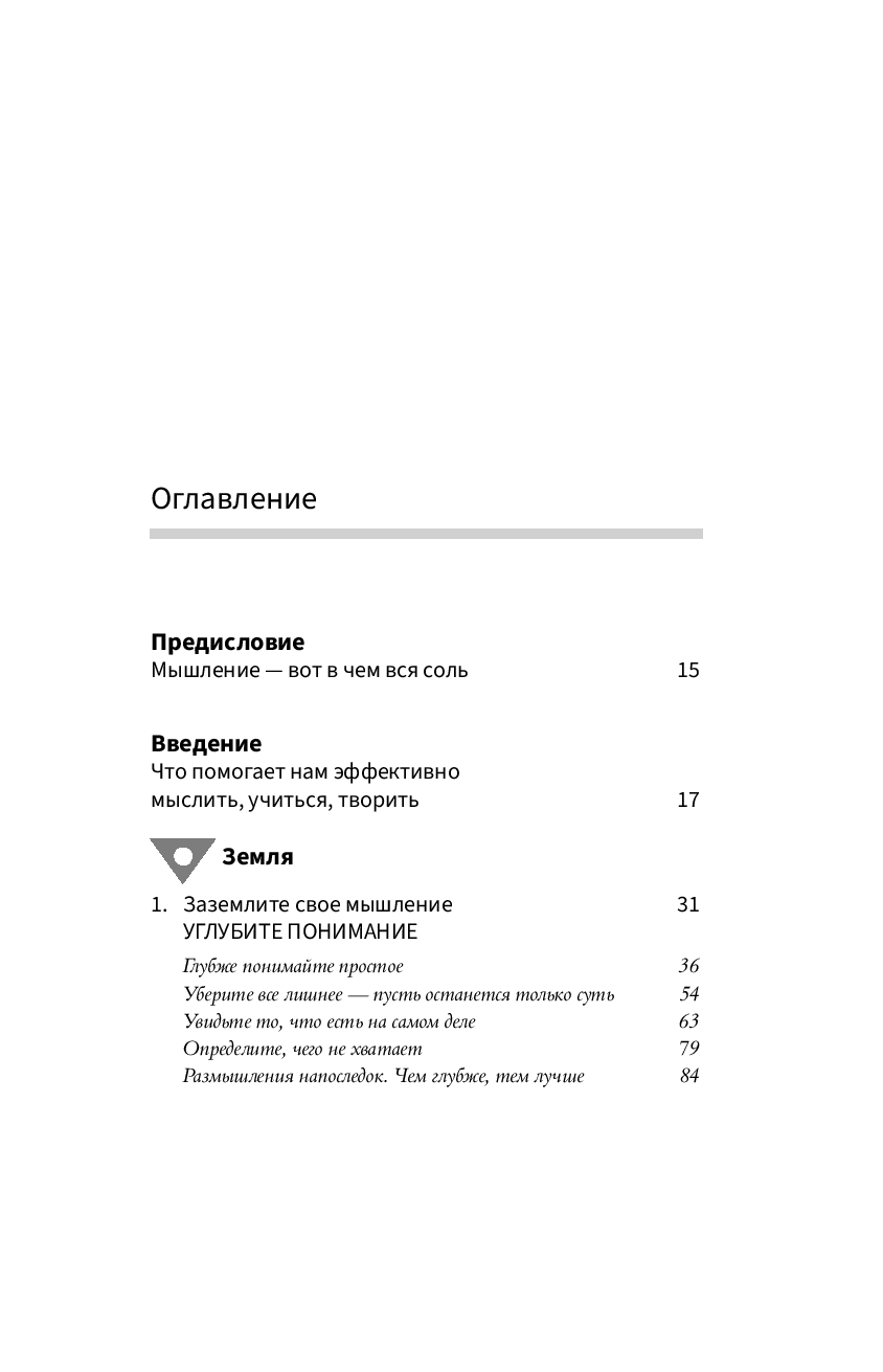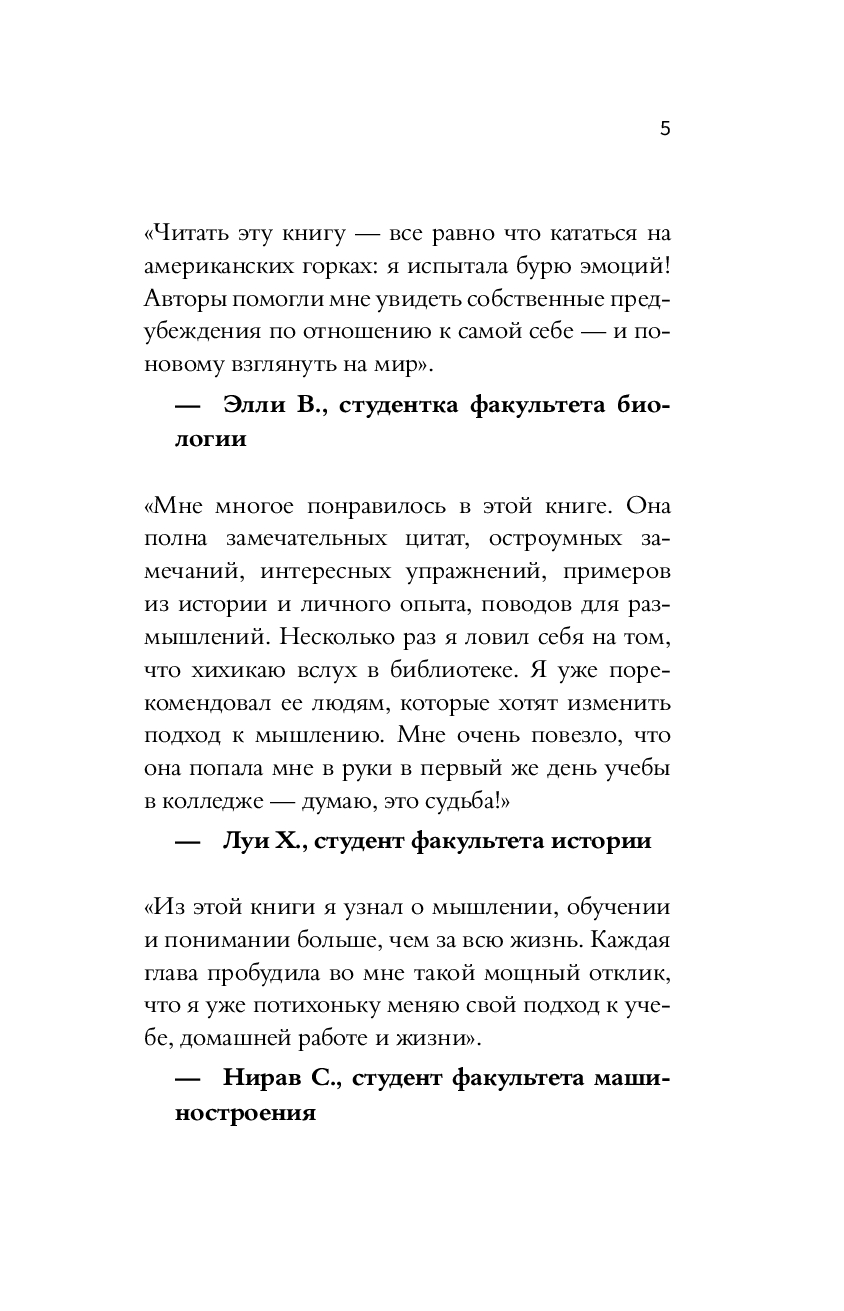 А потому вовсе не удивительно, что эффективность мышления – залог успеха студентов, профессионалов, бизнес-гуру, художников, писателей, политиков и каждого из нас в повседневной жизни. Эффективное мышление необходимо и для совершенствования любых навыков – без него не прийти к новаторским идеям, не решить сложных задач новыми способами, не увидеть скрытые возможности, не приняться за дело. Как это ни удивительно, базовые методы, которые учат мыслить яснее, оригинальнее и эффективнее, по сути, одинаковы для всех сфер нашей жизни! Более того, эти самые методы можно описать и освоить. Врожденный талант, которым наделены лишь избранные, здесь ни при чем, и не нужно быть гением, чтобы научиться эффективному мышлению. Каждому из нас под силу изучить и применять эти стратегии, и наша книга как раз об этом – о пяти мыслительных привычках, которые можно использовать в повседневной жизни. Они многих вдохновили на движение к успеху. Надеемся, что и вы его добьетесь.