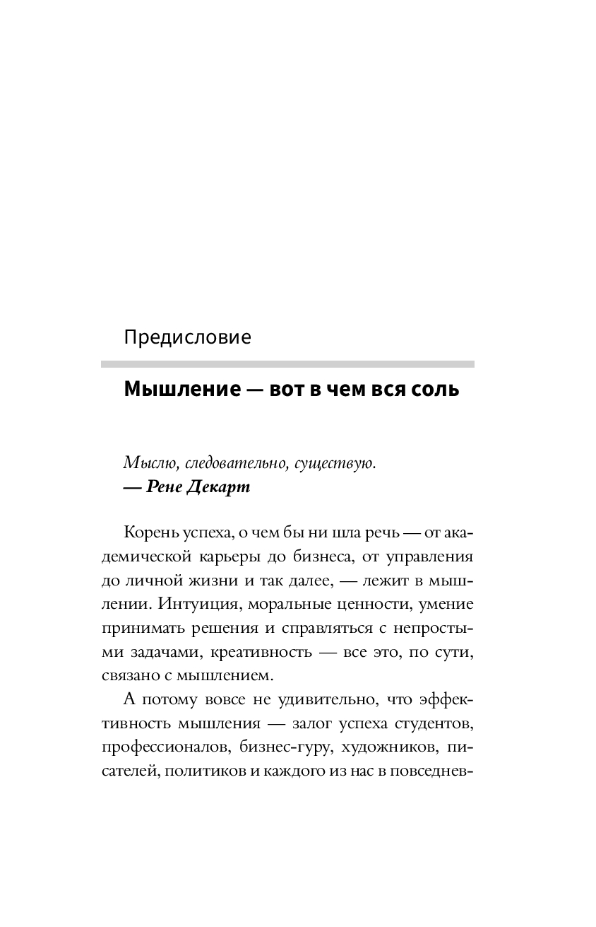 Корень успеха, о чем бы ни шла речь, – от академической карьеры до бизнеса, от управления до личной жизни, – лежит в мышлении. Интуиция, моральные ценности, умение принимать решения и справляться с непростыми задачами, креативность – все это, по сути, связано с мышлением.
