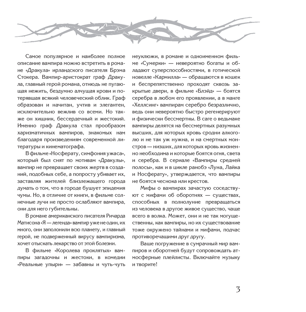 Вампиры. Упыри. Вурдалаки. Кровососущие жуткие порождения тьмы или утонченные аристократы с изысканными манерами и инфернальной сущностью. Разные культурные традиции подчас наделяли вампиров прямо противоположными способностями, но всех их объединяет одно – жажда человеческой крови, и, возможно, именно это делает их столь притягательными и завораживающими для смертных.