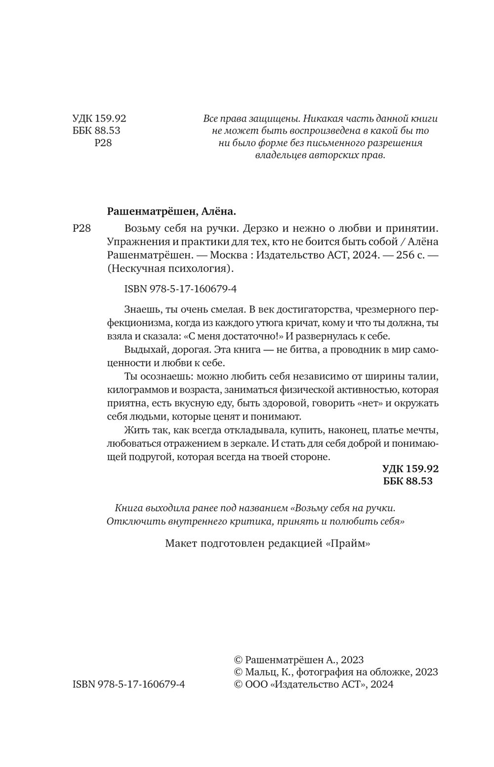 Книга "Возьму себя на ручки" – для тех, кто устал заглушать внутренний голос, чтобы прислушиваться к чужим голосам. Выдыхай, дорогая. Эта книга – не битва, а проводник в мир самоценности и любви к себе.
