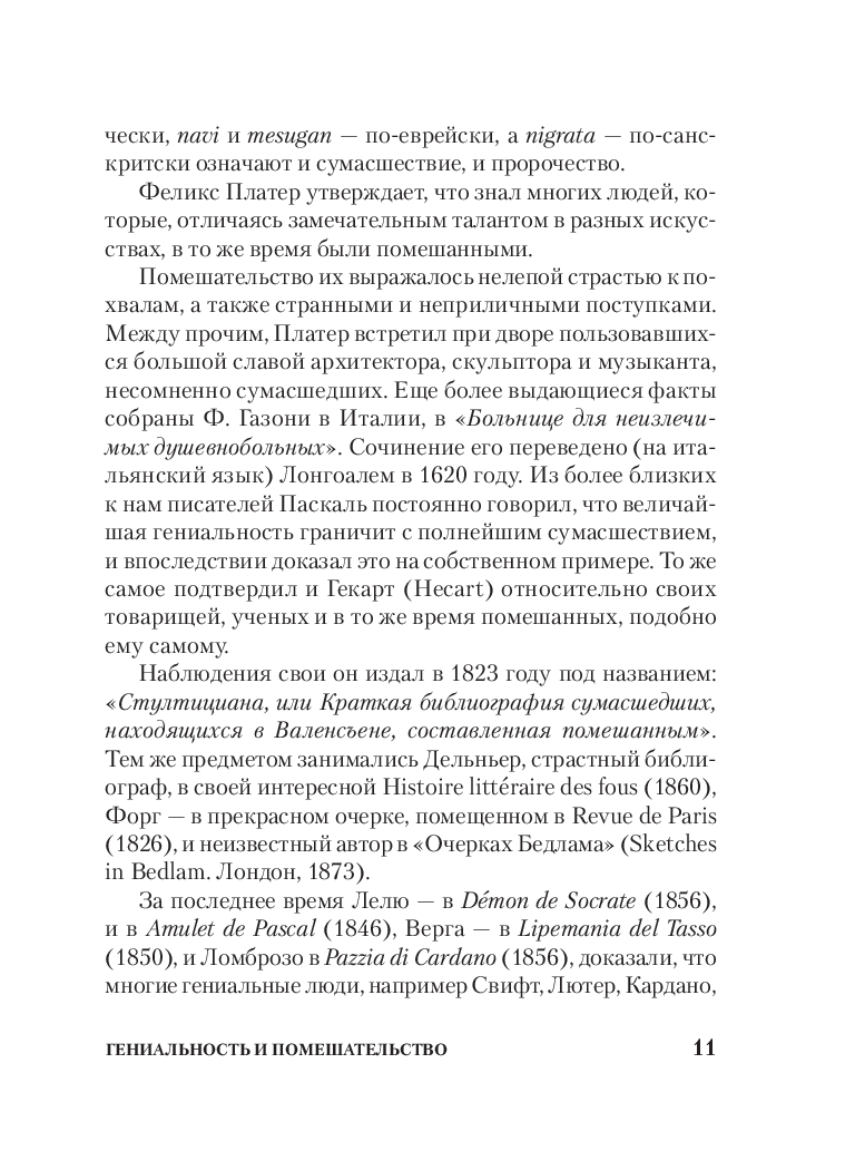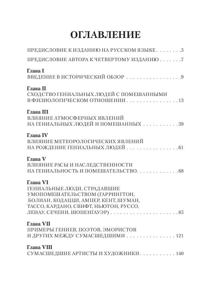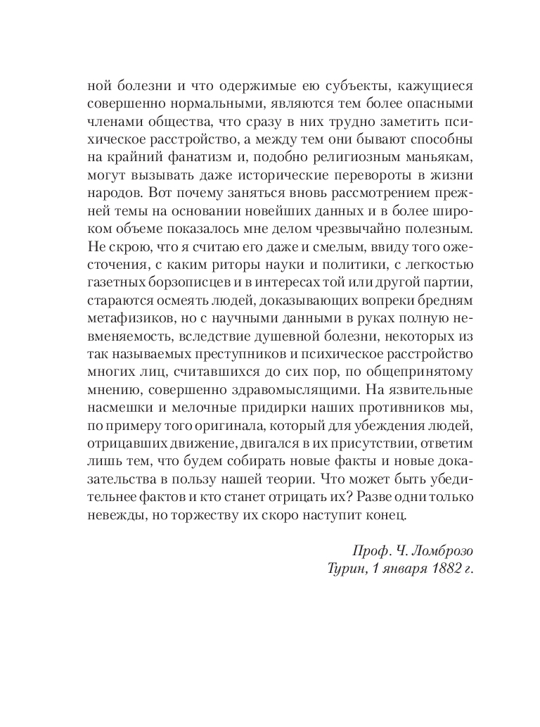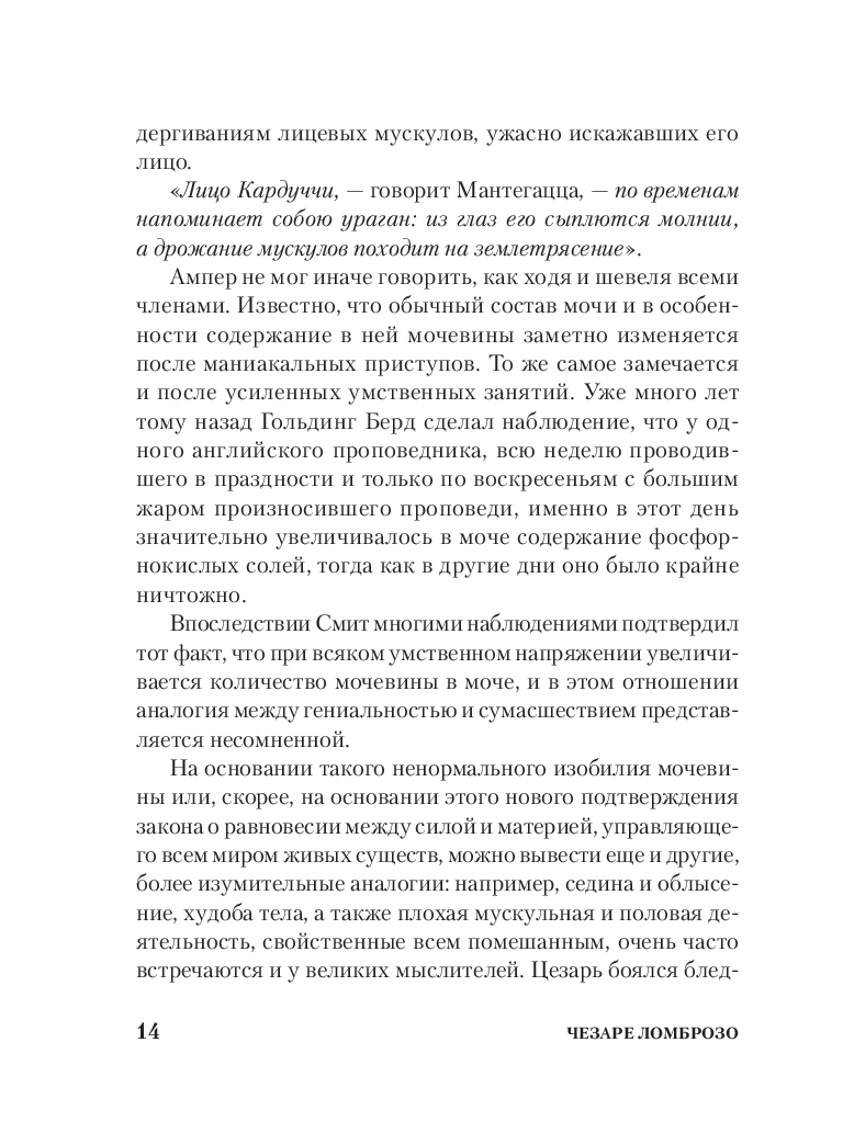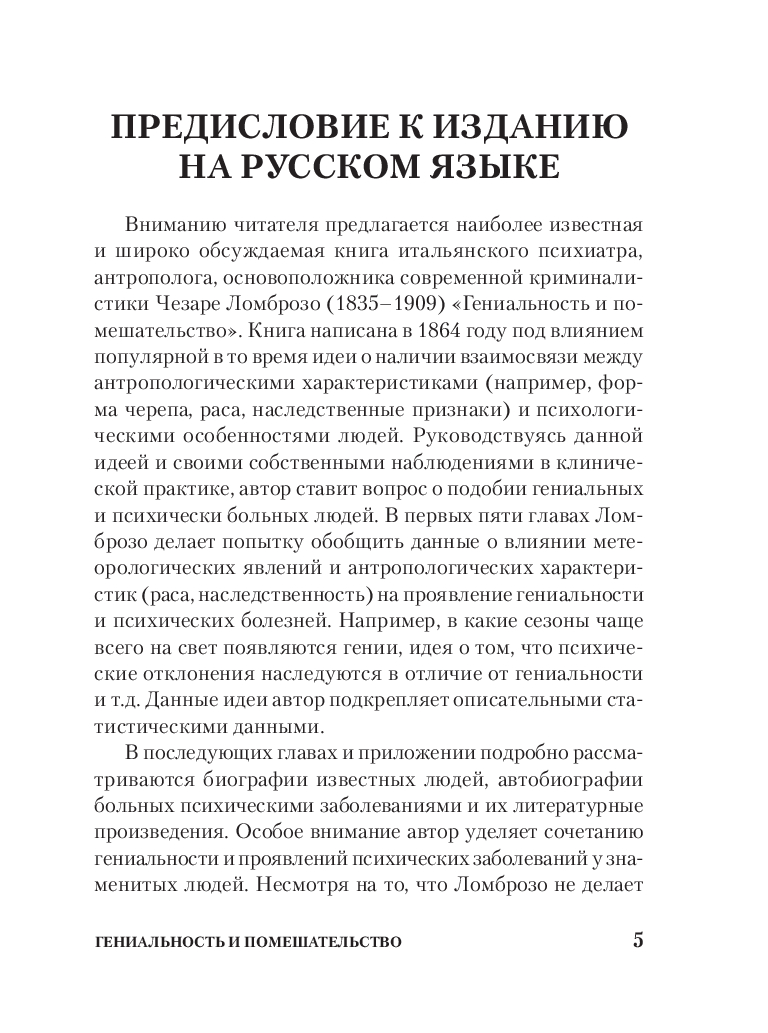 Чезаре Ломброзо (1835-1909) – профессор юридической психиатрии и криминальной антропологии. В своем труде автор рассматривает сходство гениальных людей с сумасшедшими с разных точек зрения: с физиологической, психической и даже погодных условий. На примере величайших ученых, писателей и художников автор рассматривает характерные признаки гениальности и сумасшествия.