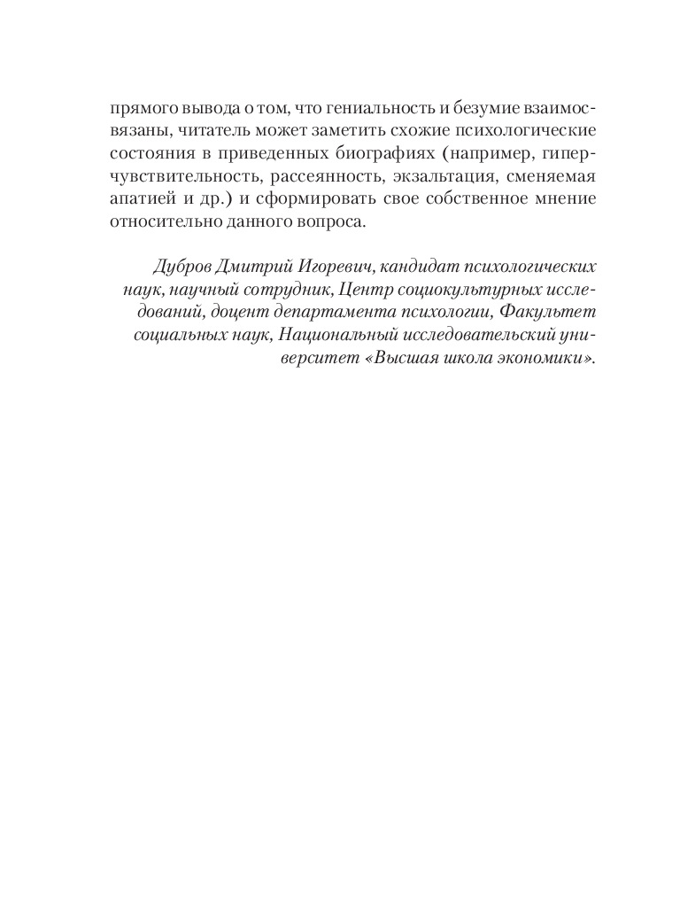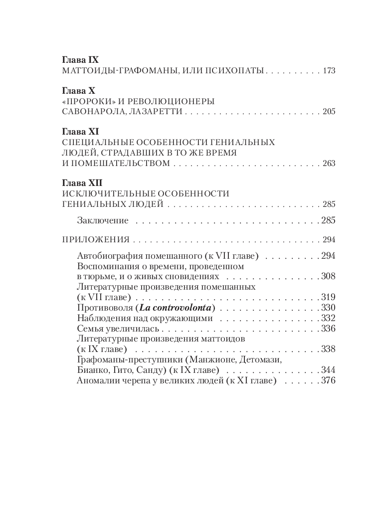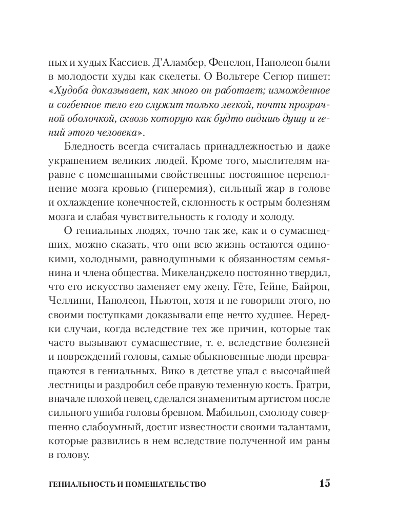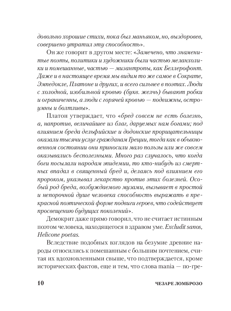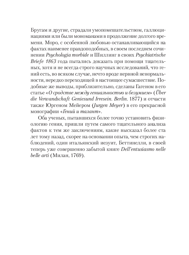 Чезаре Ломброзо (1835-1909) – профессор юридической психиатрии и криминальной антропологии. В своем труде автор рассматривает сходство гениальных людей с сумасшедшими с разных точек зрения: с физиологической, психической и даже погодных условий. На примере величайших ученых, писателей и художников автор рассматривает характерные признаки гениальности и сумасшествия.