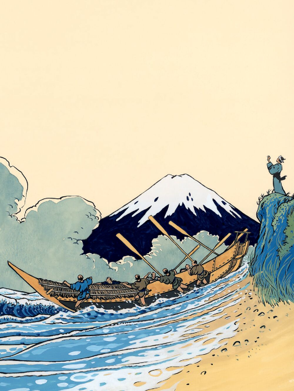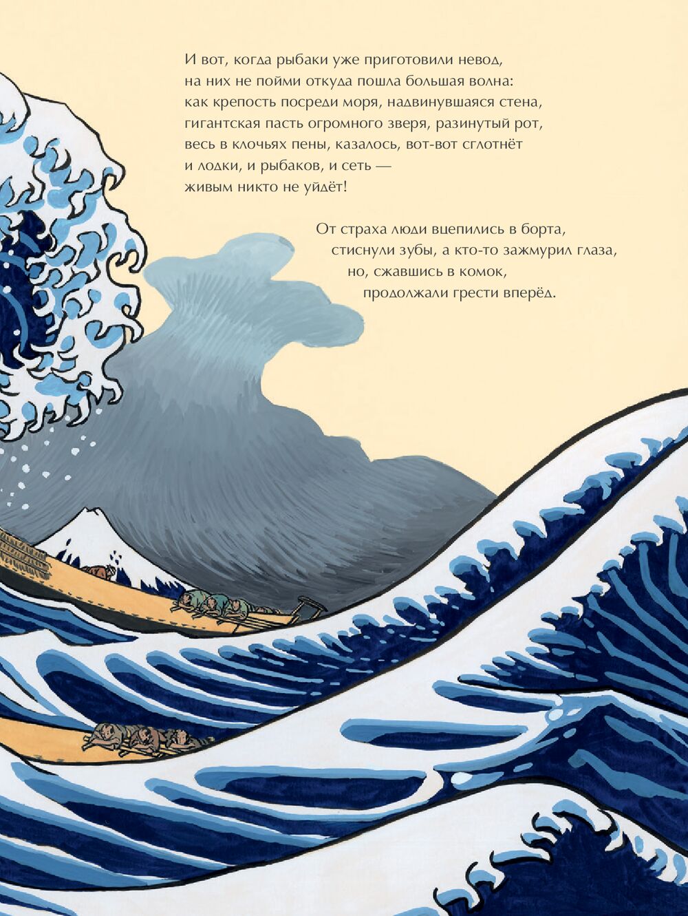 Эту поэтичную историю автор и иллюстратор создали под впечатлением от знаменитой гравюры Хокусая "Большая волна в Канагаве".