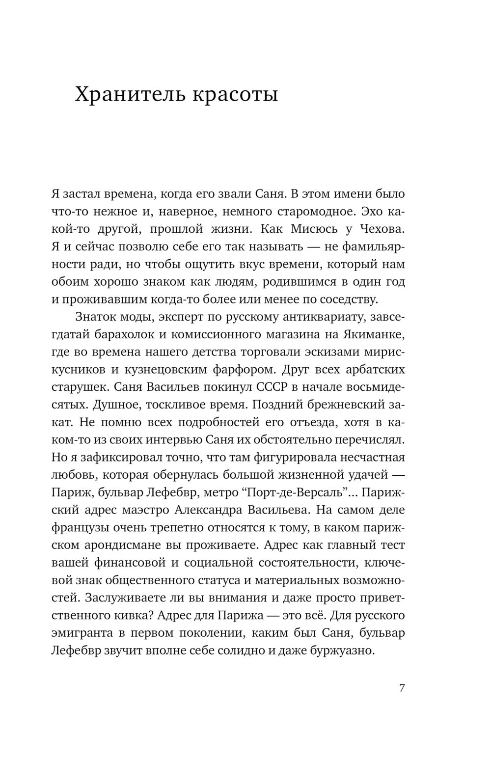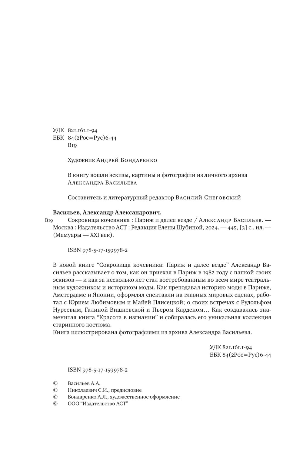 В новой книге "Сокровища кочевника: Париж и далее везде" Александр Васильев рассказывает о том, как он приехал в Париж в 1982 году с папкой своих эскизов – и как за несколько лет стал востребованным во всем мире театральным художником и историком моды; как преподавал историю моды в Париже, Южной Америке и Японии, оформлял спектакли на лучших мировых сценах, работал с Юрием Любимовым и Майей Плисецкой; о своих встречах с Рудольфом Нуреевым, Галиной Вишневской и Пьером Карденом, о дружбе с эмигрантами первой волны, среди которых художники Ростислав Добужинский, Дмитрий Бушен, Эрте, аристократы, балерины и манекенщицы...