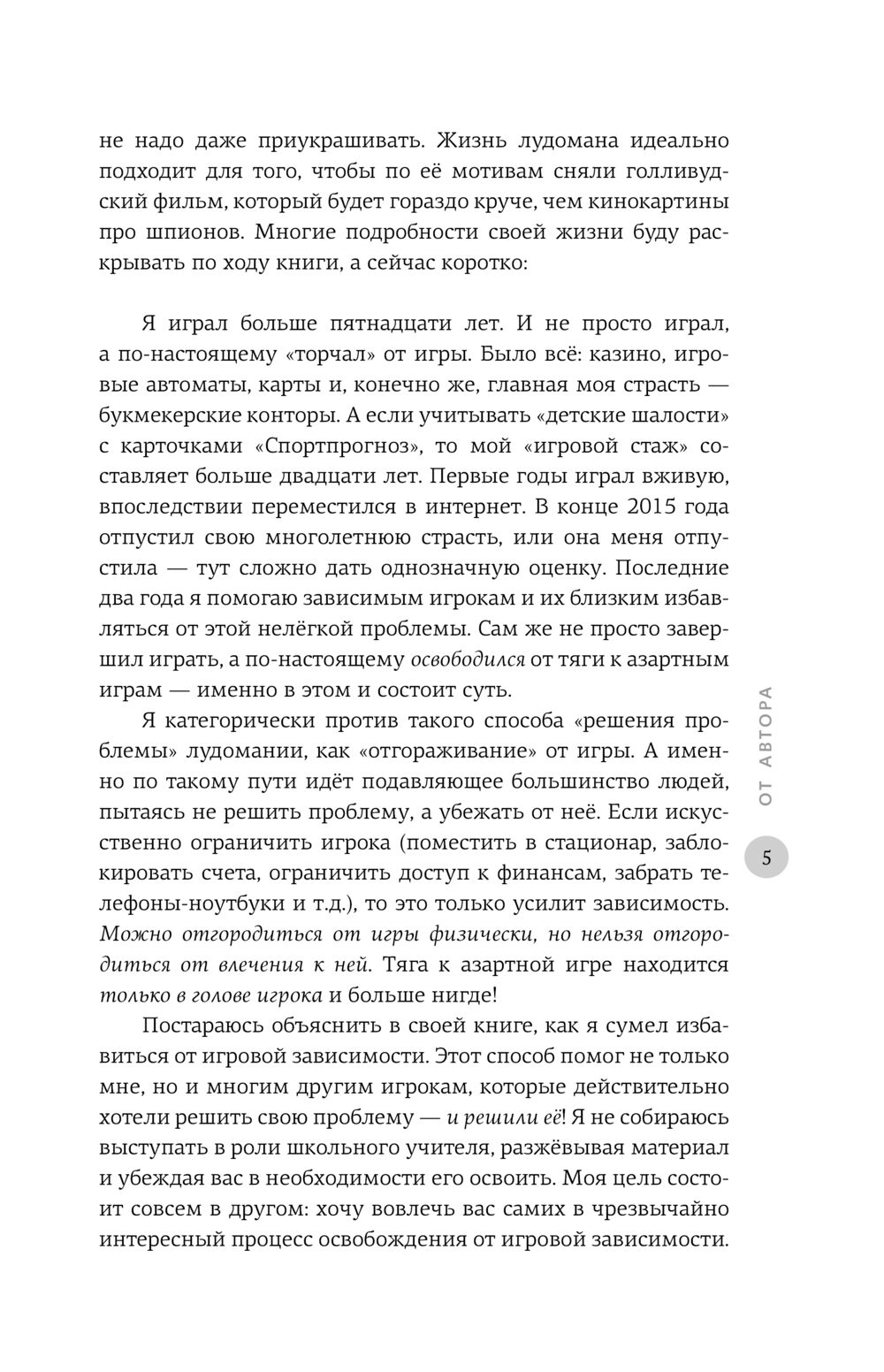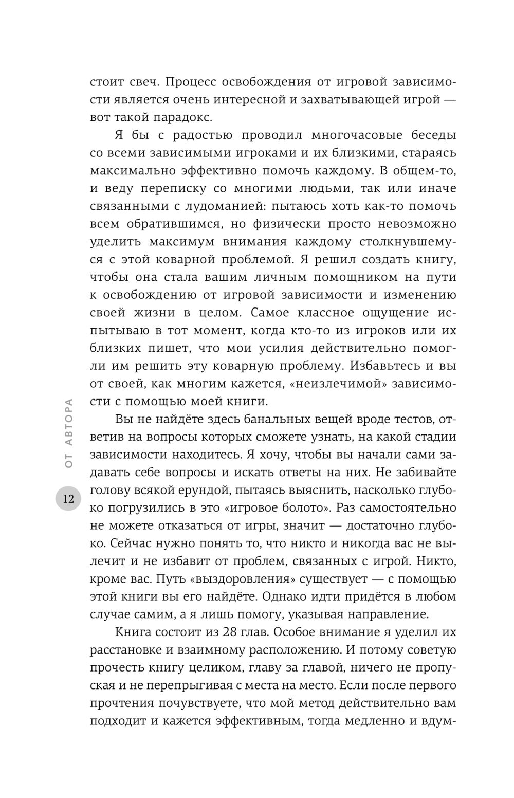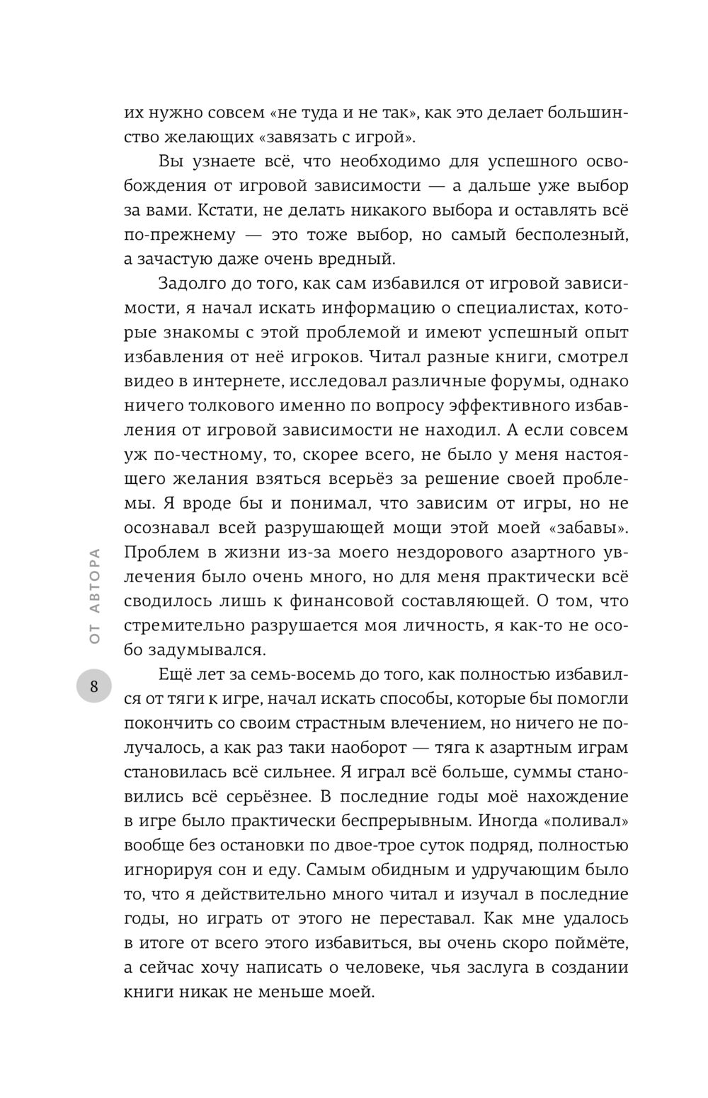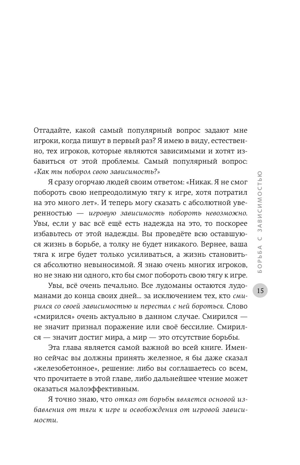 Эта книга – ваш личный помощник на пути к освобождению от игровой зависимости и изменению жизни в целом. Вы не найдёте в ней банальных вещей вроде тестов, определяющих степень тяжести вашей зависимости, или волшебных "врачебных" методик. Только полезные рекомендации, которые помогут вам изменить мышление и стать абсолютно равнодушным к азартной игре человеком.