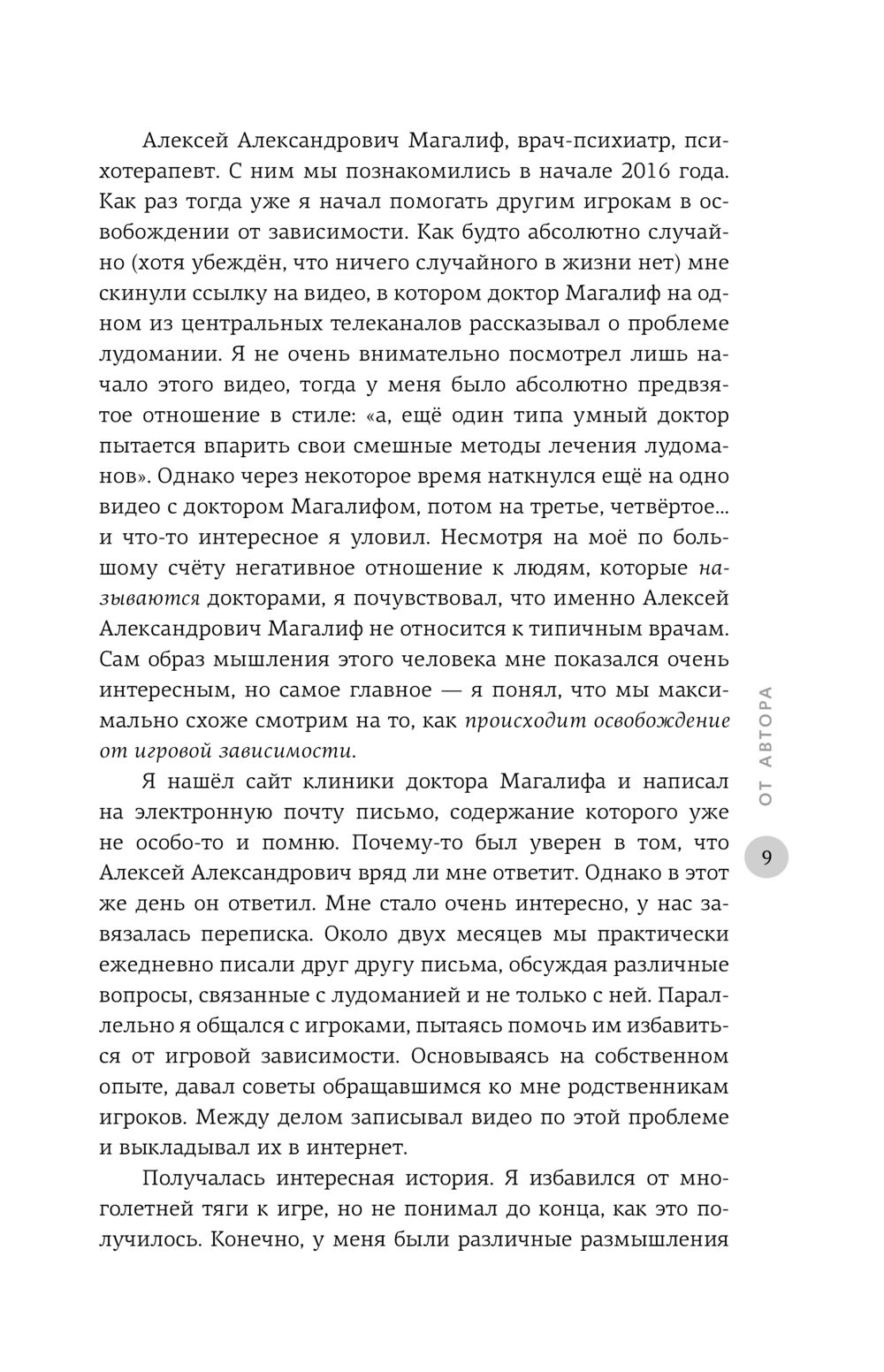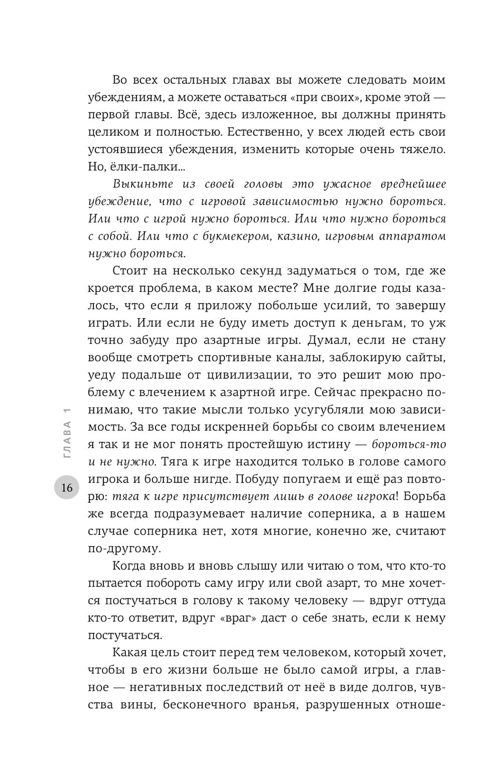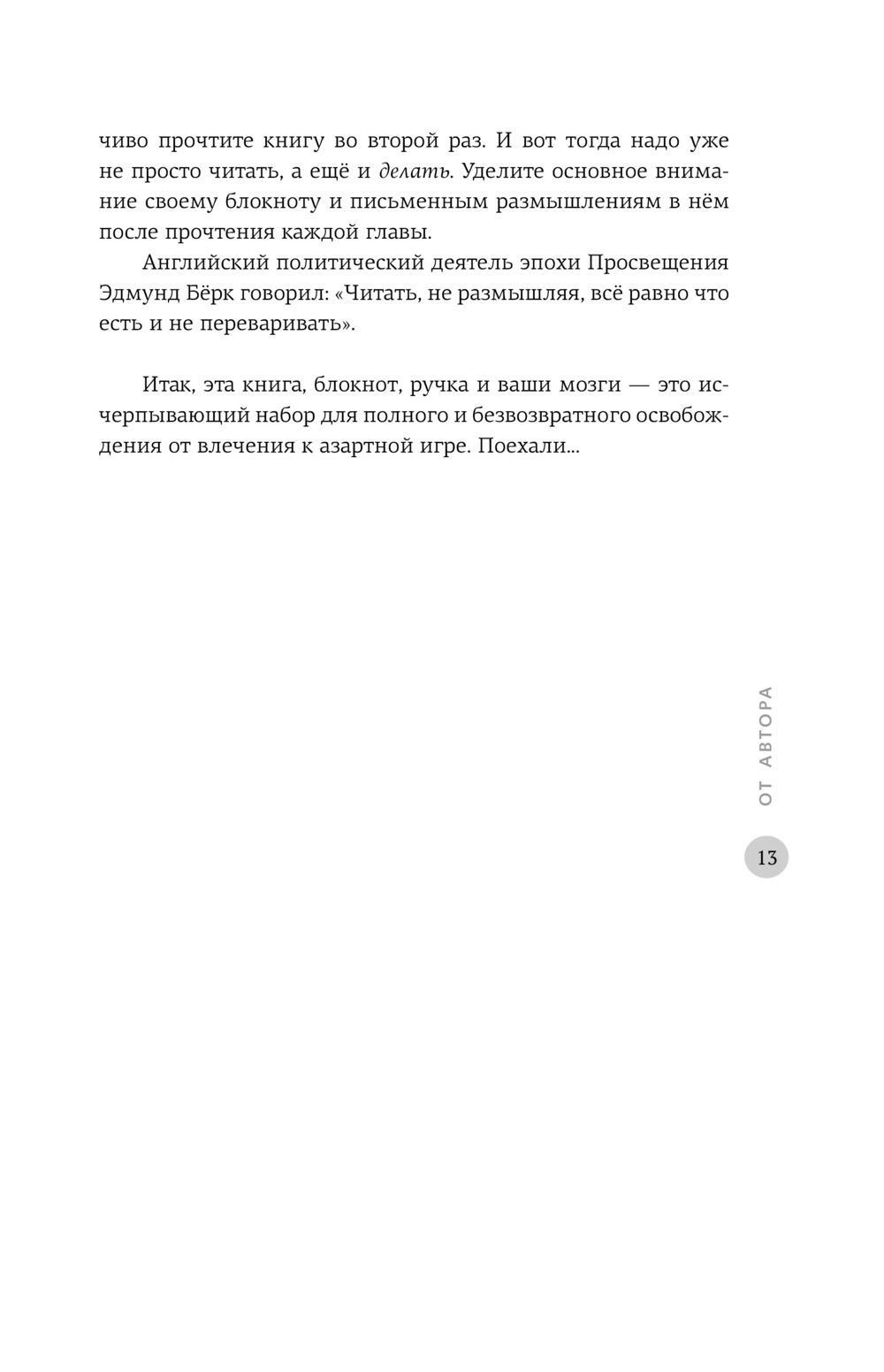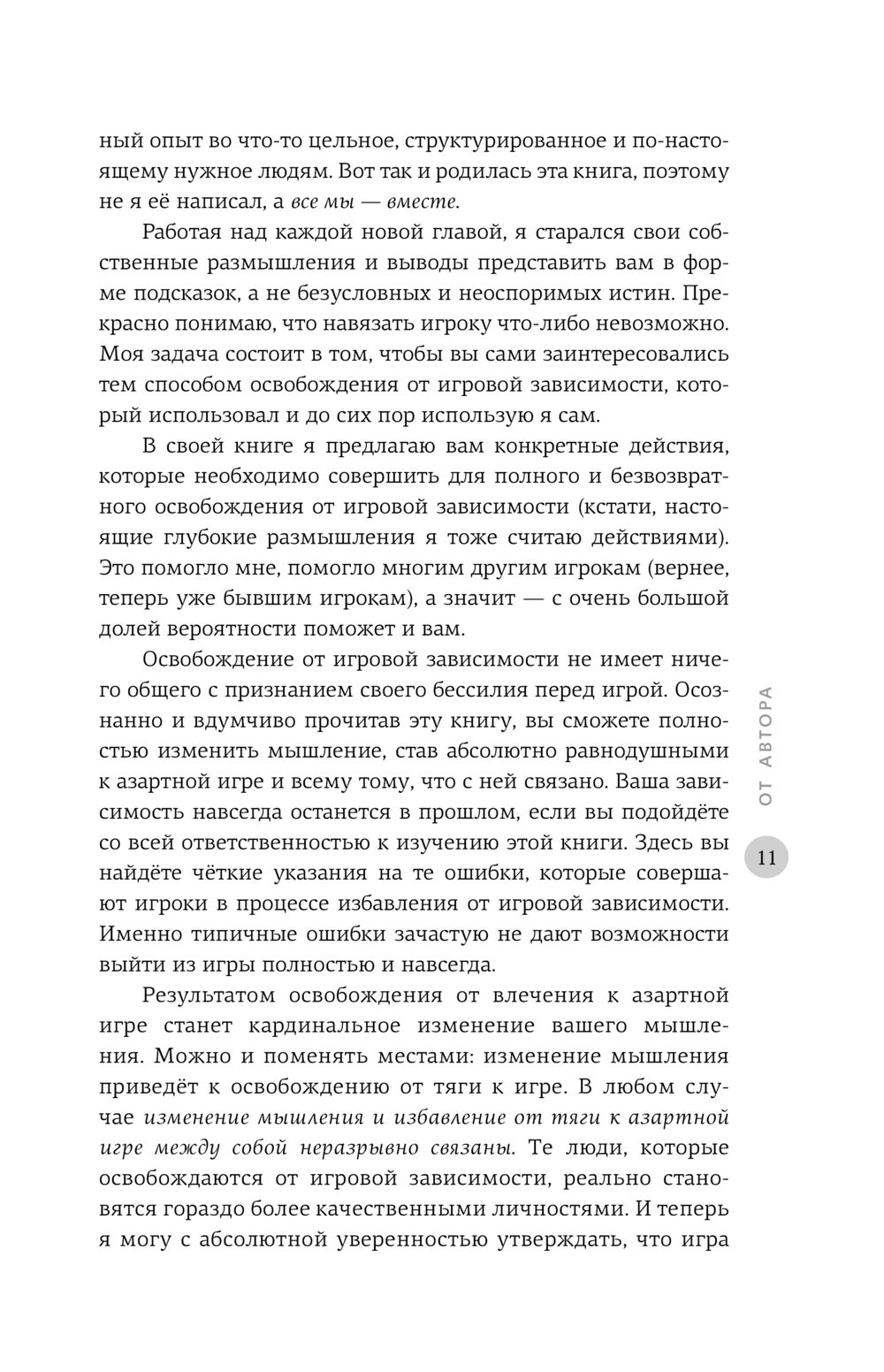 Эта книга – ваш личный помощник на пути к освобождению от игровой зависимости и изменению жизни в целом. Вы не найдёте в ней банальных вещей вроде тестов, определяющих степень тяжести вашей зависимости, или волшебных "врачебных" методик. Только полезные рекомендации, которые помогут вам изменить мышление и стать абсолютно равнодушным к азартной игре человеком.