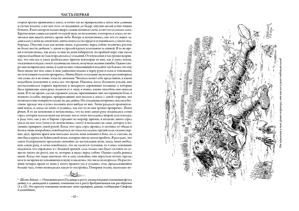 Книга прекрасно иллюстрирована рисунками известного английского книжного графика Чарльза Эдмунда Брока. Точность его рисунков позволяет увидеть созданные Свифтом миры во всем объеме их мельчайших деталей.