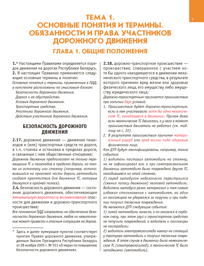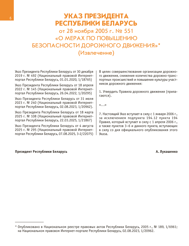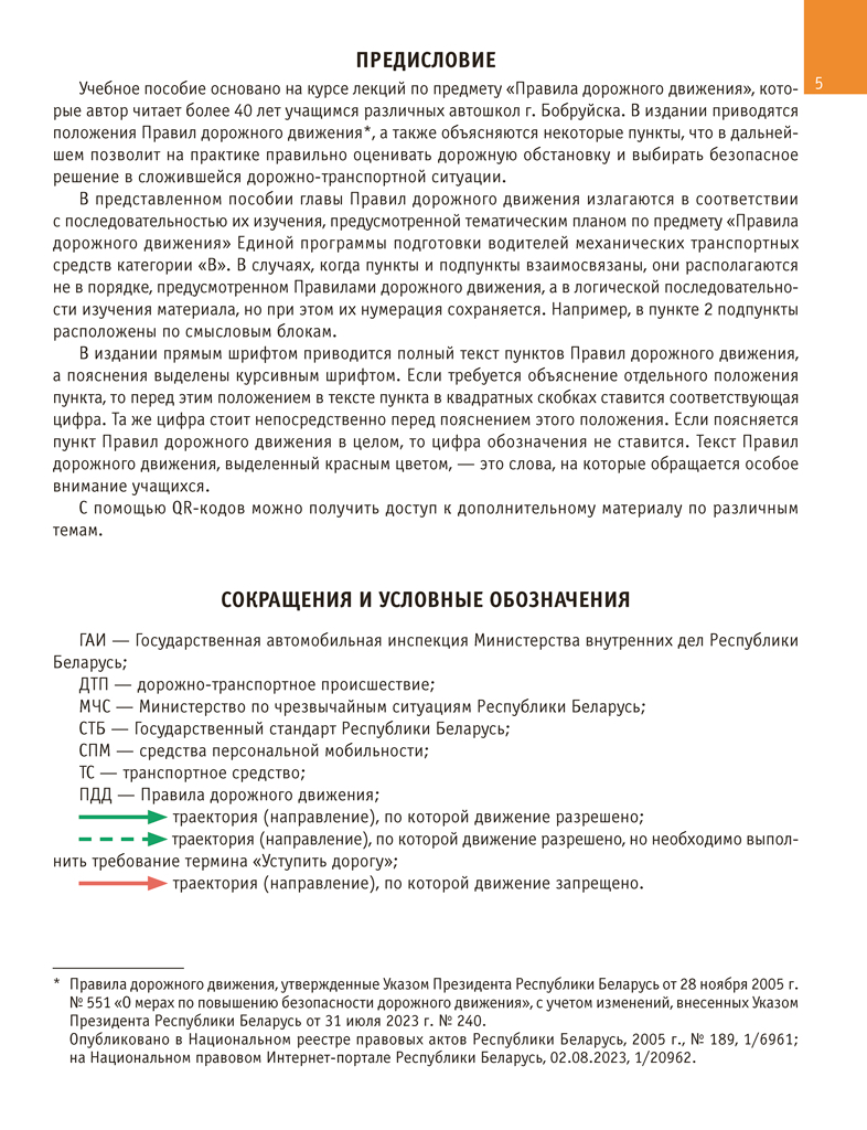 Учебное пособие разработано на основании Правил дорожного движения, утвержденных Указом Президента Республики Беларусь от 28 ноября 2005 г. № 551 "О мерах по повышению безопасности дорожного движения", с изменениями, внесенными Указом Президента Республики Беларусь от 4 августа 2025 г. № 295 "Об изменении Указа Президента Республики Беларусь", и в соответствии с Единой программой подготовки водителей механических транспортных средств категории "В", утвержденной постановлением Министерства транспорта и коммуникаций Республики Беларусь от 23 октября 2012 г. № 47 (с изменениями, внесенными постановлением Министерства транспорта и коммуникаций Республики Беларусь от 17 сентября 2024 г. № 83).