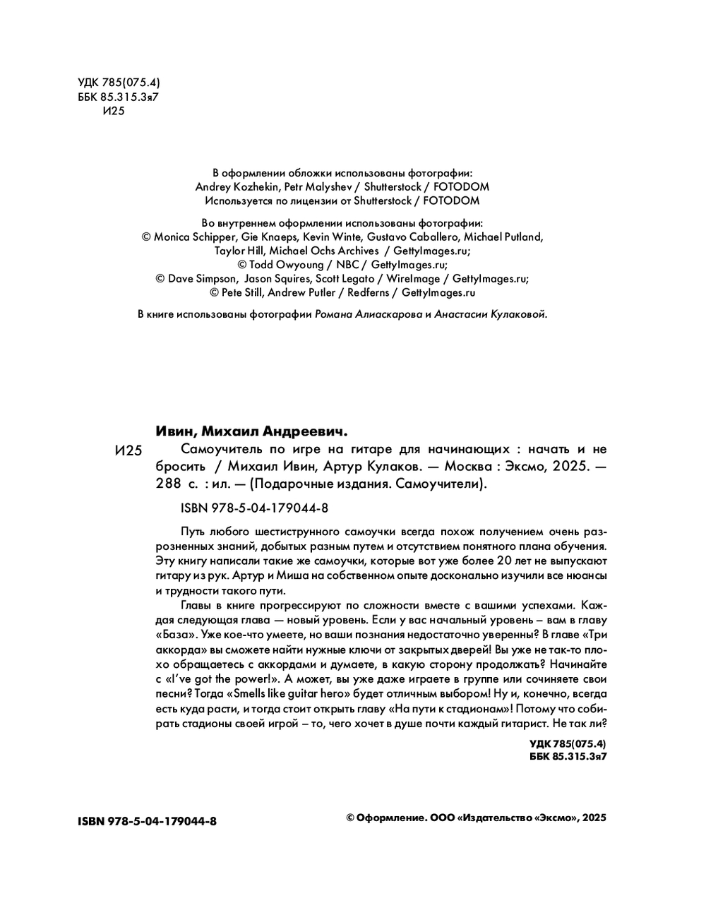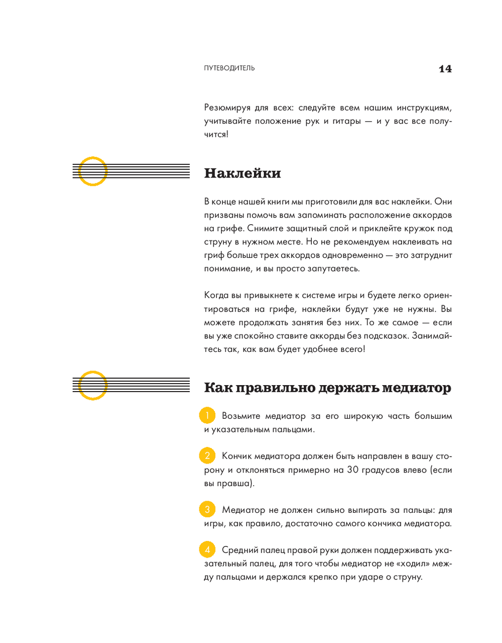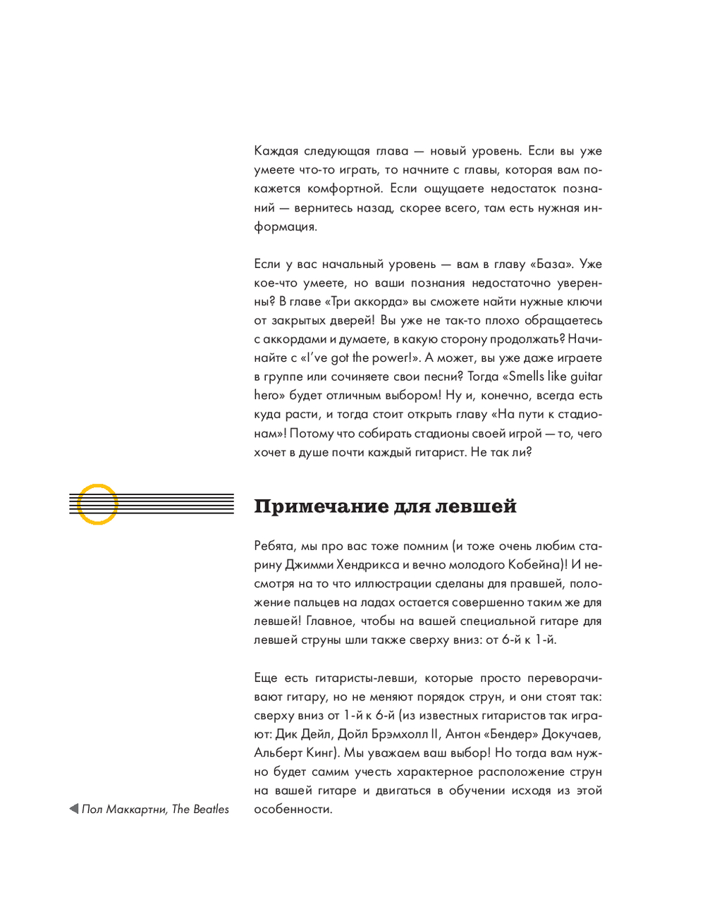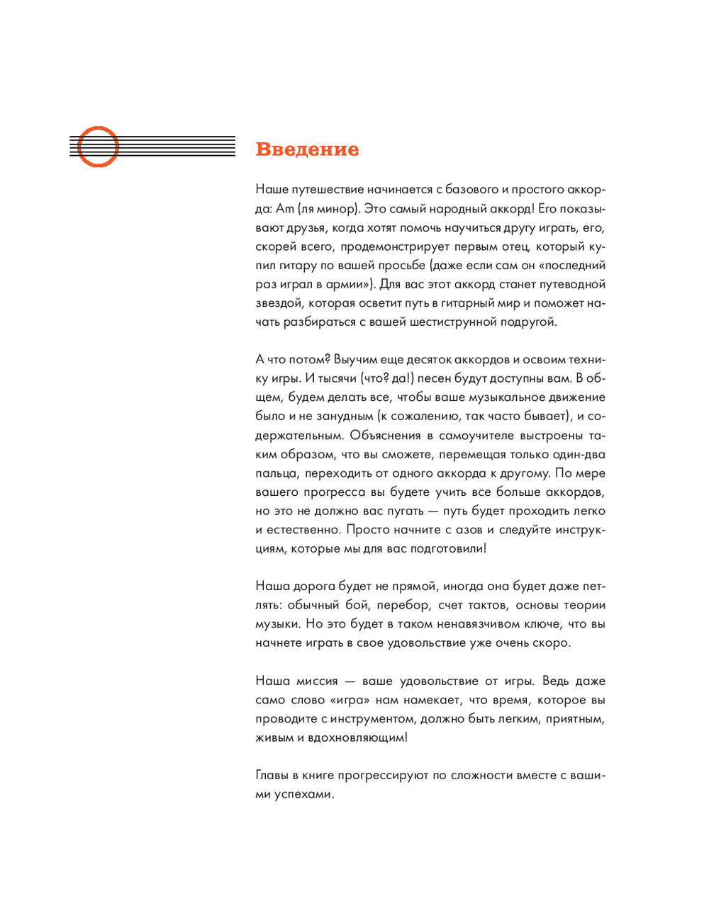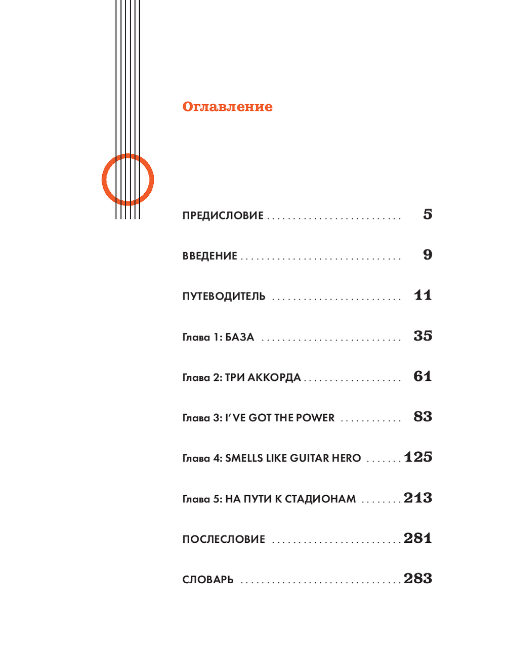 Главы в книге прогрессируют по сложности вместе с вашими успехами. Каждая следующая глава – новый уровень. Если у вас начальный уровень – вам в главу "База". Уже кое-что умеете, но ваши познания недостаточно уверенны? В главе "Три аккорда" вы сможете найти нужные ключи от закрытых дверей! Вы уже не так-то плохо обращаетесь с аккордами и думаете в какую сторону продолжать? Начинайте с "I've got the power!". А может, вы уже даже играете в группе или сочиняете свои песни? Тогда "Smells like guitar hero" будет отличным выбором! Ну, и конечно, всегда есть куда расти, и тогда стоит открыть главу "На пути к стадионам"! Потому что собирать стадионы своей игрой – то, чего хочет в душе почти каждый гитарист. Не так ли?
